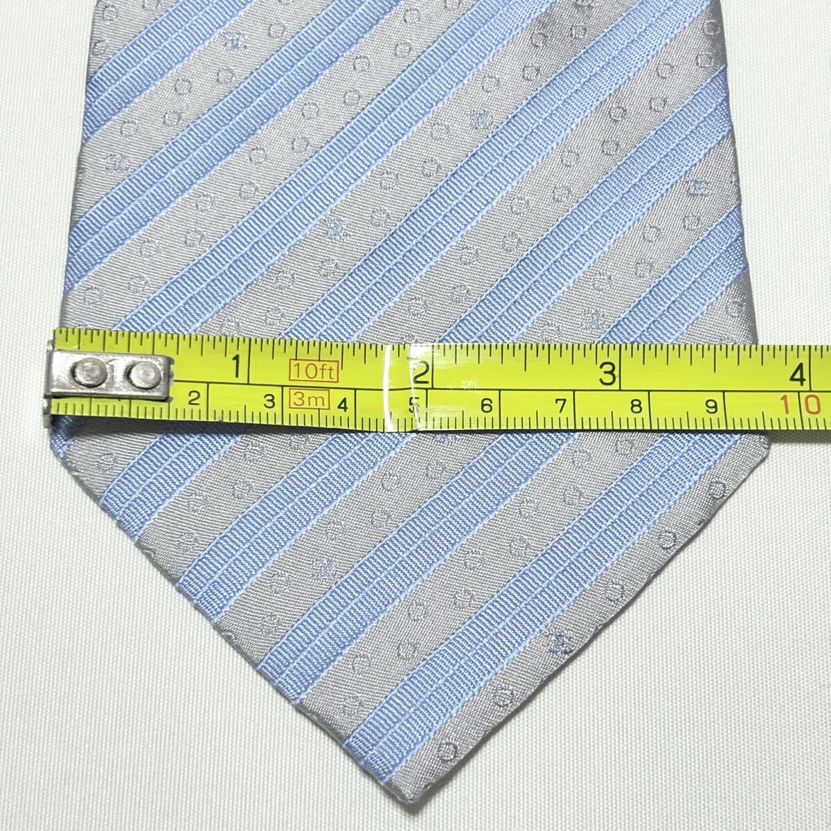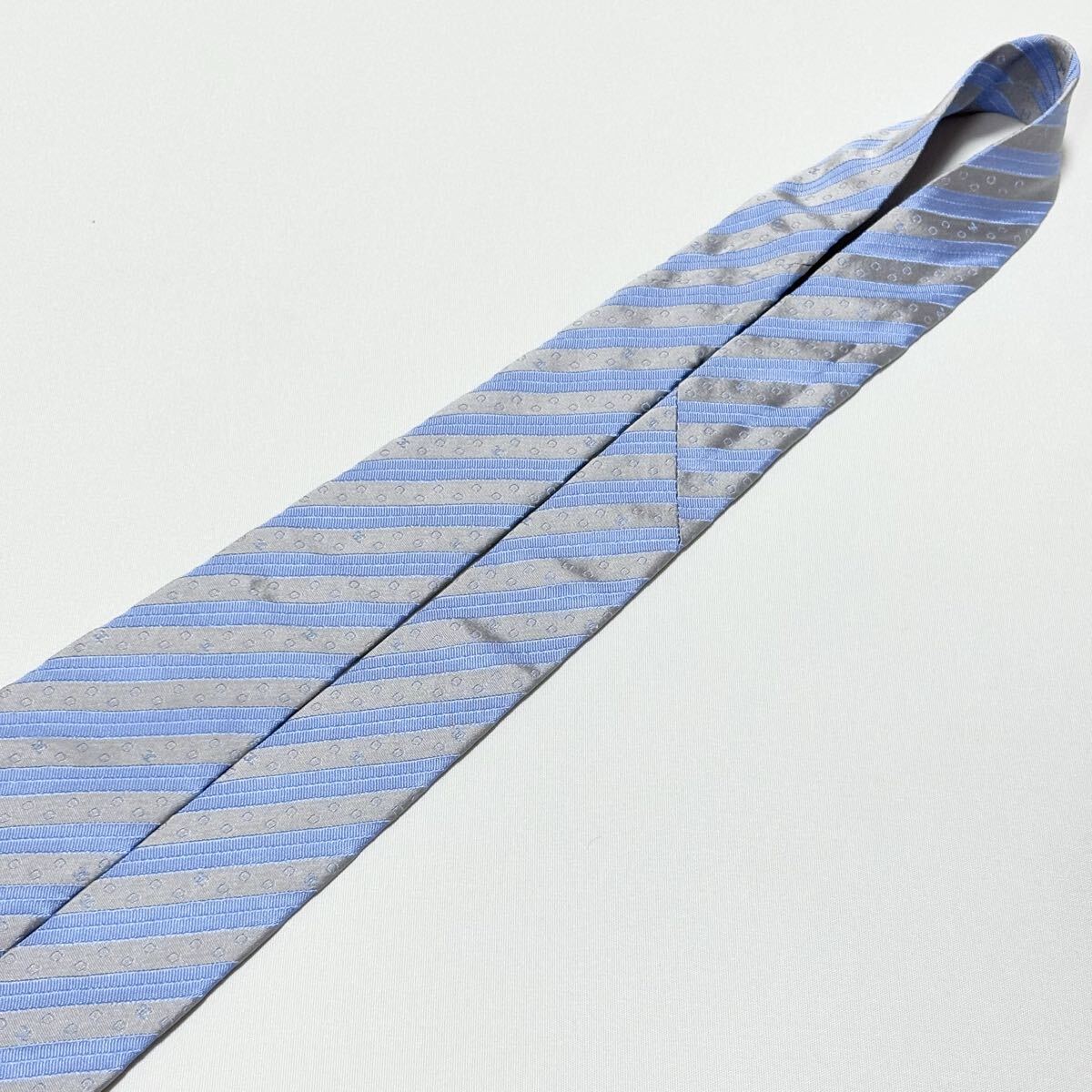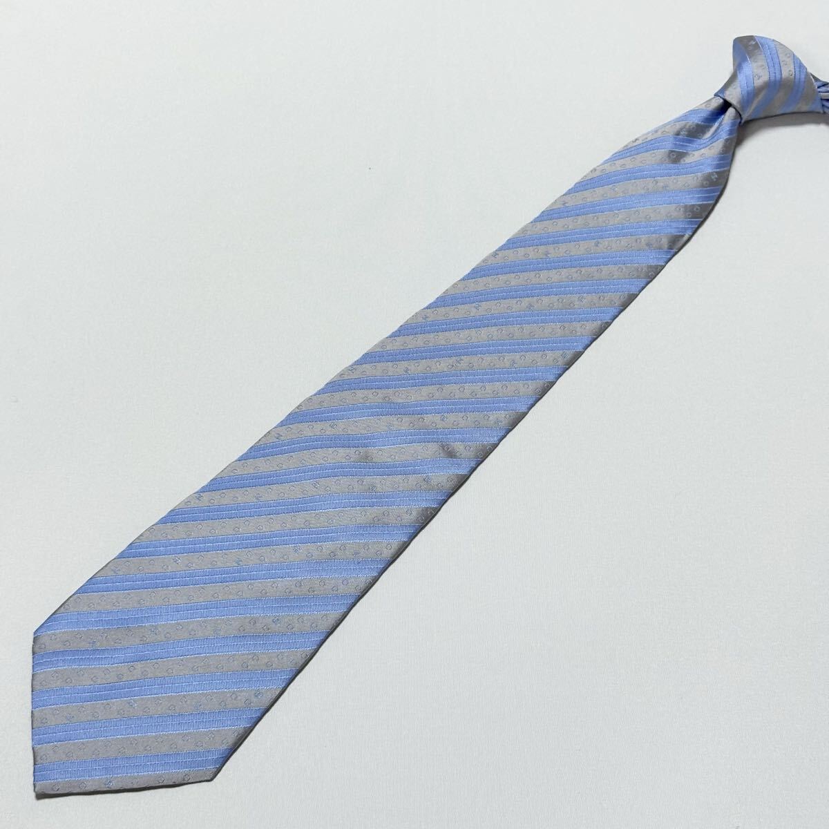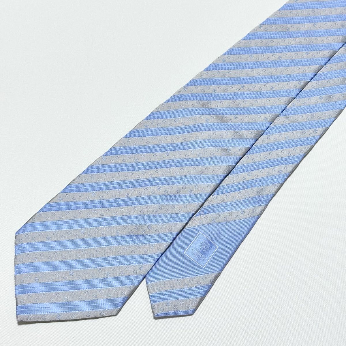 青とグレーのストライプにドット模様が施されたCHANELのフォーマルネクタイ。