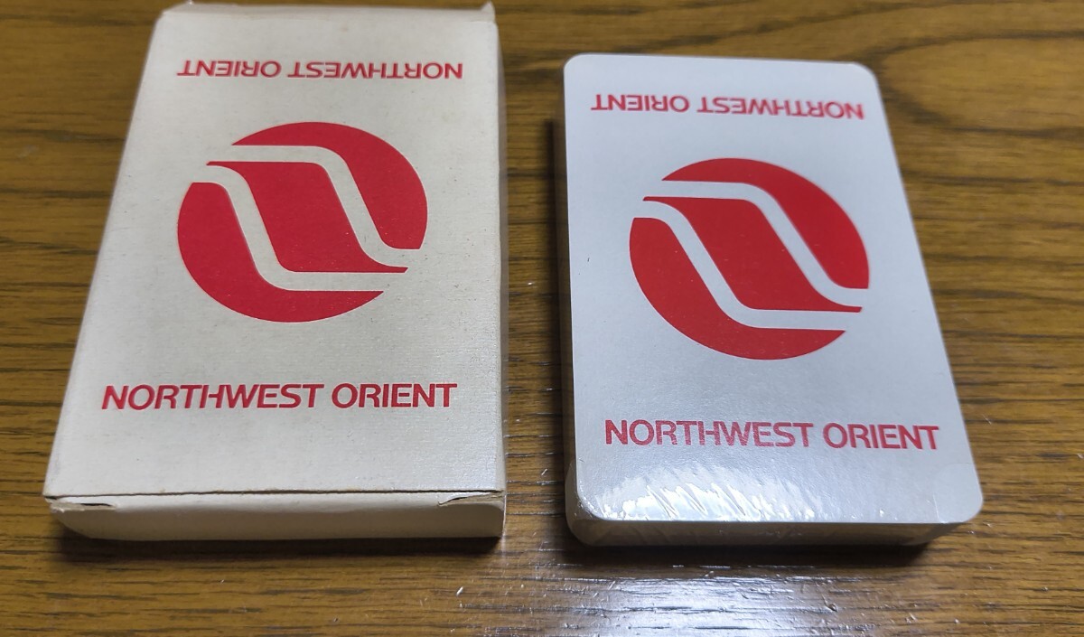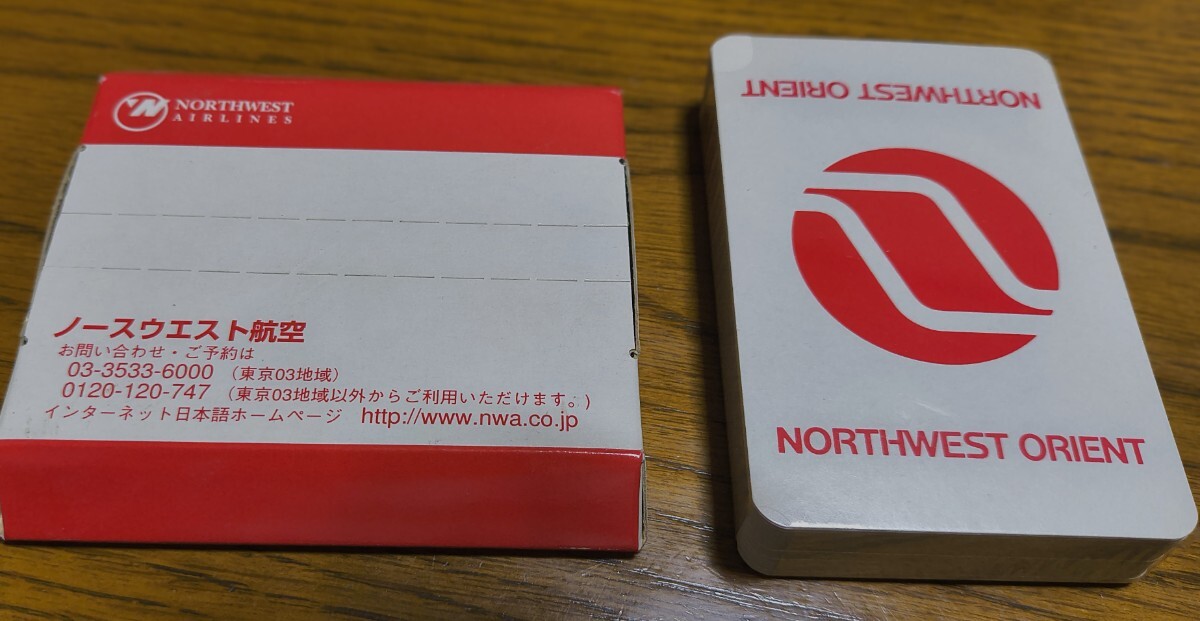 今は無きノースウェスト航空のトランプとメモ帳です。トランプはノースウェストオリエント航空時代 1986年に搭乗した時の物です。箱は開封しましたが中身のビニールは、未開封で箱の片側に染みがあります。メモ帳は未開封です。