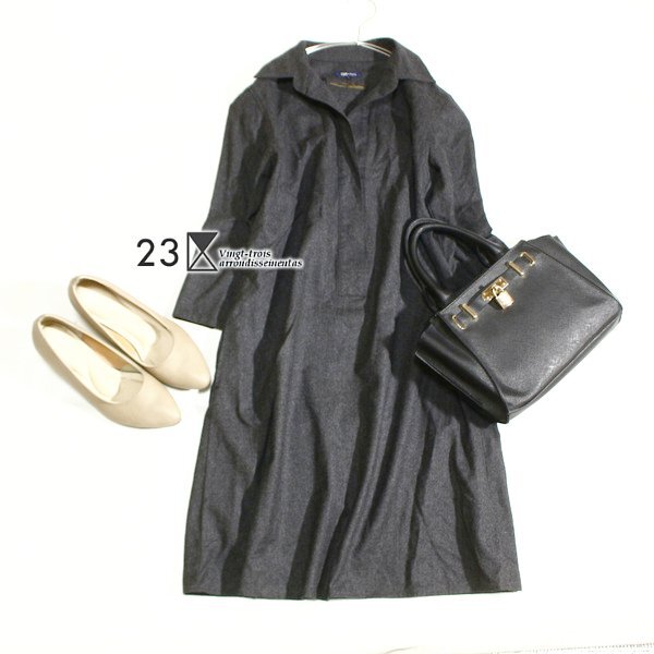 美品 オンワード樫山 23区 × RITA ウール100% 綺麗め 起毛スーツ生地 ワンピース 38号 M 秋 冬 25C11