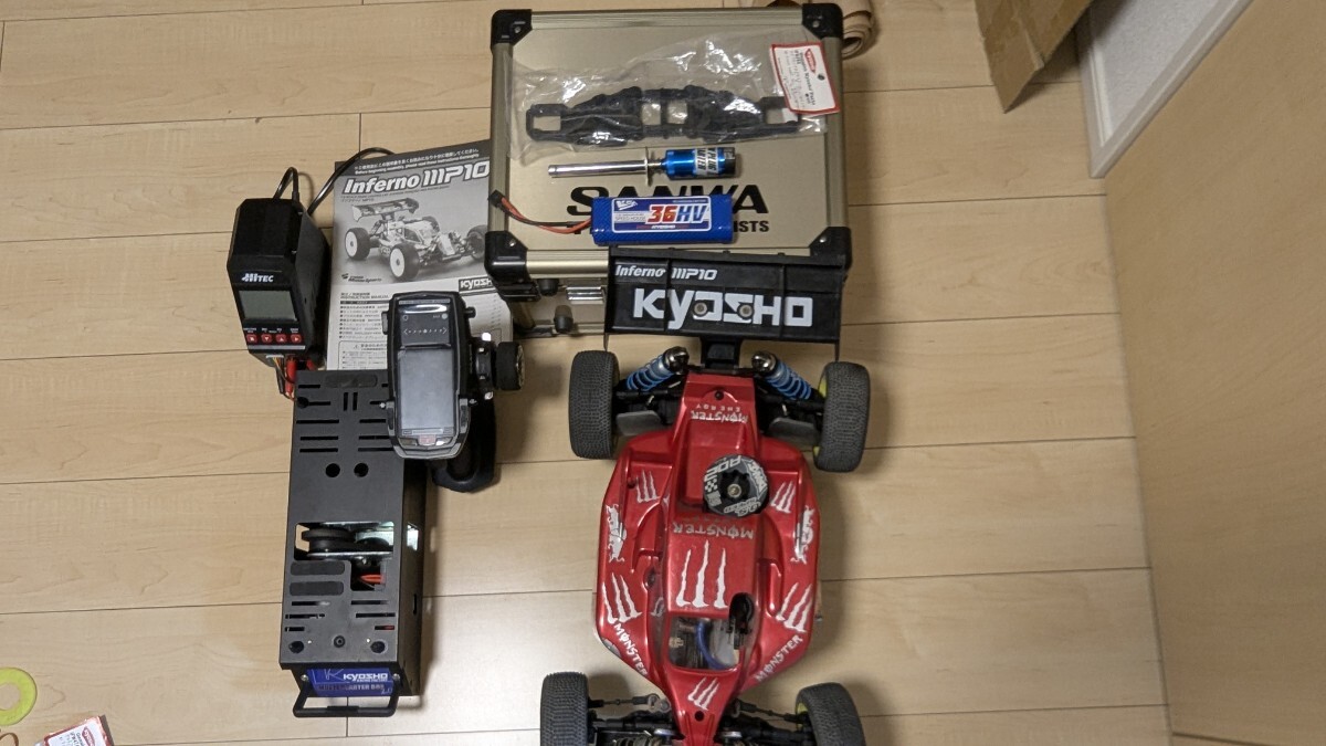 SANWAアルミケースほぼ新品です。室内保管。写真に写っているボディの他、カット済みクリアボディ、塗装済みボディおまけ程度お付けします。受信機バッテリー、その他のもあれば同梱致します。