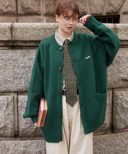 参考商品名:PENNEYS/ペニーズ 別注 THE FOX ロゴ ワッペン刺繍ワンポイント モヘアライクWジャガード編み クルーネックルーズニットカーディガン