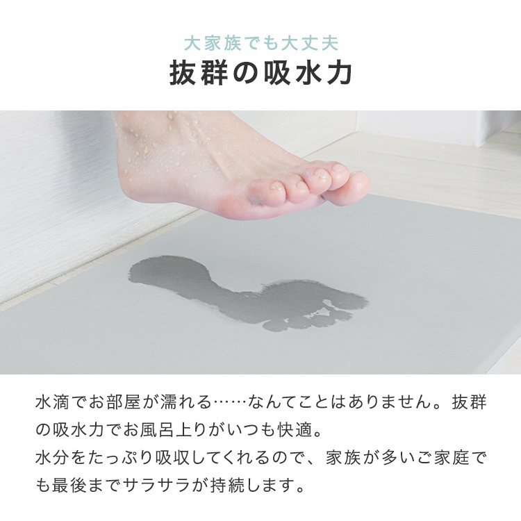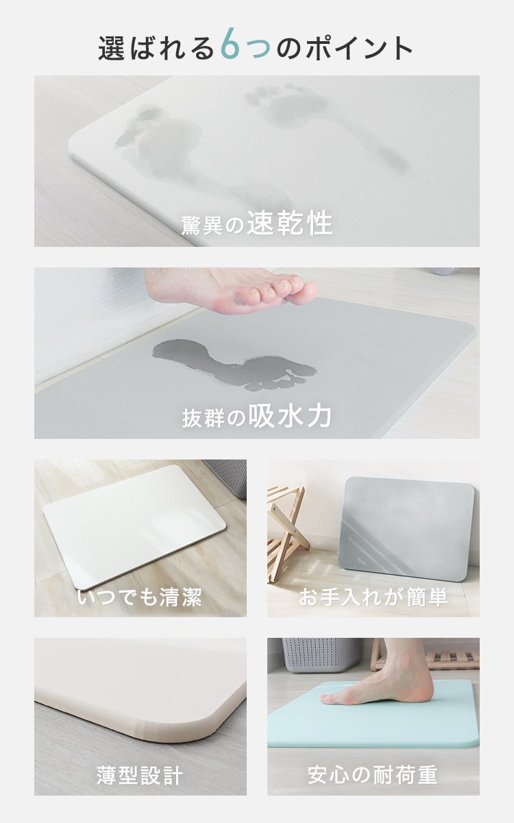 踏んだ瞬間から乾く! 珪藻土バスマットです。 珪藻土の持つ優れた吸水性で、湯上りの濡れた足の裏の水分をすばやく吸い取ってくれます。 カビや嫌な匂いが発生しにくい。 影干ししておくだけで、カビの発生が防げる特徴があり衛生的で手間要らず!! お手入れに手間がかかりません! 軽い!薄い、丈夫!! 女性でも片手で持てる軽さが魅力です♪ 【商品仕様】 ・カラー:ピンク ・サイズ:(約)幅60cm×奥行39cm×厚さ0.9cm ・重量:(約)1.8kg ・素材:珪藻土、植物繊維 他 【注意事項】 ・浴槽内には持ち込まないで下さい。 ・素材の劣化につながりますので、長時間水に浸さないで下さい。 ・自然乾燥しますので、毎回乾かす必要はありませんが カビ発生の防止効果のため、時々風通しのよい場所で陰干しをして下さい。 ・割れ、反りの原因となりますので、天日乾燥は避けて下さい。 ・珪藻土が成分の為、素材の特性上、表面上にムラ・軽微なキズなど 茶色や黒の斑点がある場合がございますが品質上問題はございませんのでご了承下さい。 ・材質の特性上、厚みに多少の誤差がある場合がございます。あらかじめご了承ください。 ・海外からの輸入製品となりますので、製造、または配送の過程において生じた 細かなキズやへこみが見られる場合がございますが 機能性や品質上に問題はないため、返品や交換の対象とはなりません。 予めご了承の上、ご購入をお願いいたします。 ・商品は、モニターによって色合いが異なって見える場合があります。 ・仕様、デザインは改良のため予告なく変更することがあります。 |