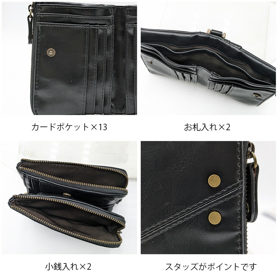 | 商品説明 | 全体にステッチやスタッズを綺麗に配置することでシンプルさを損なわない二つ折り財布 |