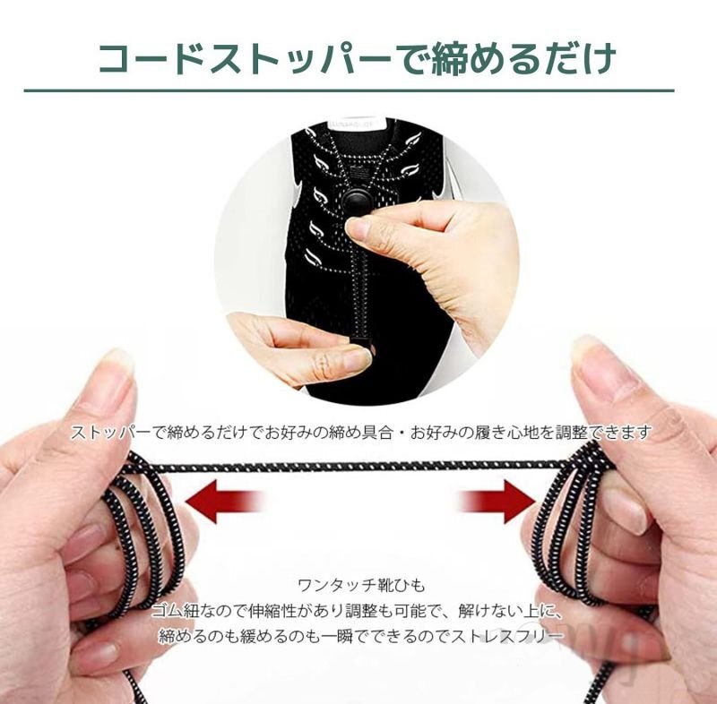 ワンタッチ靴ひも:紐も伸縮性があり調整も可能で、解けない上に、締めるのも緩めるのも一瞬でできるのでストレスフリーです。頻繁に靴を着脱する場合に。靴ひもが結ぶのが苦手な方にも適しています。