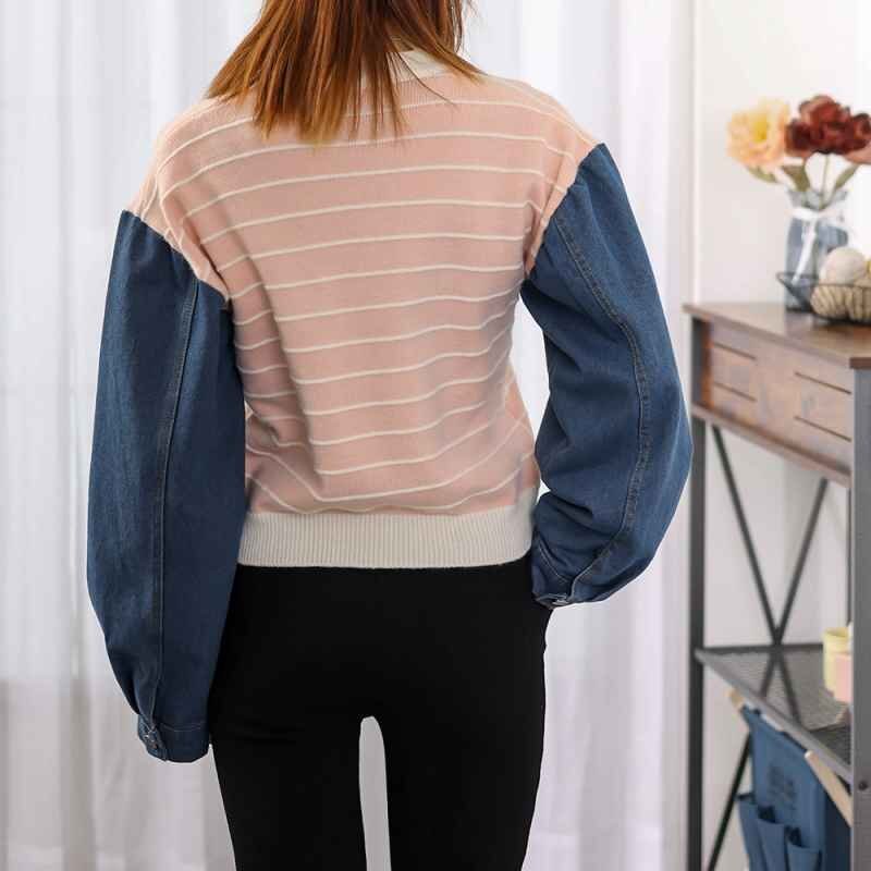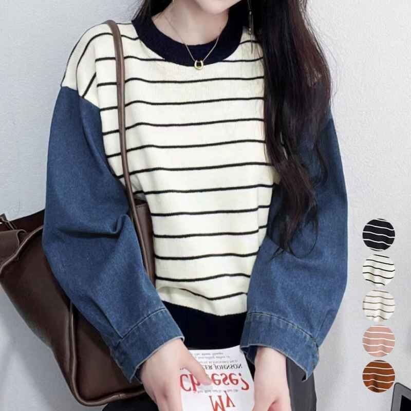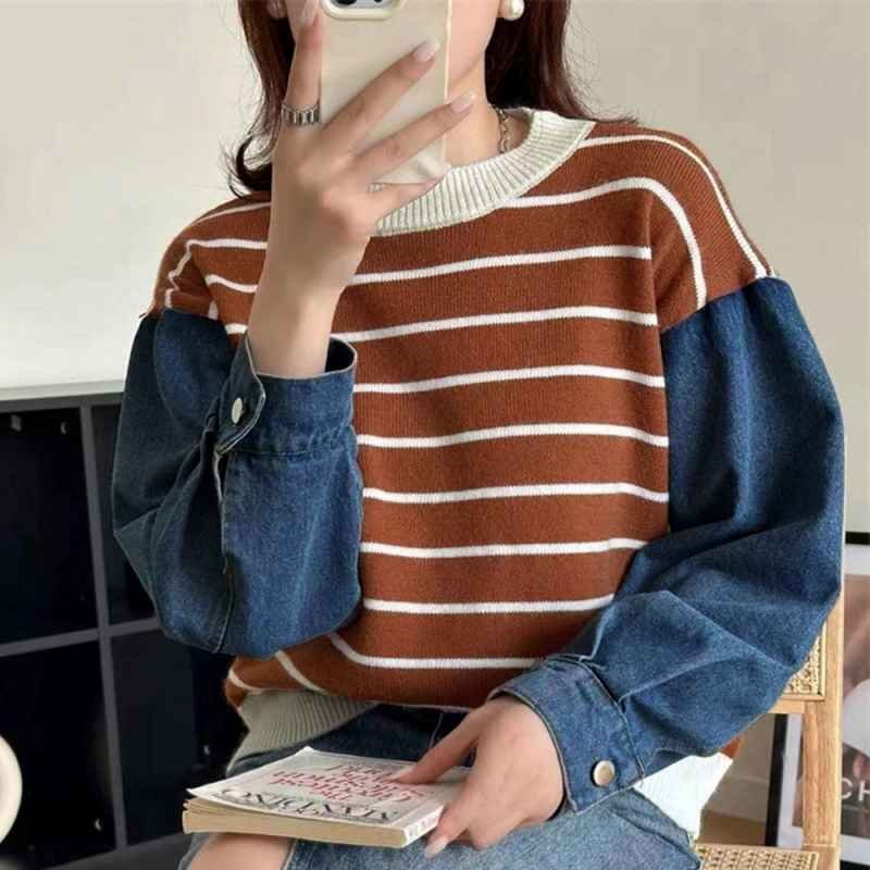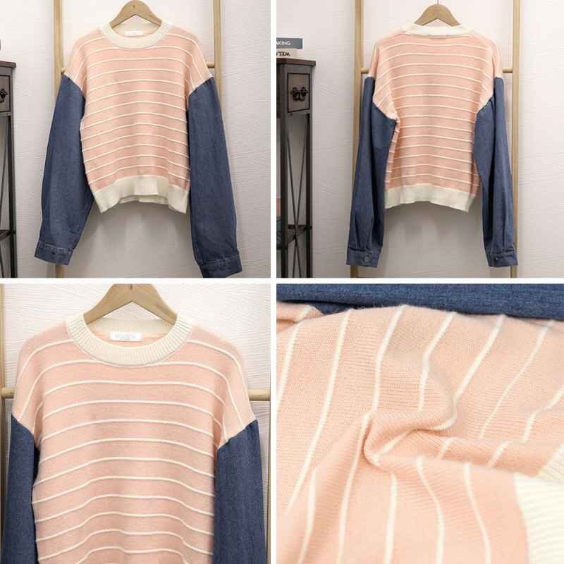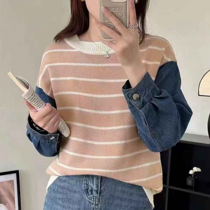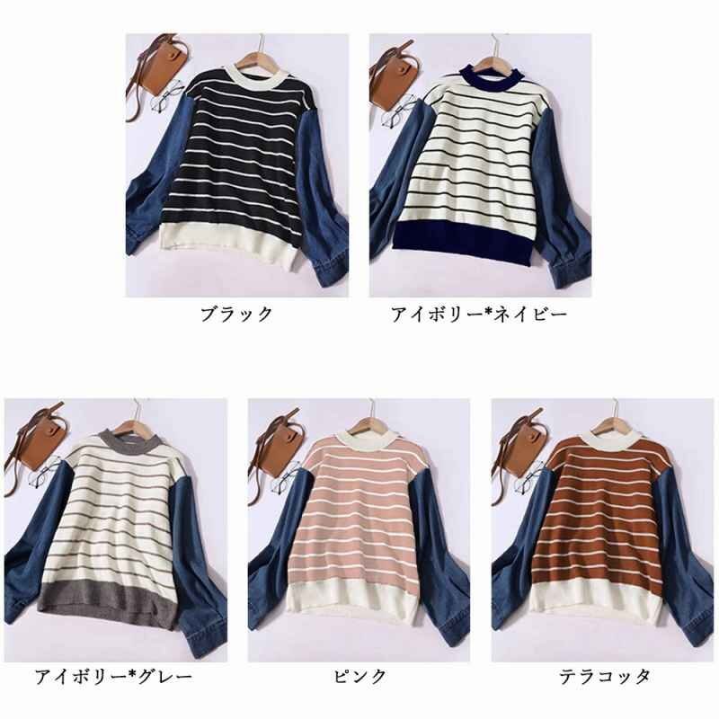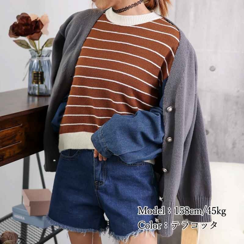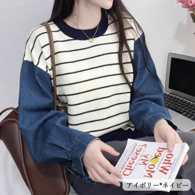 ボーダーニットとデニムシャツを重ね着したようなデザイン、着膨れせず着やせするレイヤード風トップスです。