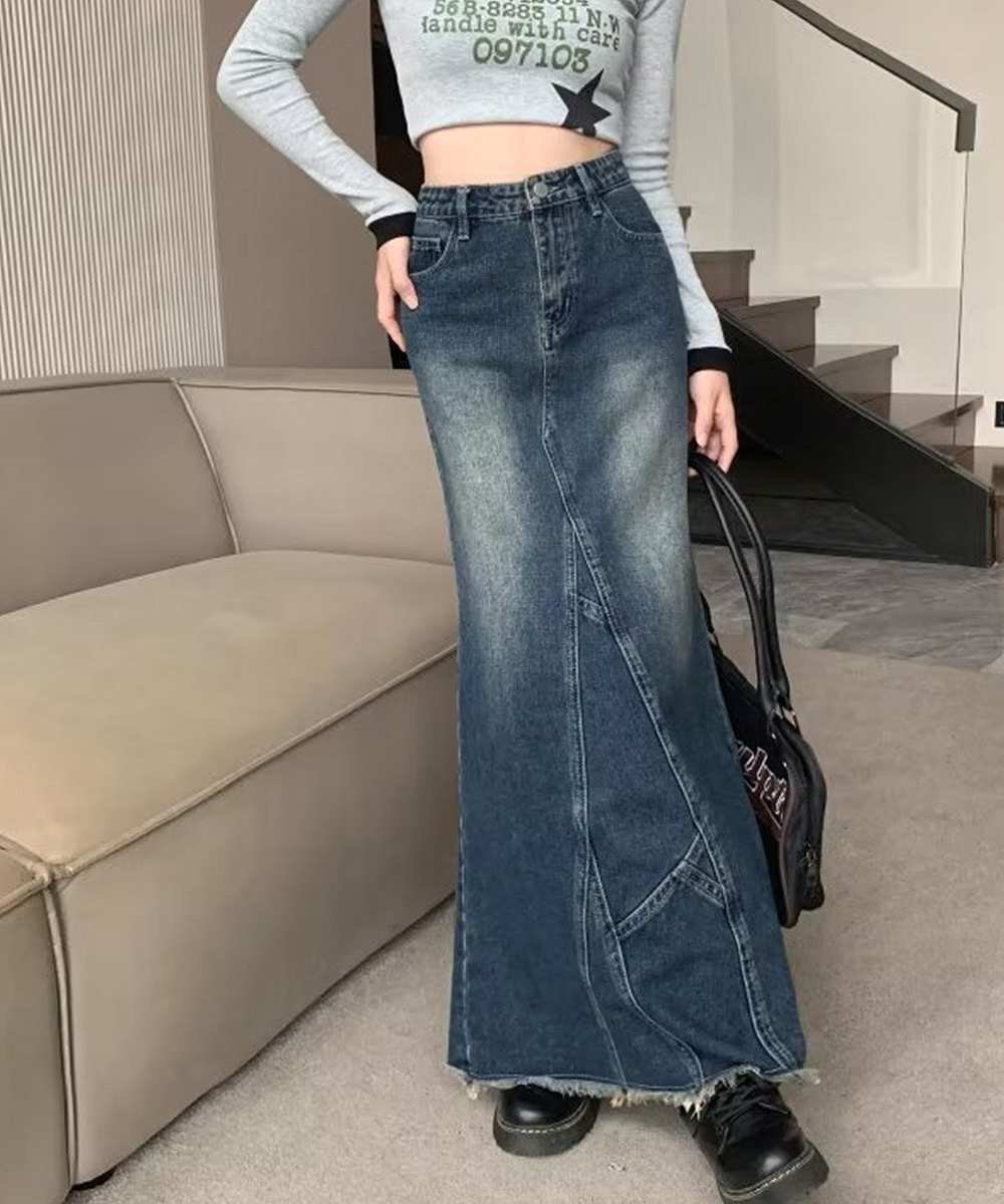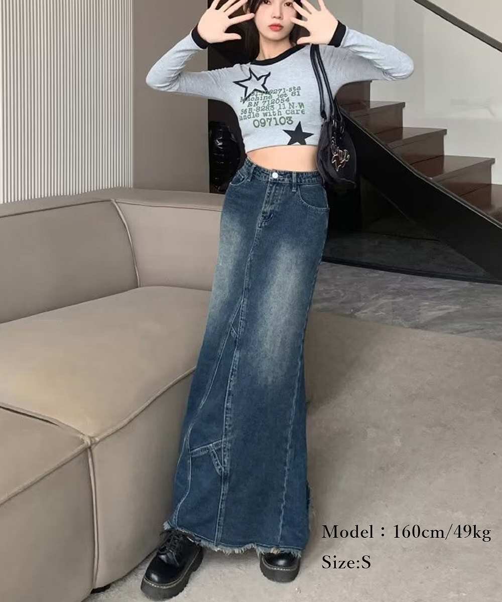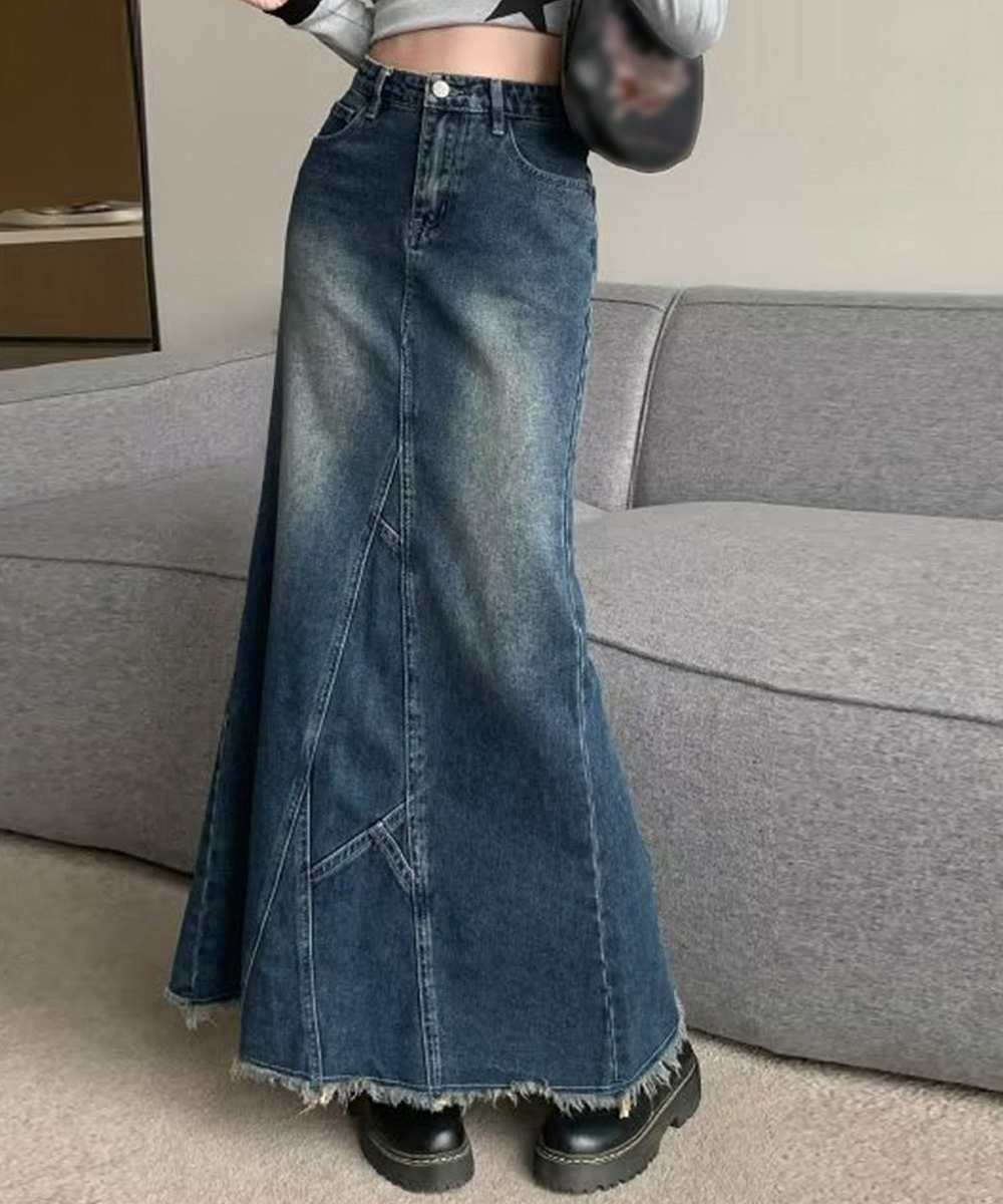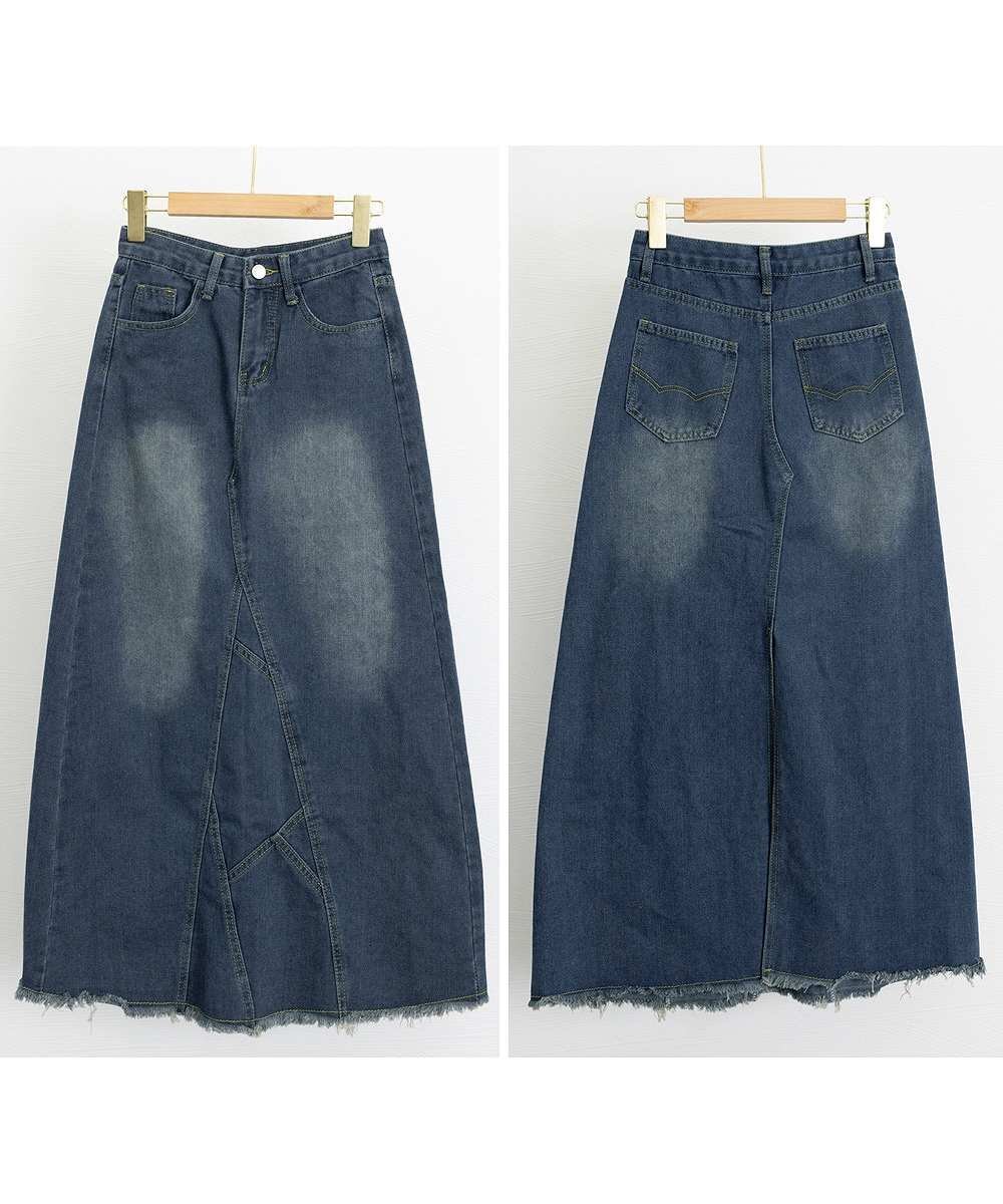 裾のフリンジ加工や切り替えなど細かなディティールにもこだわったデニムロングスカートです。