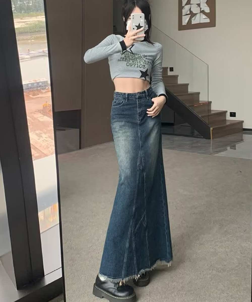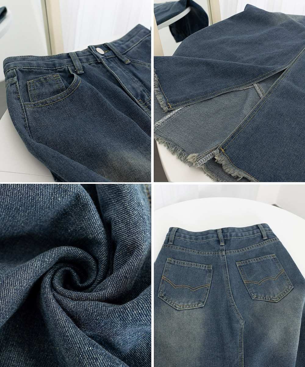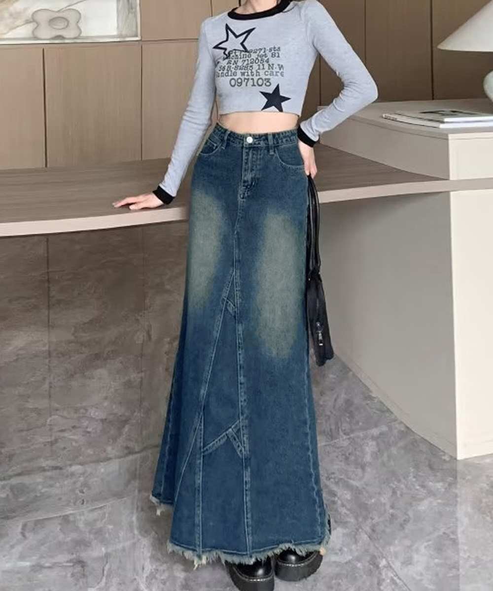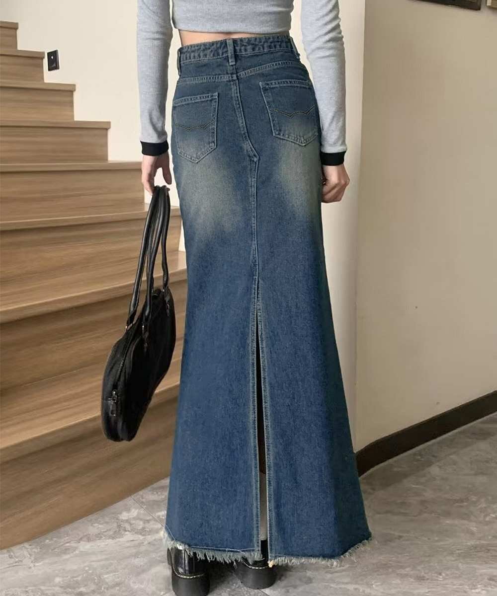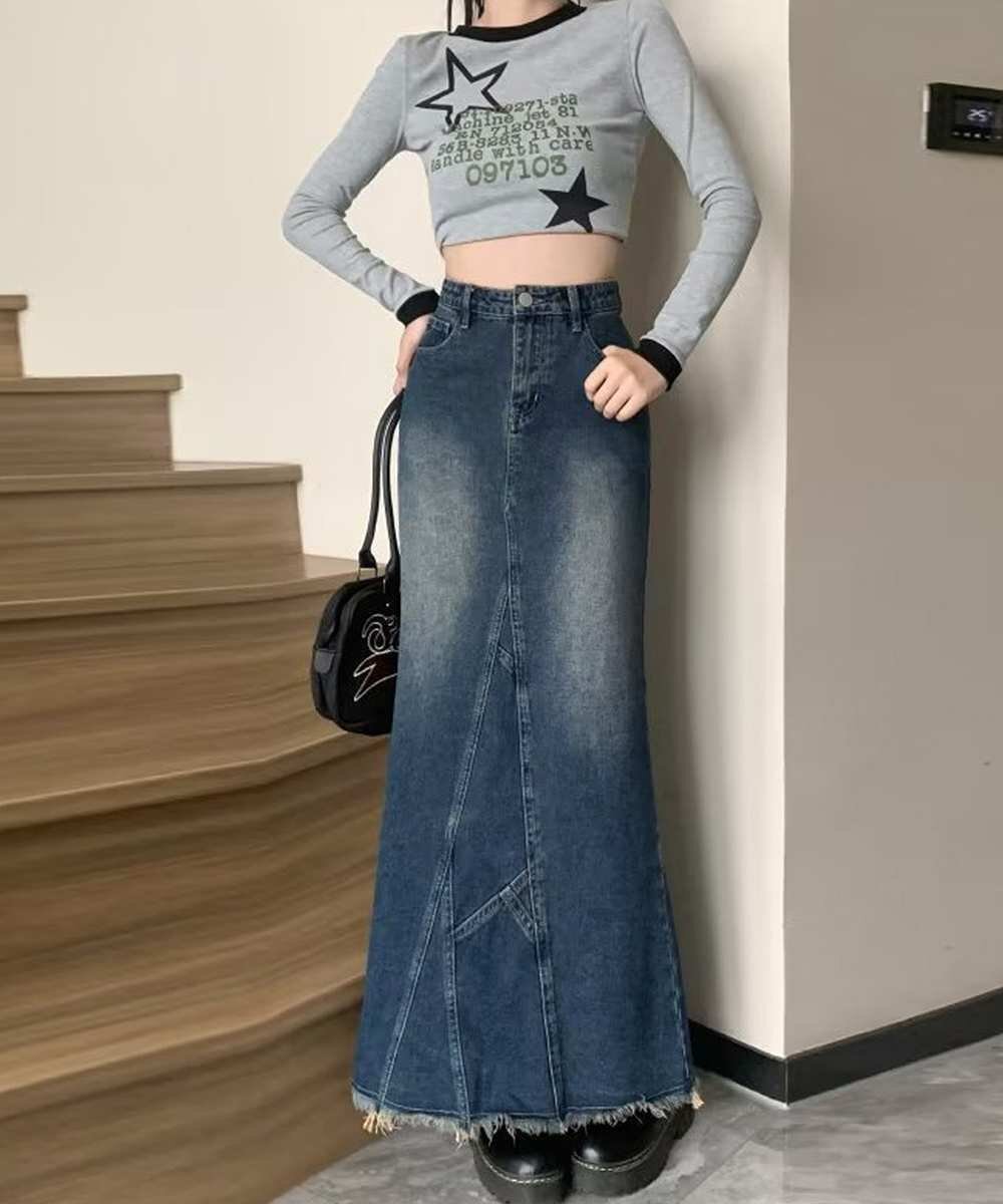 裾のフリンジ加工や切り替えなど細かなディティールにもこだわったデニムロングスカートです。