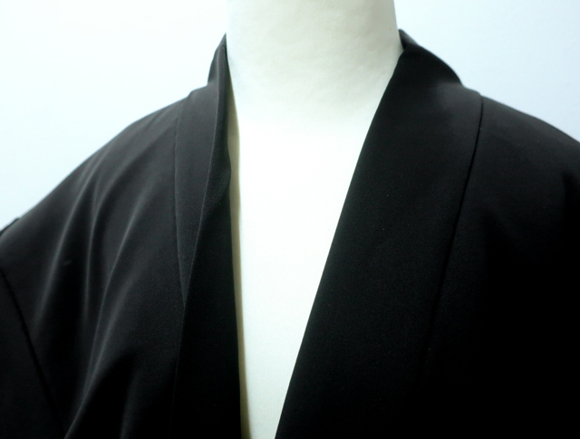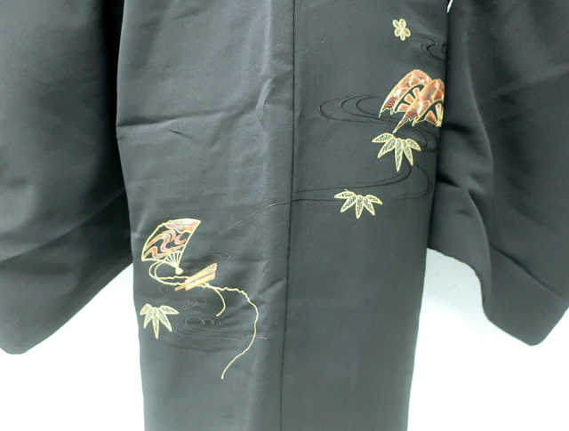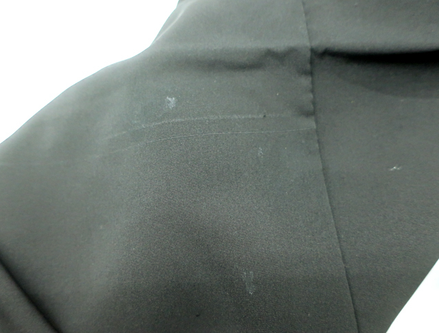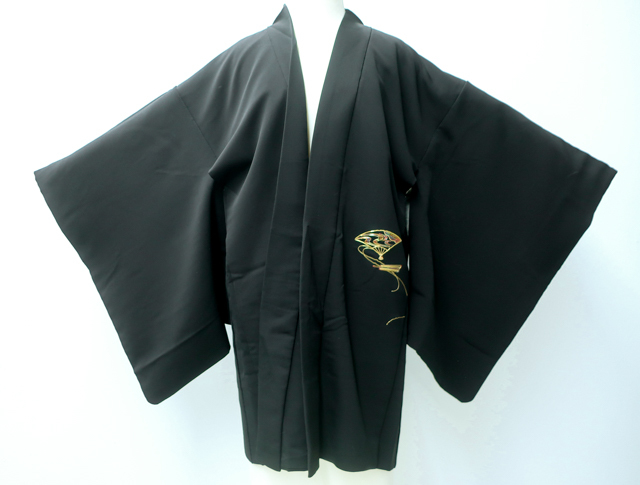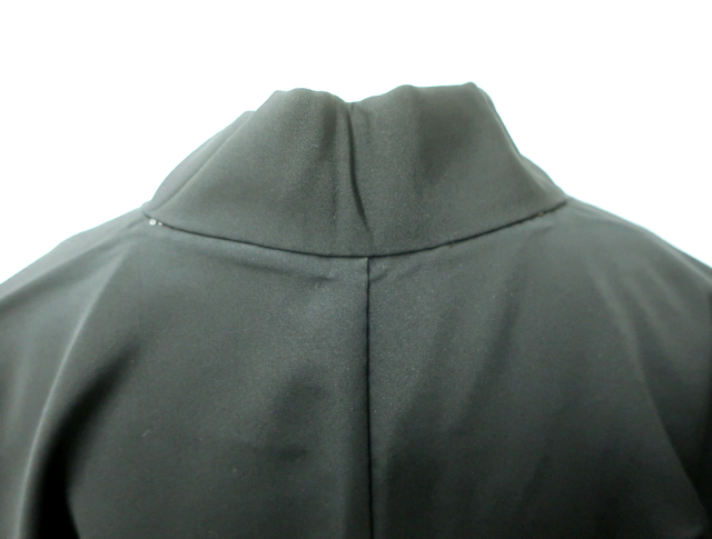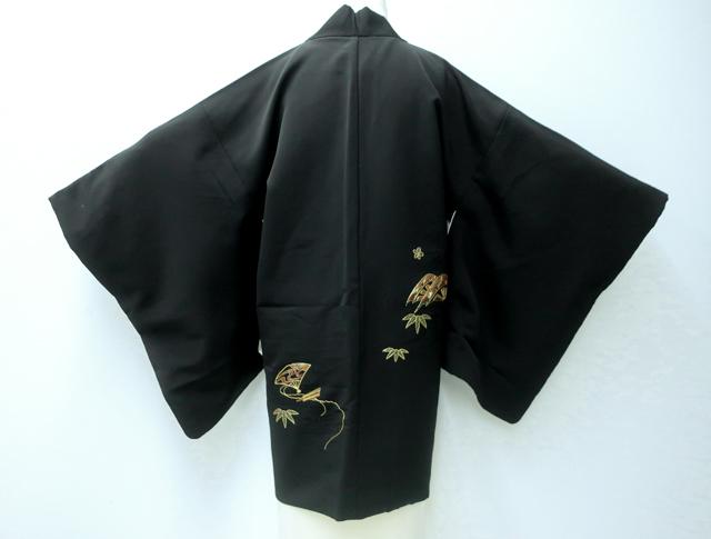 リサイクル商品のため、左右胸辺りや両袖に薄汚れ、衿裏に汚れがございますが着用可能なお品です。 地色は、黒色です。 1枚目の画像が近いお色かと思われます。 素材は正絹です。 |