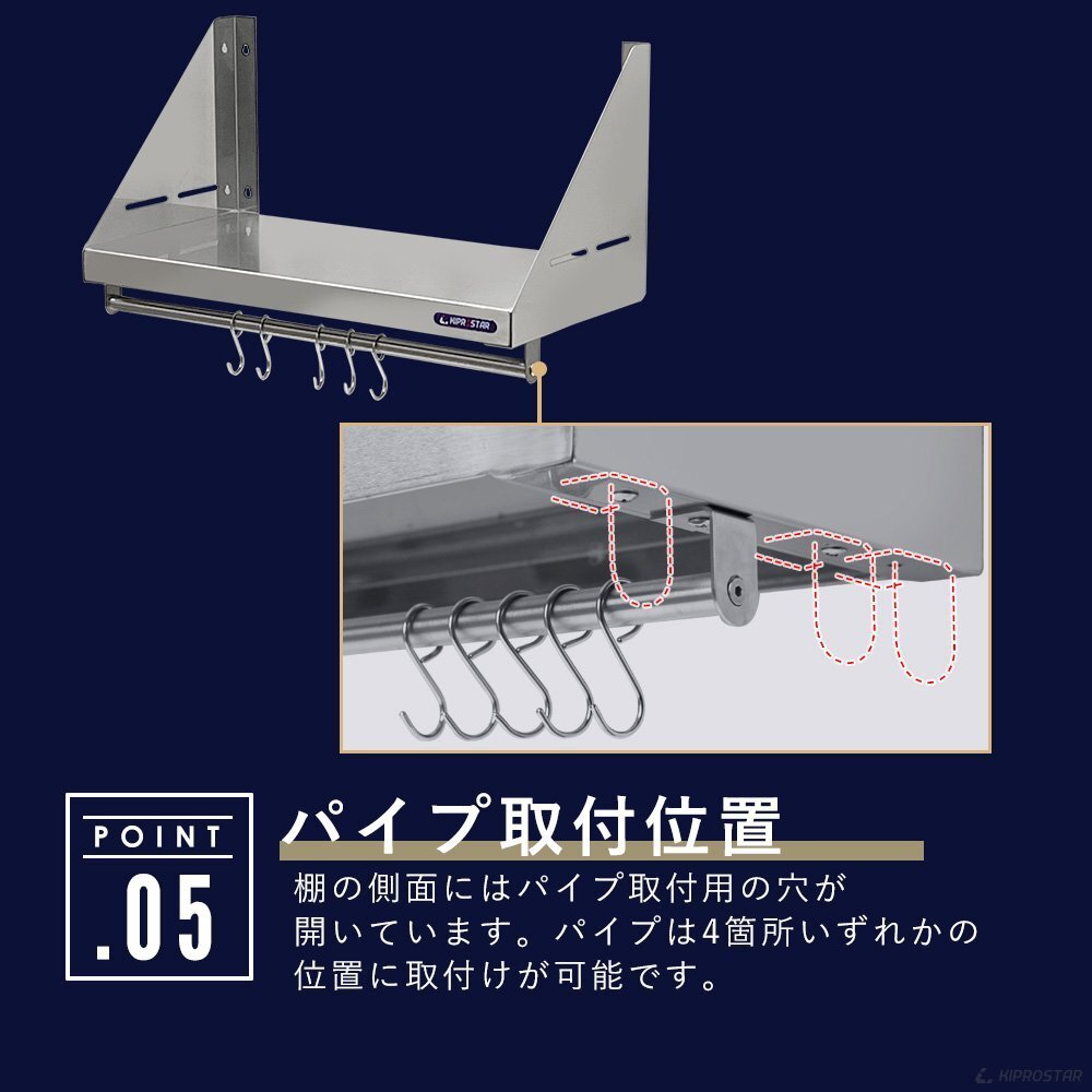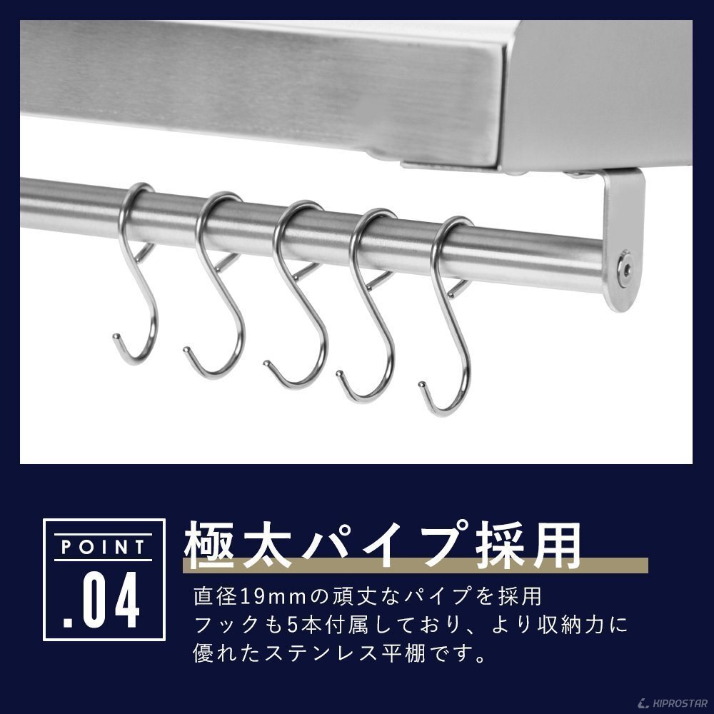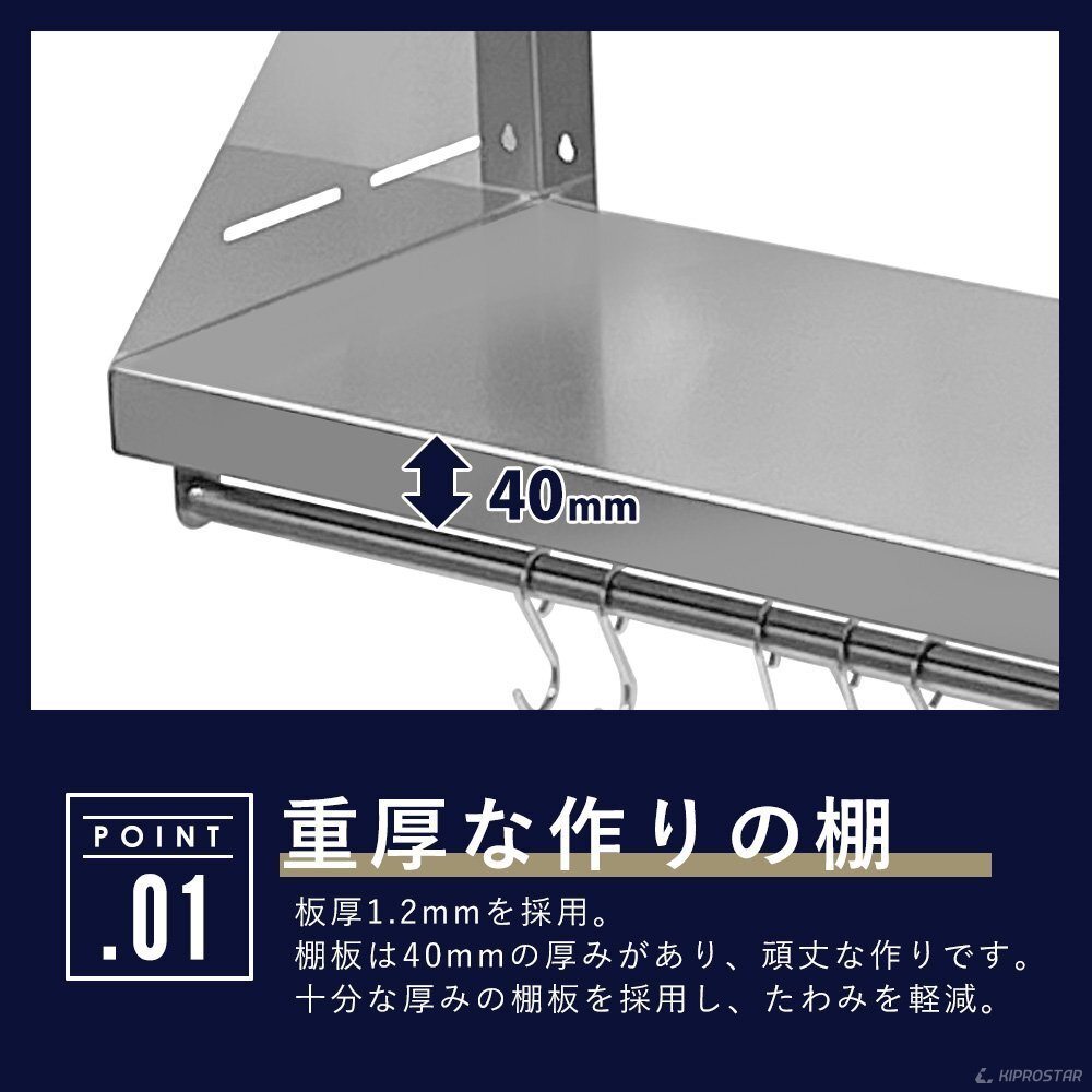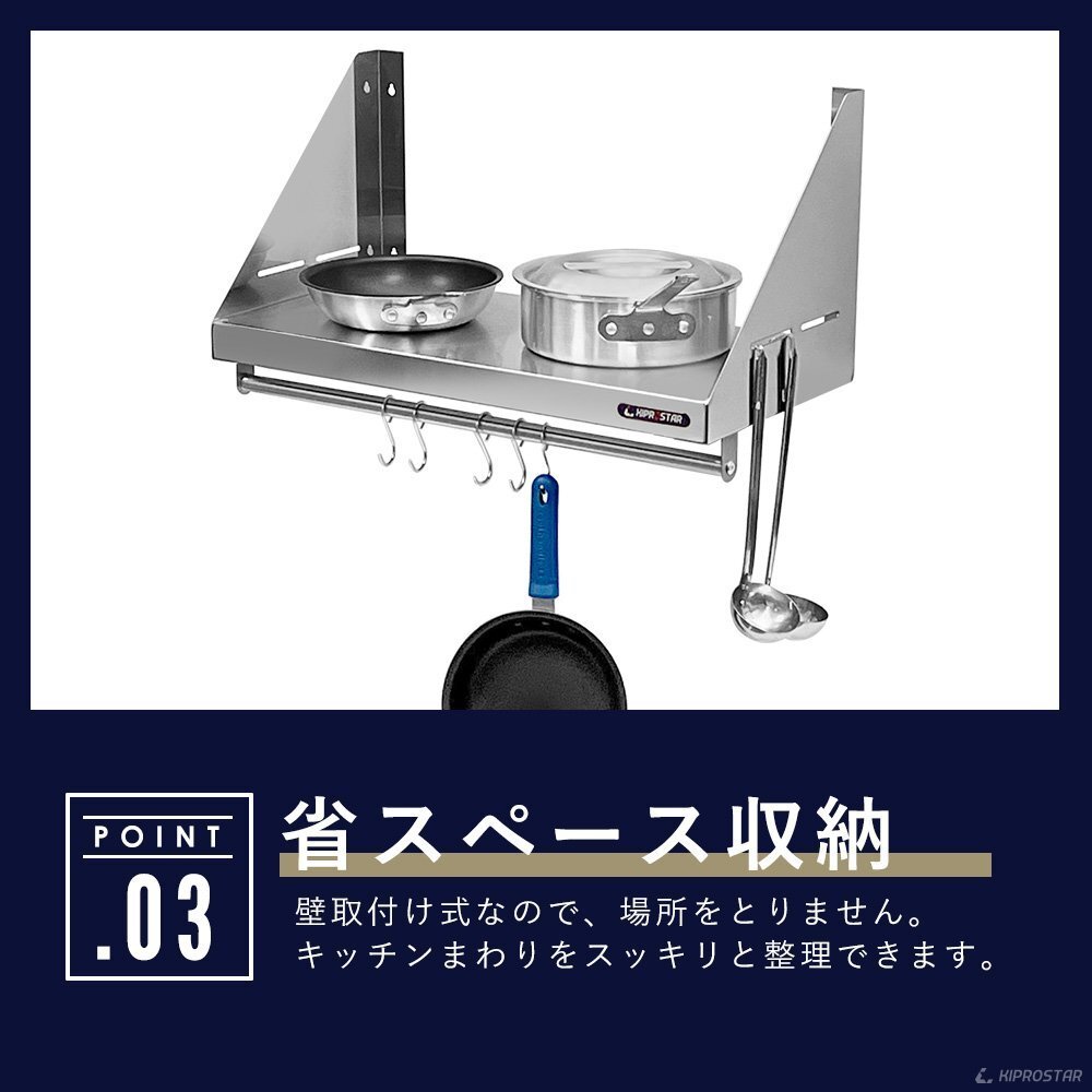 | 特長 | 調理道具などの吊り下げ、引っ掛けに便利なフックとパイプが付属した 便利な平棚です。 飲食店の厨房はもちろん、工場やご家庭のキッチン、ガレージなど 様々な場所でご使用頂けます。 業務用の食器や鍋、フライパン調理器具といったキッチン用品の整理整頓に 最適な業務用ステンレス吊り棚は腐食に強いステンレス製を採用しました。 調理場 や 厨房 の 収納 に ステンレス製 の吊棚は欠かせないアイテムの1つで 特に飲食店では狭い厨房をいかに広くスペースを確保できるかは 重要なポイントになります。 また縦の収納を増やすことにより仕事の動線もスムーズになり、 効率も上がり時間短縮にもなります。 |