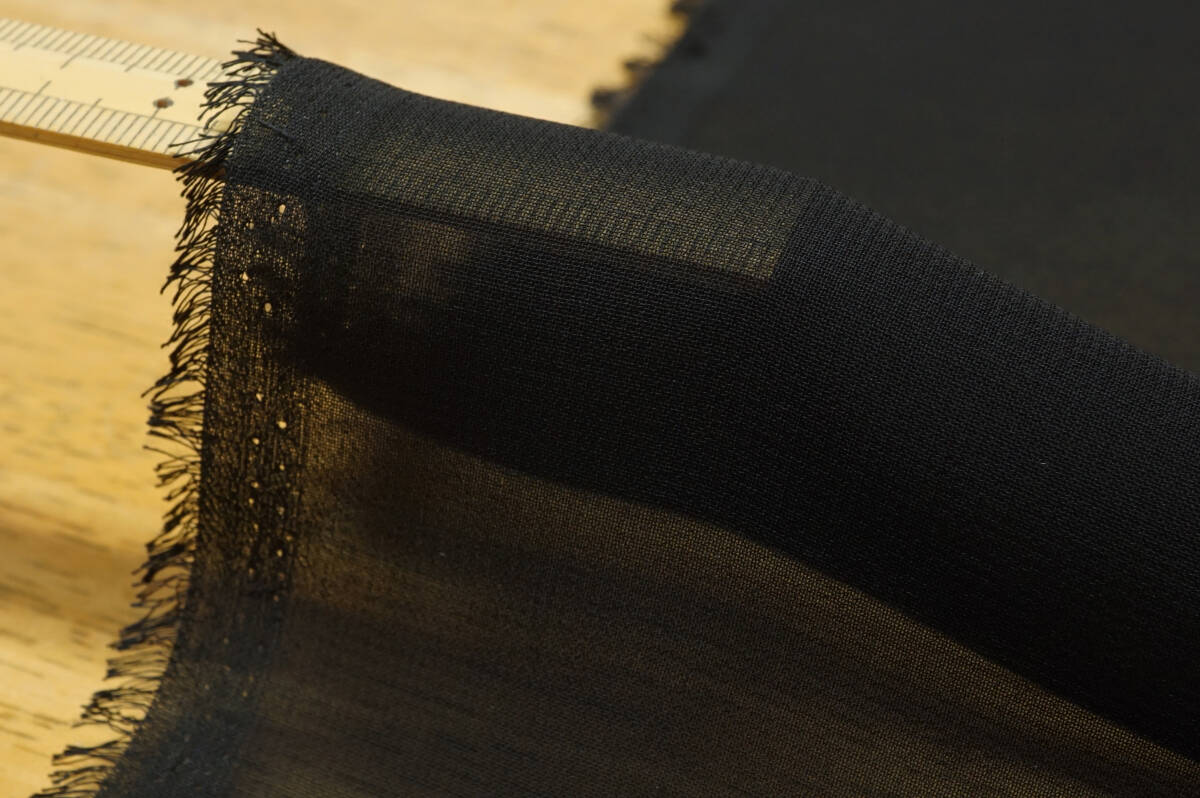 ポリエステル100%、薄地~微薄、ソフトな風合い、強透過、色調:ブラックでございます。