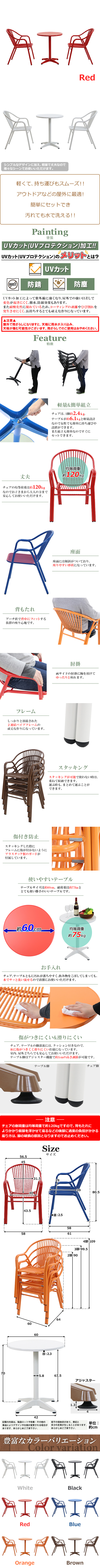 | 商品紹介 | ※こちらのページの商品のカラーはレッドとなります。 ●ガーデンチェアは、スタッキング構造なので重ねる事が可能なので、収納やまとめて運ぶ際にも大変便利です。 ●スタッキング時に傷付きを防止するガード付き。 ●テーブルは、簡単な組み立て式になります。チェアは、完成品です。 ●チェアは1脚約2.4kg、テーブルは約6.1kgと軽量なので、女性でも軽々持ち運べます。 ●座面には傾斜がついており、座りやすい形状になっています。 ●背中にフィットするアーチ状の背もたれは抜群の座り心地です。 ●両サイドにある肘掛に腕を預けて、ゆったりと座れます。 ●しっかりと溶接された2連結パイプフレームの頑丈な作りになっています。 ●天板サイズ約60cmの使い勝手のいいテーブルです。 ●汚れが落ちやすく水でサッと洗い流せます。 ●脚裏にはクッションがついているので床を傷つけにくい仕様になっています。 ●テーブル脚はアジャスター機能で約1cmの高さ調節が可能です。 ●材質は、軽量、安全のアルミ製です。 ●耐酸化性に優れているため、コーティングの剥離やひび割れを発生させにくくなっています。 ●UVカット(UVプロテクション)加工によって屋外での強い日差しで変色しにくくなっています。 ●防錆、防塵性に優れています。 注意! 背もたれによりかかり前脚を浮かせて座るなどの後脚に過度の負担がかかる座り方は脚の破損の原因となりますのでお止めください。 ※テーブルは組立て式です。組立てには14mmのスパナが必要です。お客様でご用意下さい。 ■重量(チェア):約2.4kg(1脚あたり) ■耐荷重(チェア):約120kg(1脚あたり) ■重量(テーブル):約6.1kg ■耐荷重(テーブル):約75kg ■材質:アルミ(テーブル、チェア)、プラスチック(脚裏) ▲注意▲ 屋外で雨ざらしになりますと、天板に雨水が入り込み、天板が傷む可能性がございます。雨ざらしでのご使用はおやめください。 ●新品商品ではありますが、輸入商品の為、多少の擦り傷などがある場合がございますので、ご納得の上ご購入下さいませ。 ●ご購入後、お客様ご都合によるご返品、ご返金等は一切お受け致しておりません。 ●本商品を使用した際に発生したトラブル、事故につきまして、当社は一切の責任を負いません。ご使用に関しましては、全て自己責任にてお願い致します。 |