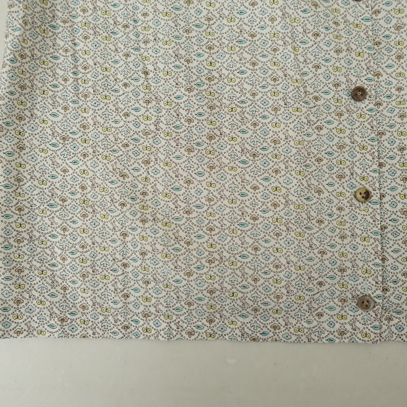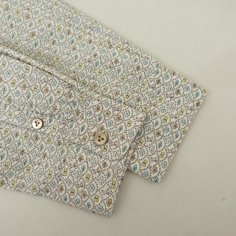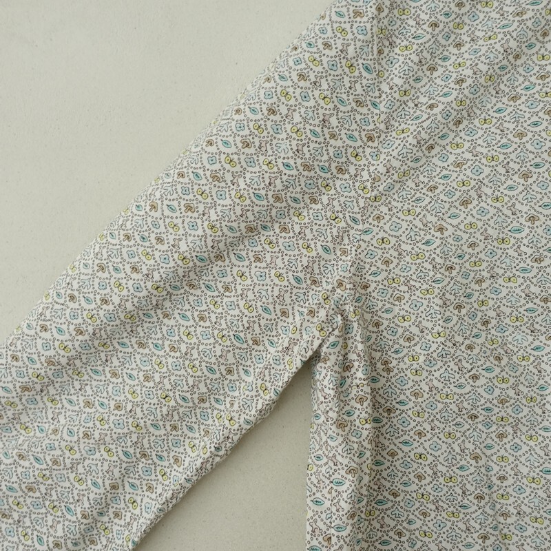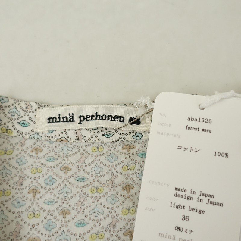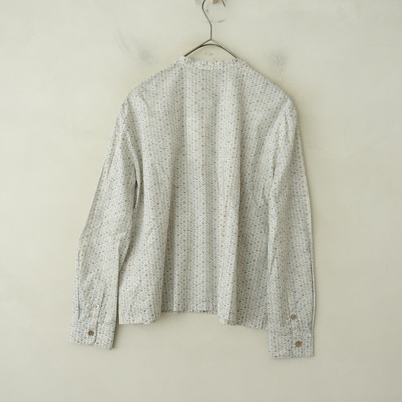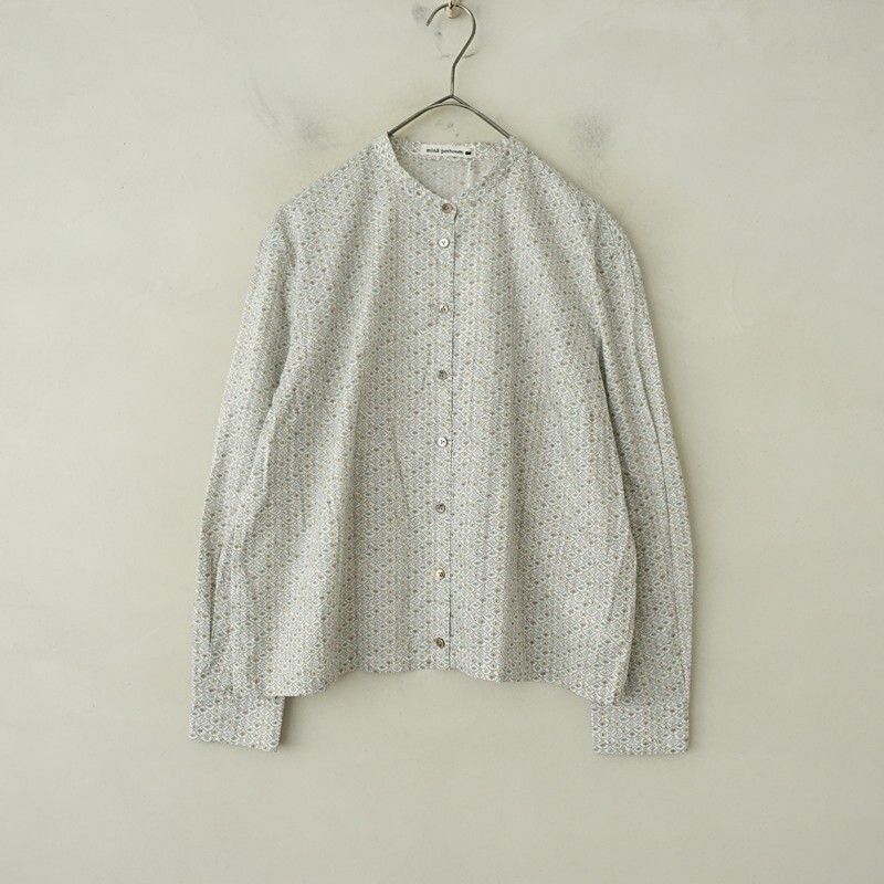 | mina perhonenのforest wave コットンプリントバンドカラーシャツです。カラーはホワイトベースにサックス・イエロー・ライトグリーン等の総柄プリントがあしらわれております。バンドカラーデザインで、フロントボタン開閉で着脱できます。定価(メーカー希望小売価格)36,300円 税込みの商品です。 |