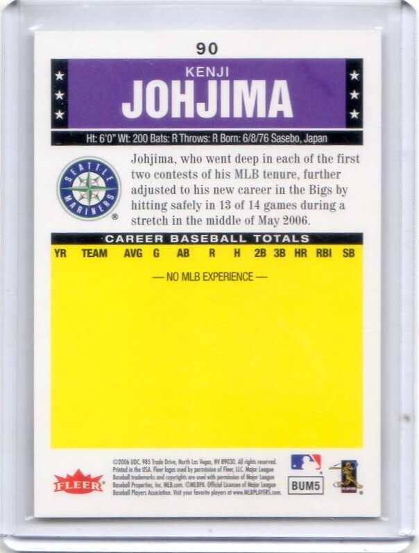 ROOKIE CARD 城島健司 MLBルーキー・カード ----------------------------------------------------------- ■城島健司 MLB成績 4年 2006-09年 マリナーズ 462試合 431安打 48本塁打 打率.268 2006年 144試合 18本塁打 打率.291 城島ファンの方、是非どうぞ! |