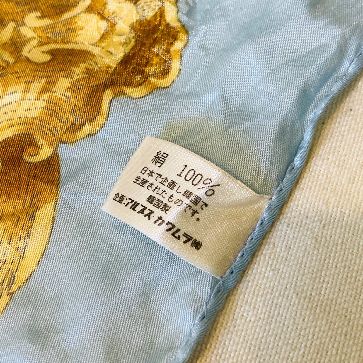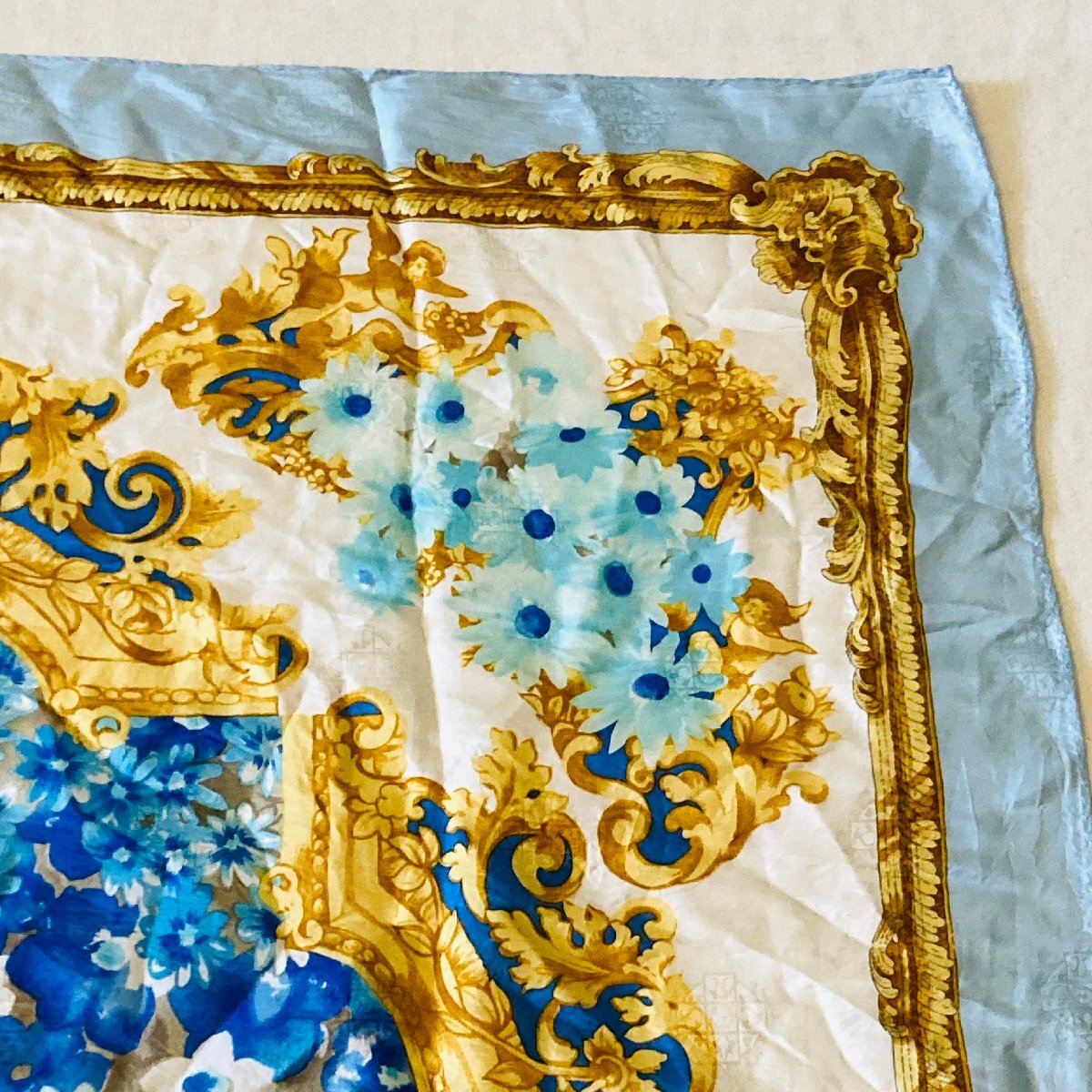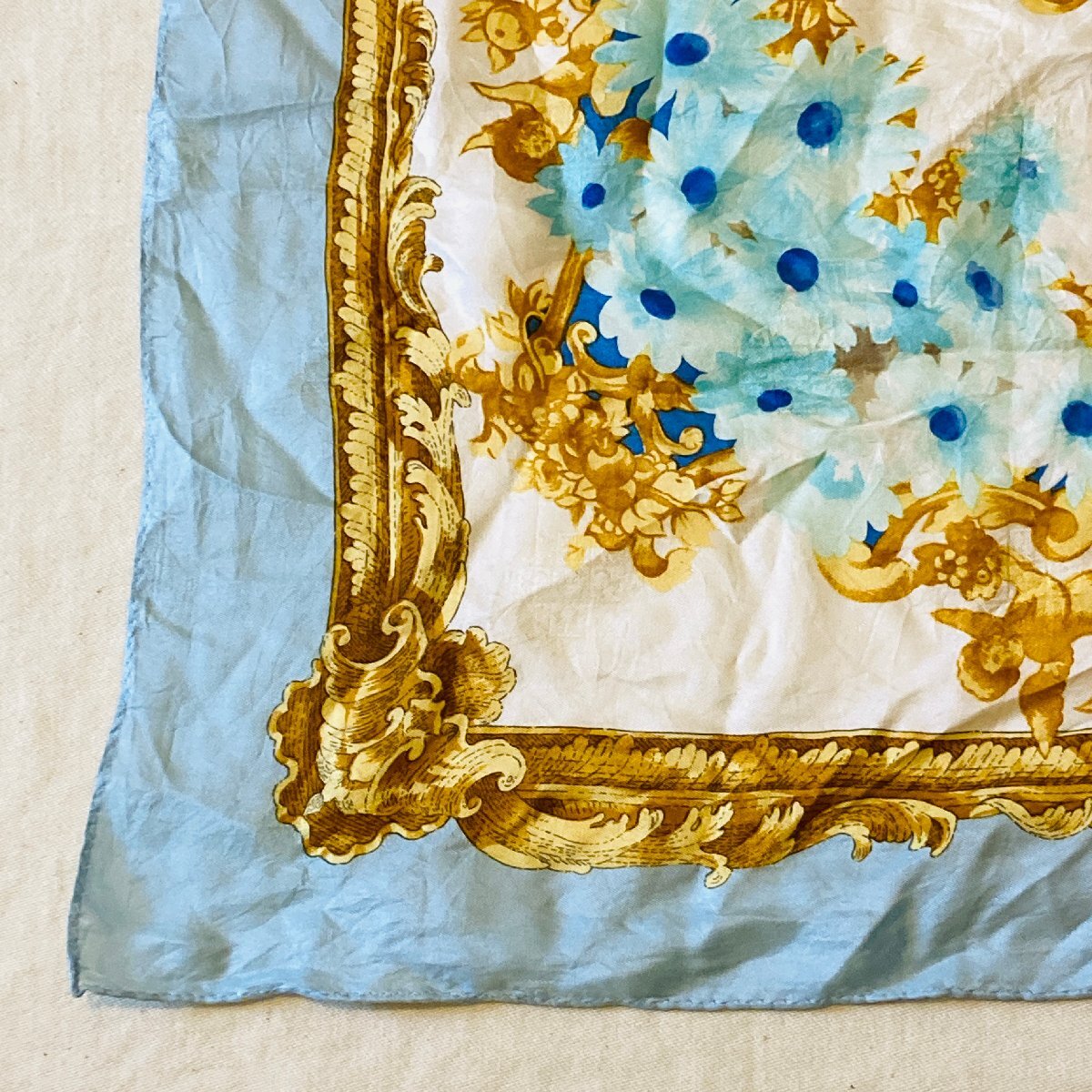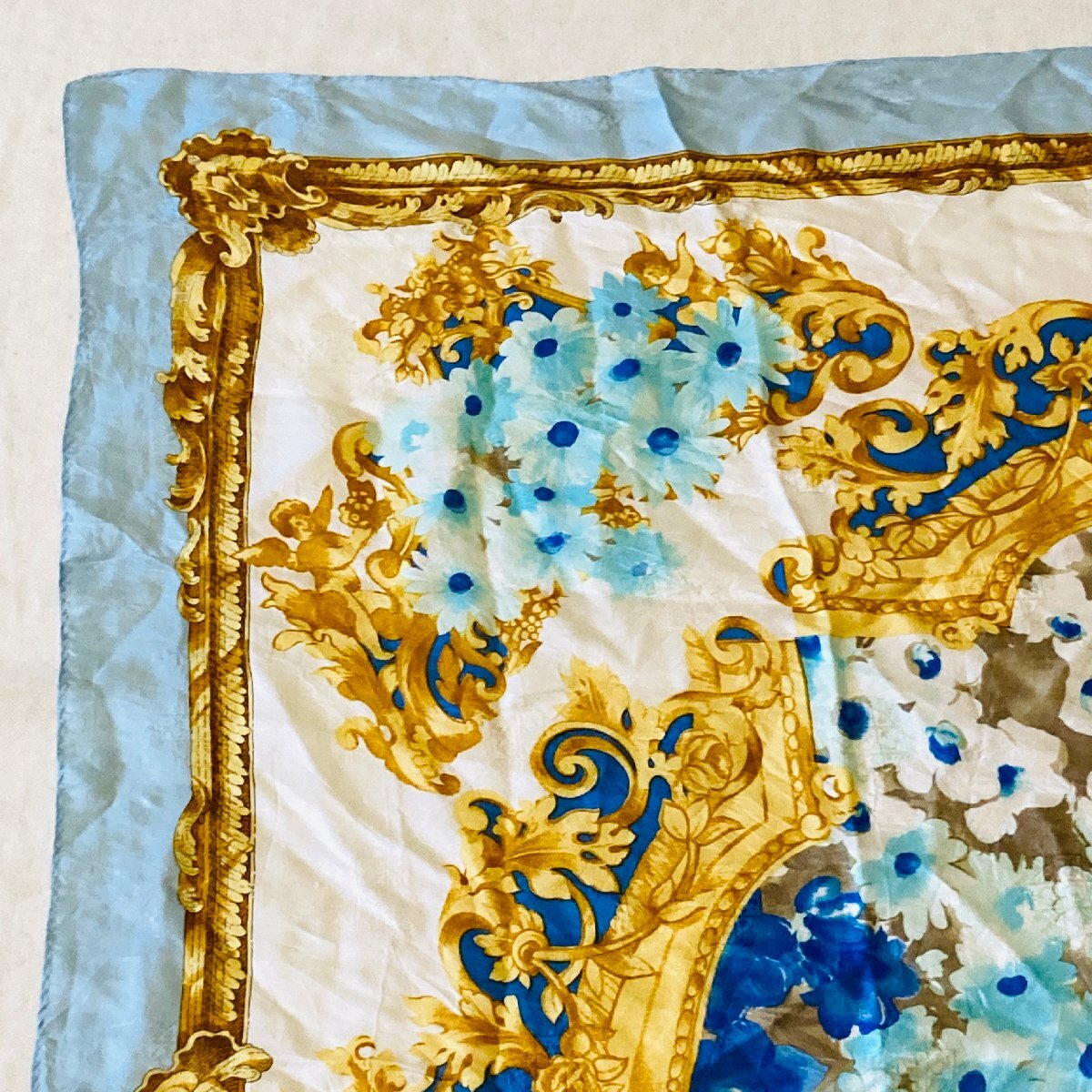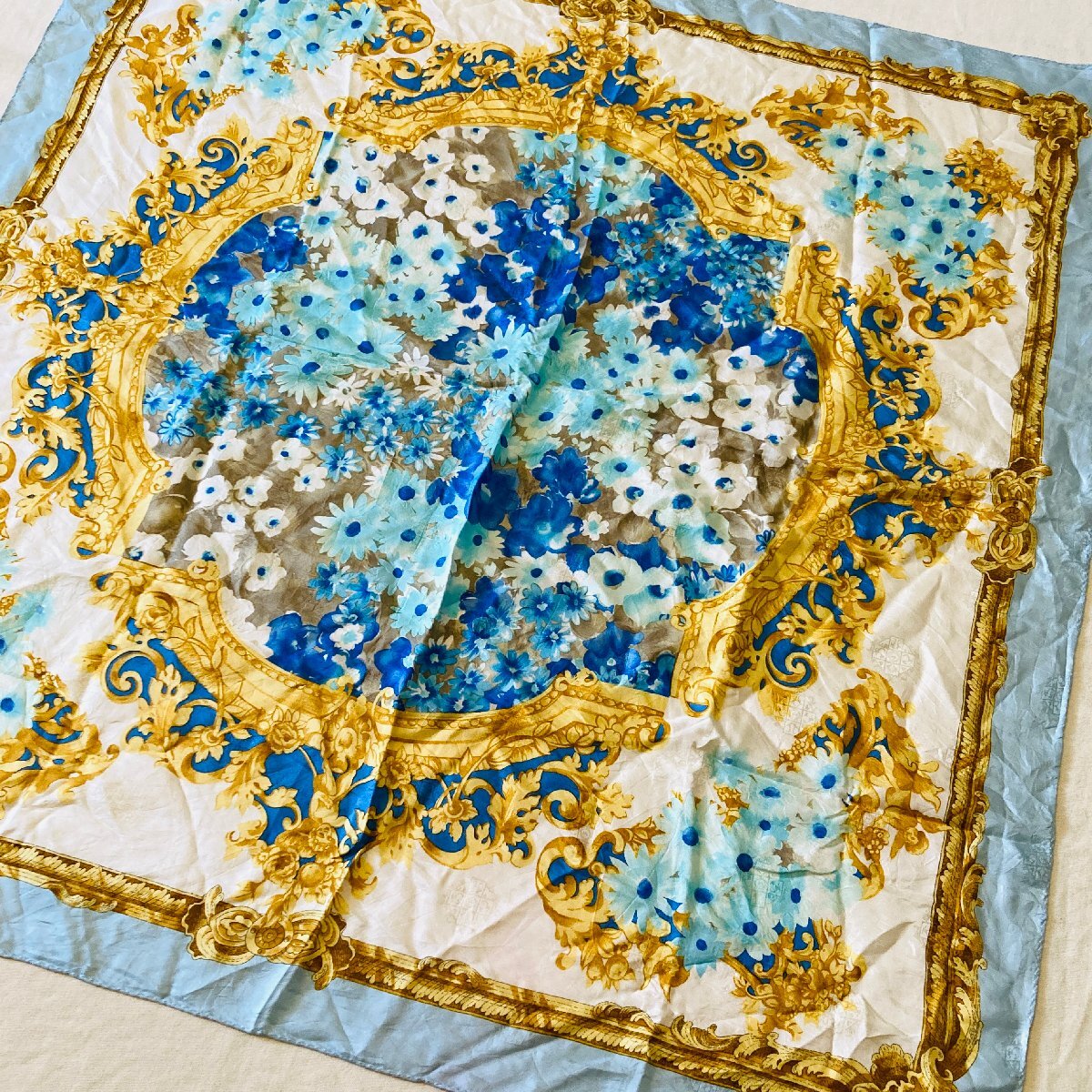 絹 シルク/SILK 100% レディース 大判 スカーフ バッグスカーフ ライトブルー系 フローラルモチーフ【lasserre】