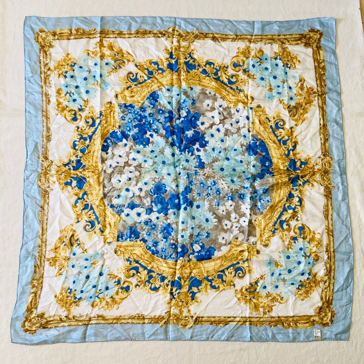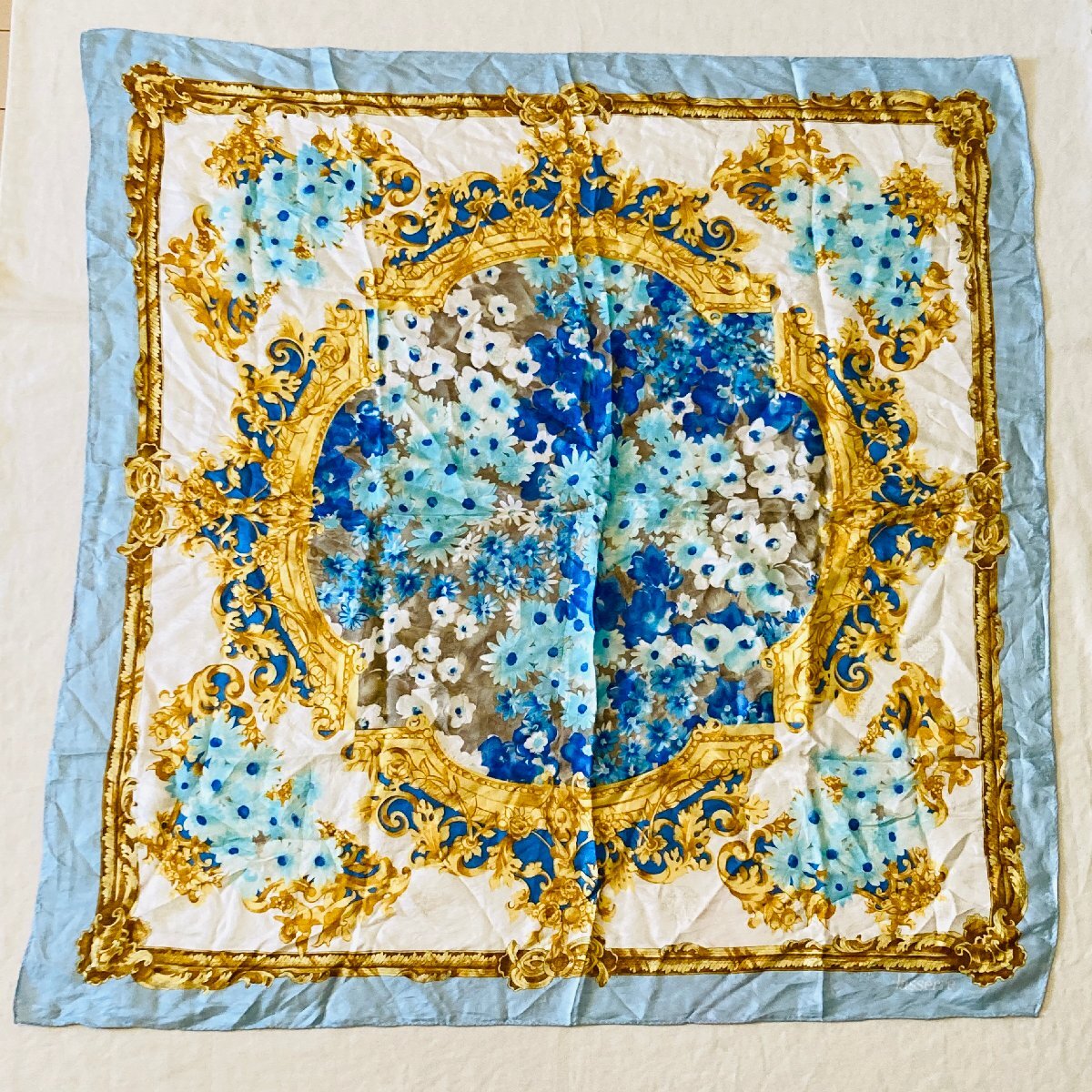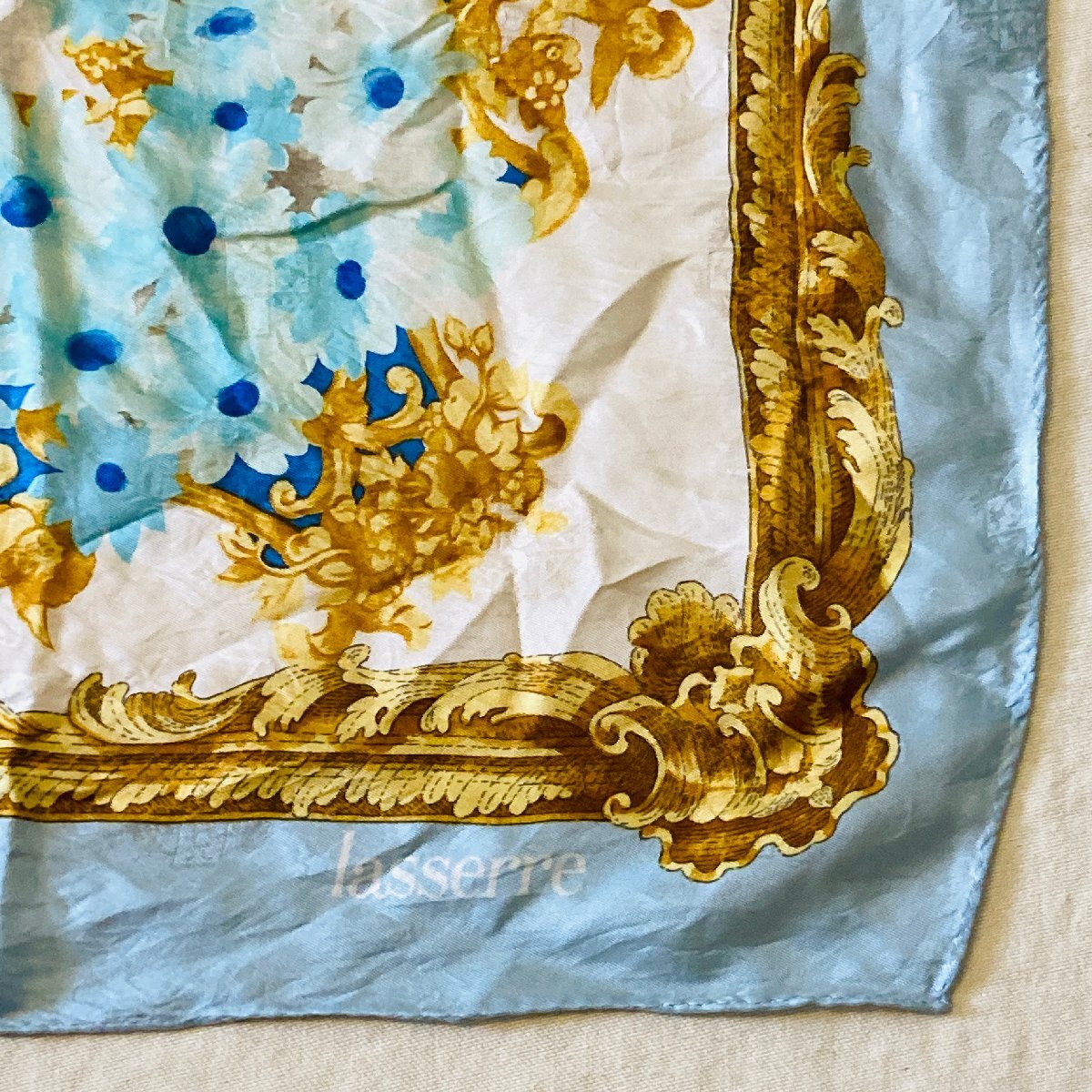 lasserre 絹 シルク/SILK 100% レディース 大判 スカーフ バッグスカーフ ライトブルー系 フローラルモチーフ