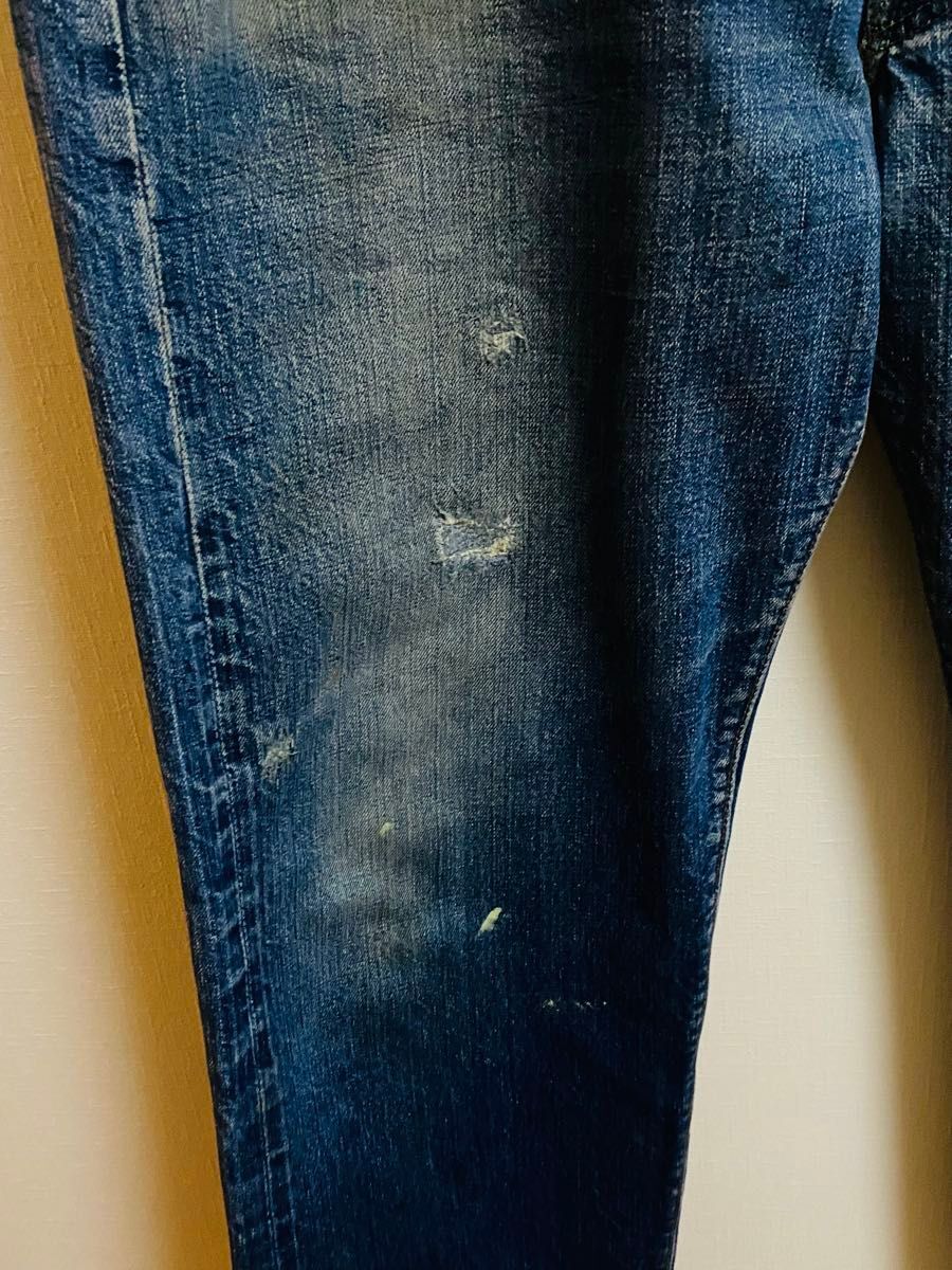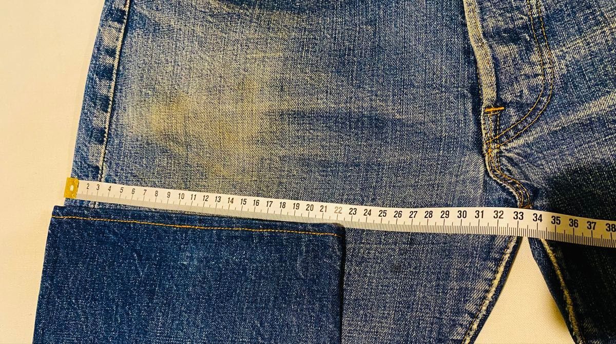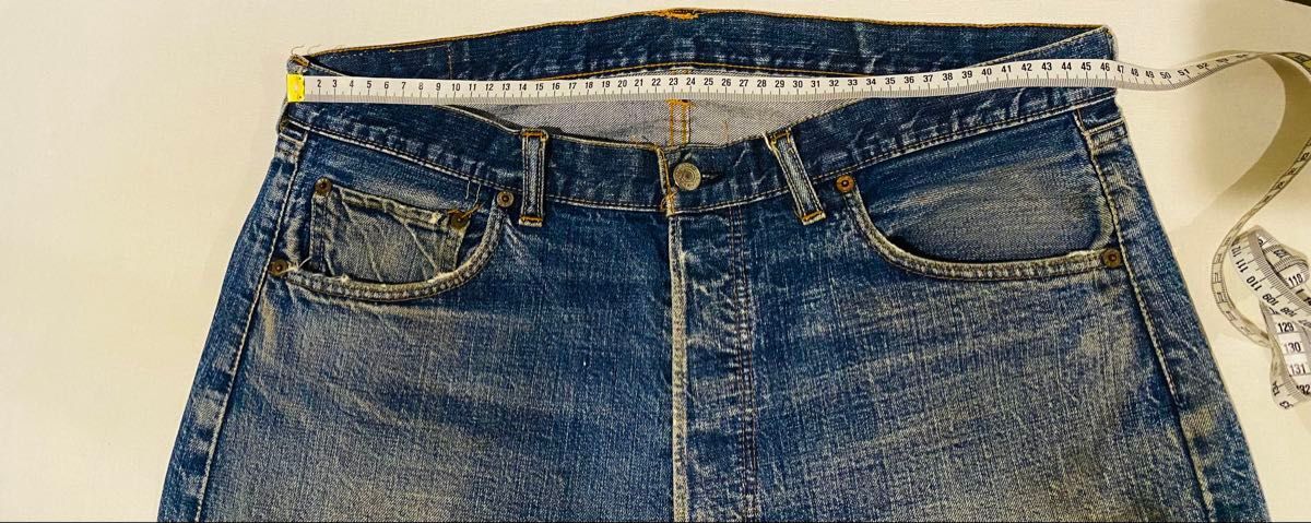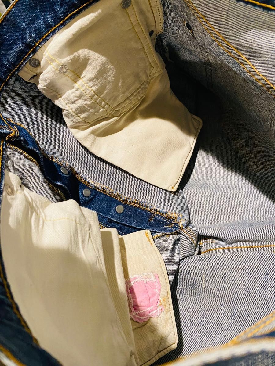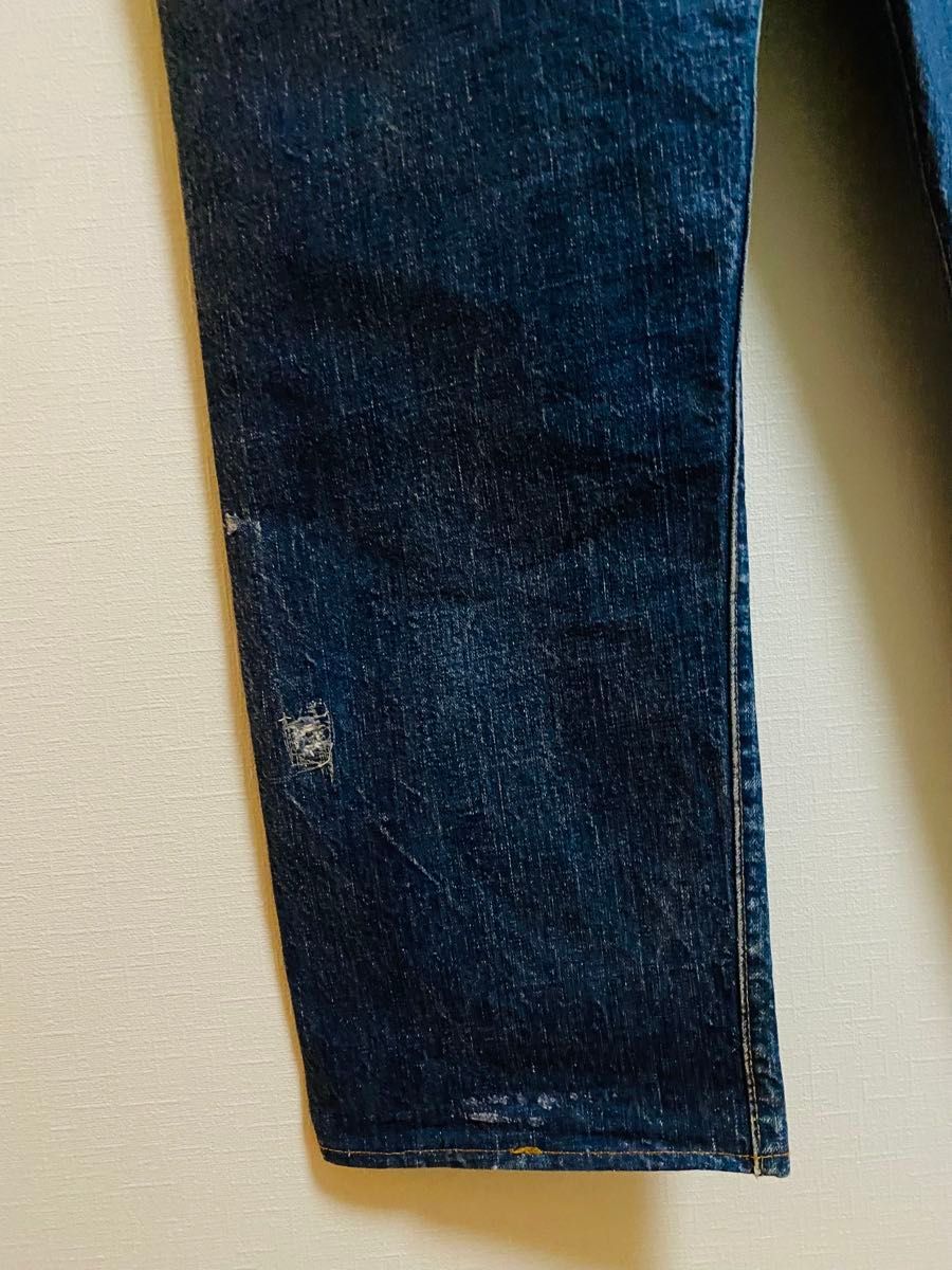 濃淡と色落ちがスペシャルに良くヴィンテージだとわかる色落ちになります。 若干糊が効いていて生地に硬さがあります。