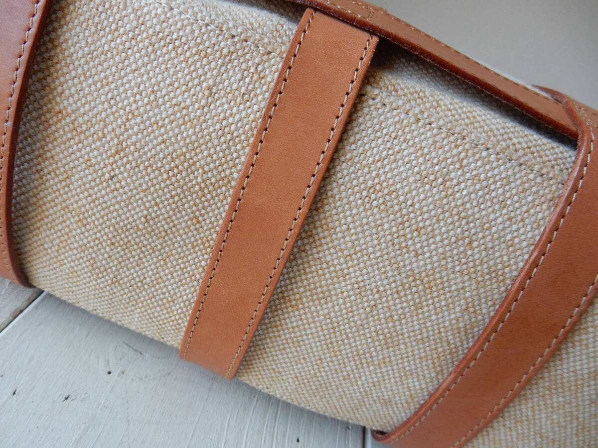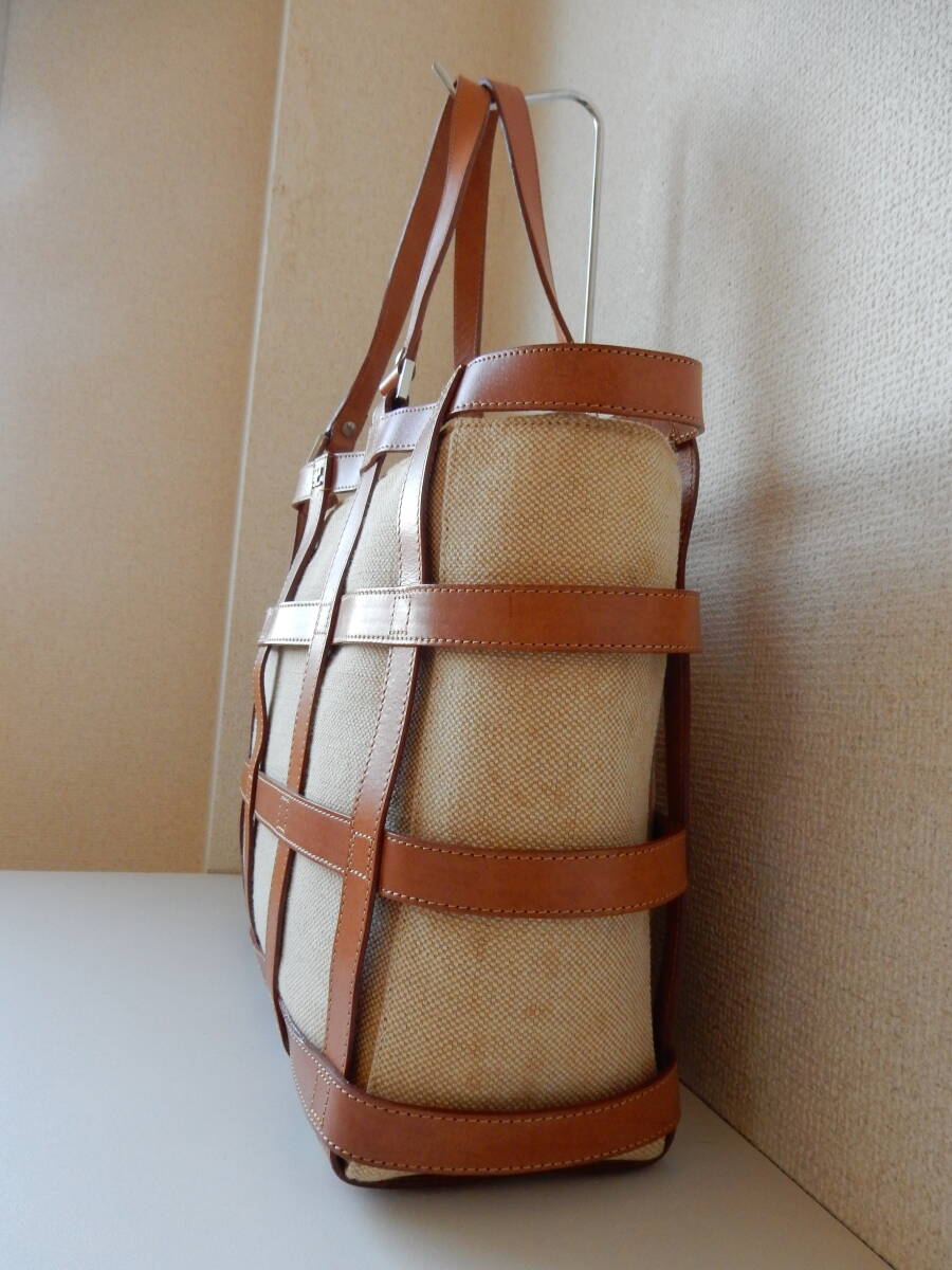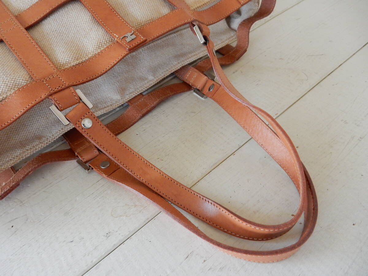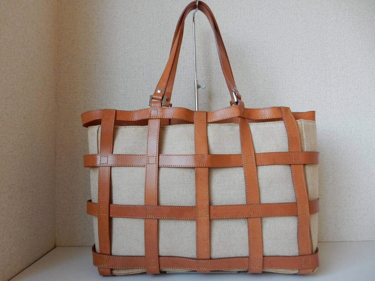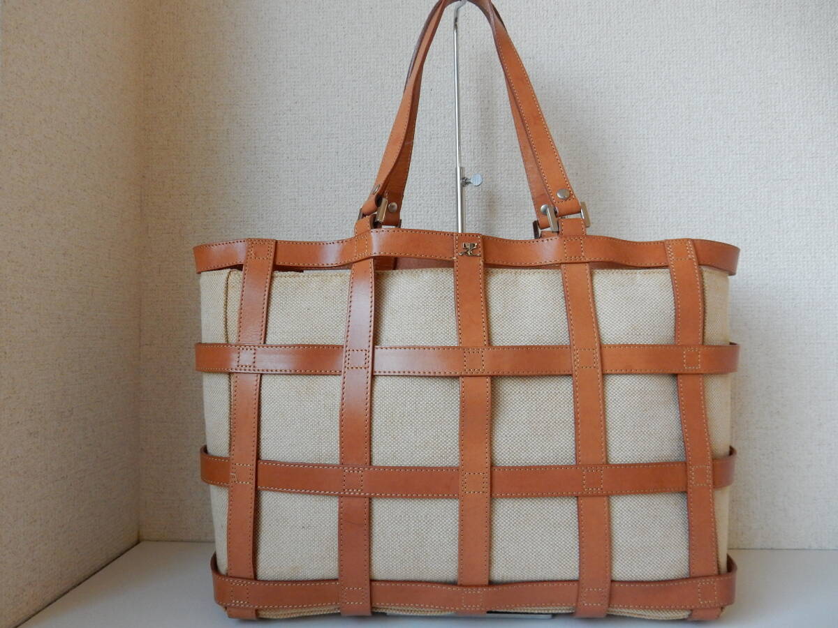 丈夫なキャンバス地に本革フレームがアクセントとなったカットインバスケットタイプのトートバッグ。