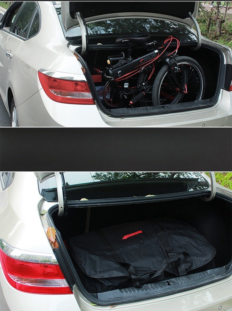 まず、自転車を完全に折りたたみ、シートクッションとシートポールができるだけ低く地面に触れるように調整してから、バッグを完全に開き、ジッパーを最後まで引きます。そして自転車を中に入れま