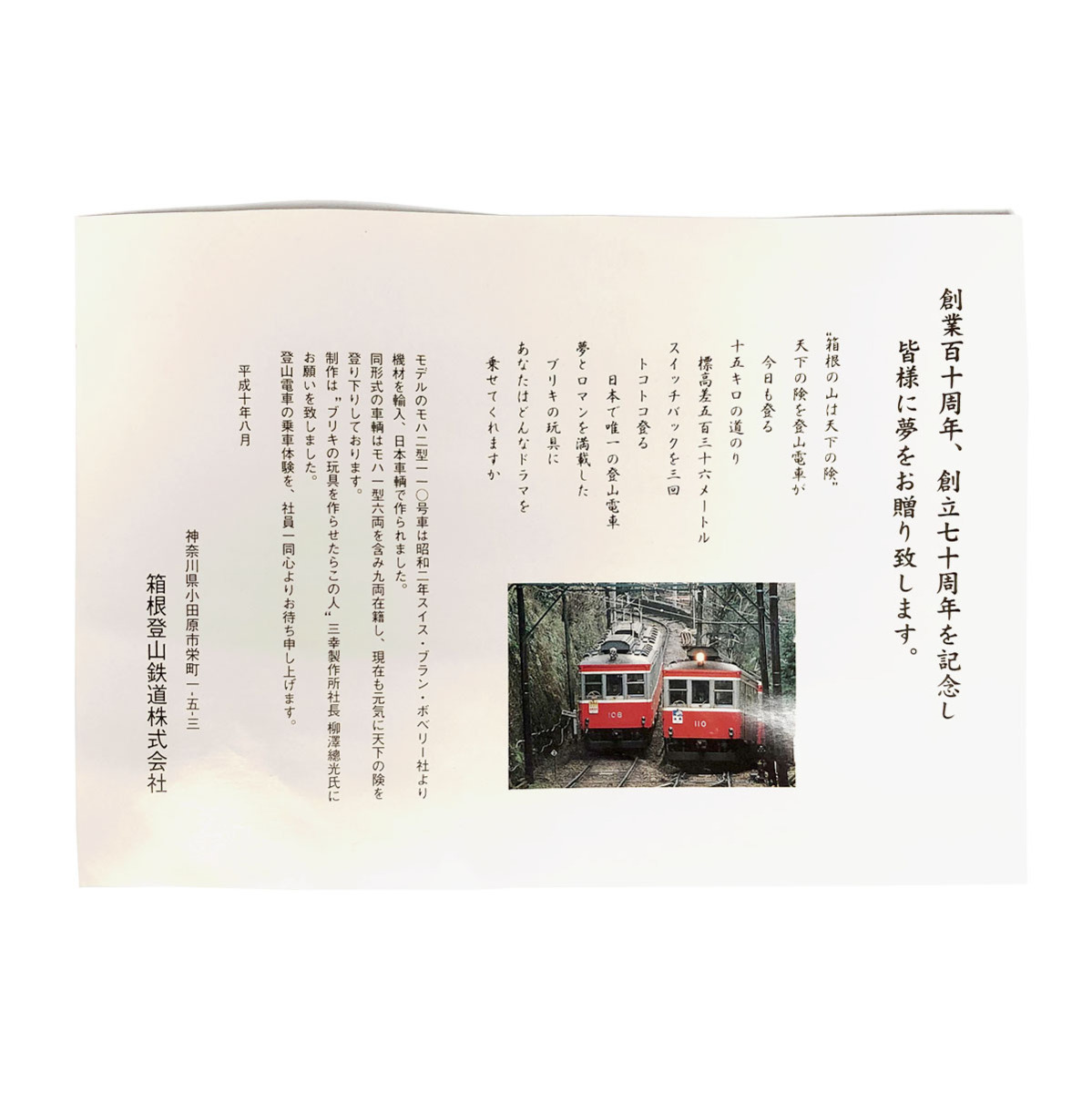 箱根登山列車は小田原と箱根を結ぶことを目的として1888年に設立された小田原馬車鉄道(その後の軌道線)が前身で、スイスを範として 箱根に登山鉄道を建設するべく、大変な難工事の末に出来上がった歴史ある登山列車です。 創業110周年記念として平成11年に発売されたモデルです。