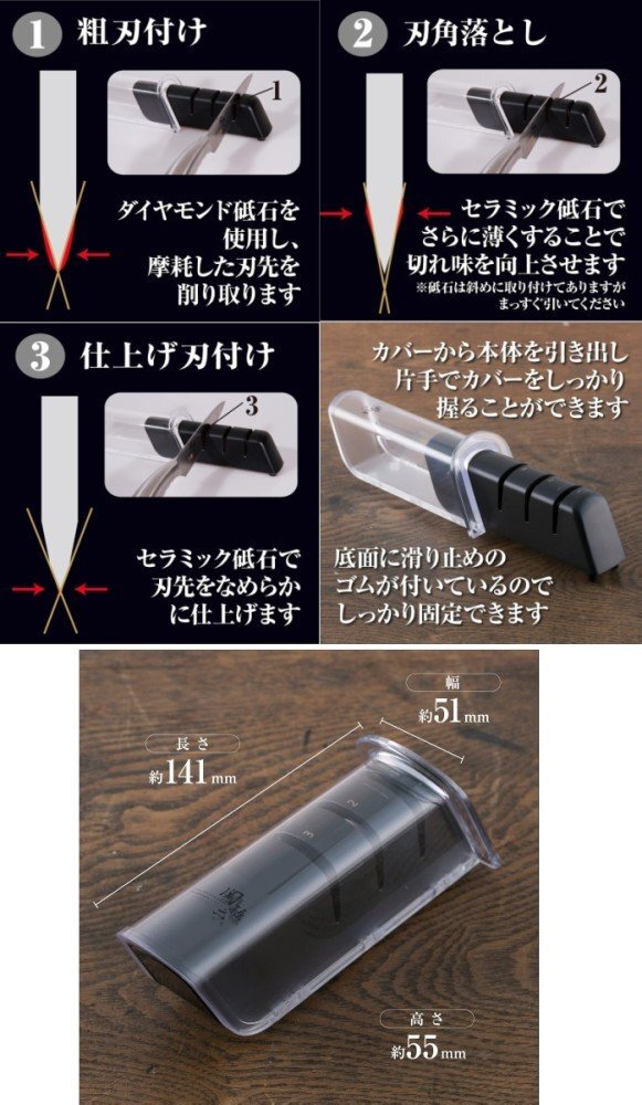 角度を自分で調整する必要なく性質の違う3種類(ダイヤモンド・セラミック2種)の砥石を順番使うことで、切れ味を簡単に蘇えらせることが可能 |