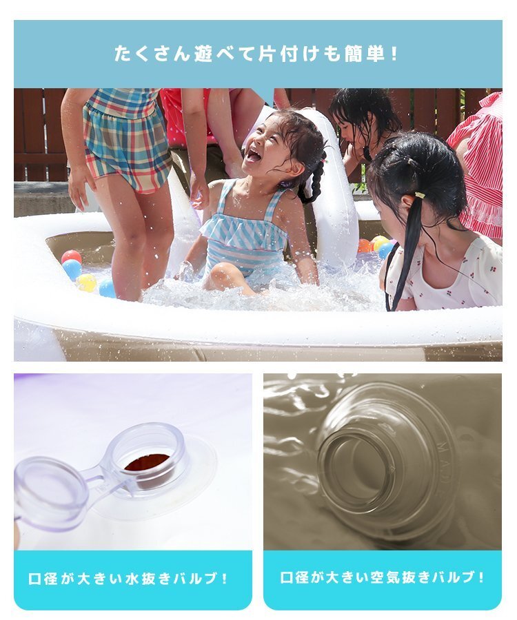 \ 暑い夏は、プールで涼しさを味わいませんか♪ / 小さなプールでは物足りない・・・ そんな方にもご満足いただける、約2メートルのファミリープールです。 子どもも大人も家族みんなで楽しめるBIGサイズ! 大人が脚を伸ばしても悠々くつろげるゆったり感! 子どもなら泳げちゃうくらい広々としています。 背もたれ付きのデザインで、くつろぎながらお子さまの様子を見守ることができます♪ 今年の夏は家族みんなでおうちプールを楽しもう! 【商品コード】 GAC007CS 【商品詳細】 カラー:カラースプレー サイズ(約):幅200×奥行き150×高さ46cm 重量(約):2.68kg 素材:PVC(ポリ塩化ビニール) 【注意事項】 ・エアポンプは付属していません。 ・本商品はPVCを使用しております。材質の特性上、接触・摩擦による他製品への色移りまたは本商品への色移りすることがありますのでご注意ください。 ・必ず保護者同伴のもと、本商品をご利用下さい。 ・本品は水深が深くなるため、対象年齢未満のお子様は使用しないで下さい。 ・プールを置く付近に破損の原因となるトゲやガラス片、金属片、木片、砂利などがないか、ご確認下さい。 ・タバコや火気には近づけないで下さい。 ・空気の入れ過ぎは破損の原因になります。内周部にシワが少し残るくらいが適量です。 ・空気栓は栓と弁の二重構造になっていますが、弁は空気の急激なもれを防ぐ補助弁で、空気を完全に止めるものではありません。 必ず栓をしっかり差し込んでご使用下さい。 ・プールは安定した平らな場所でご使用下さい。傾斜のある場所、タイル・煉瓦など目地や段差のある場所でのご使用は変形・破損の原因になりますので避けて下さい。 また、表面に塗装・コーティング等の処理された場所でのご使用は塗装等が変色したりプール本体に色移りすることがあります。ご注意下さい。 ・商品は、モニターによって色合いが異なって見える場合があります。 ・仕様・デザインは改良のため予告なく変更することがあります。 【もちろん新品未使用品です】 |