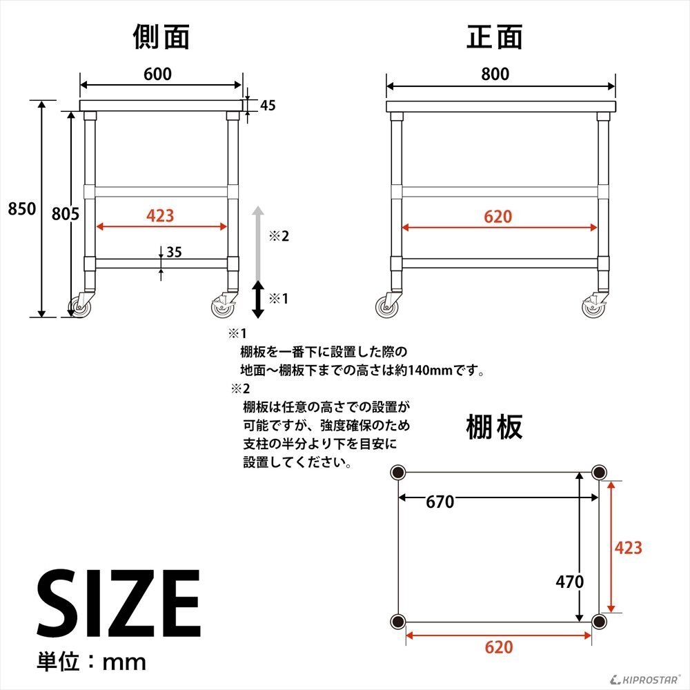 | 材質 | 天板:ステンレスSUS430 脚:ステンレスSUS201 梁:スチール 車輪:PU 軸受:スチール亜鉛メッキ |