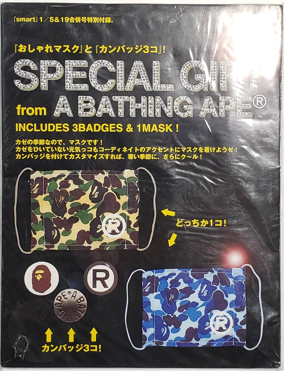 A BATHING APEのマスク1個と缶バッジ3個です。