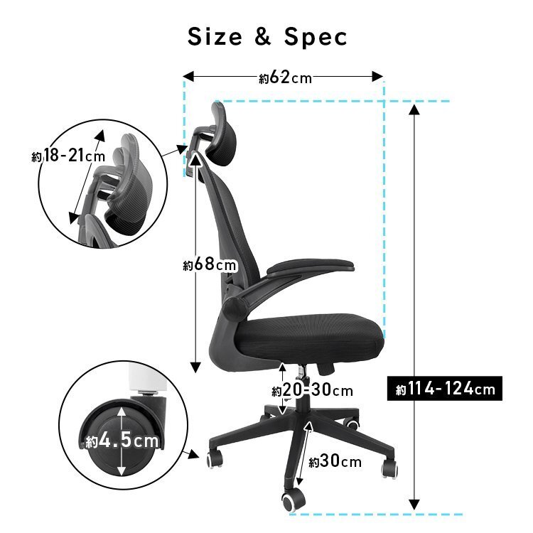| 通気性抜群のメッシュ素材を使用した、ひじ掛け付きのオフィスチェアです。 座面幅50cm、肉厚クッションで、ゆったり快適な座り心地に。 首まで支えるハイバックシートで、長時間座りっぱなしでも疲れにくい! 立体S字構造が背中のラインにフィットし、座り姿勢をサポート! ランバーサポートで腰を支え、ヘッドレストで首の負担を軽減します。 上下10cmの高さ調節が可能です。 最大約30°のロッキング機能付き! 座面下のノズルを回せばロッキングの調節が可能です。 背筋を伸ばして疲れた体をリフレッシュできます。 跳ね上げ式アームレストで邪魔にならない! デスクの下に収納できるので、お部屋もスッキリ。 シーンに合わせて幅広く使えます! デザイン性と機能性に優れたオフィスチェアです。 ■商品コード:FKB005BK ■商品仕様 特徴: ・肘掛け付き ・メッシュ素材で通気性抜群 ・S字構造ハイバック ・腰を支えるランバーサポート付き ・角度&高さ調節可のヘッドレスト付き ・可動キャスター付き ・360度回転 ・昇降機能付き ・ロッキング機能付き ・すっきり収納できるアームレスト カラー:ブラック サイズ:(約)幅50×奥行48×高さ114-124cm 重量:(約)15kg 耐荷重:(約)110kg 素材:ポリエステル100%、ナイロン、PP 他 ■注意事項 ・お客様組立の商品です。 ・組立て方や商品の個体差により、サイズは若干差異が生じる場合がございます。予めご了承下さい。 ・使用環境によりキャスターの潤滑具合が悪くなることがあります。ご了承下さい。 ・商品は、モニターによって色合いが異なって見える場合があります。 ・仕様・デザインは改良のため予告なく変更することがあります。 ■保証期間 7日間 ※商品到着後7日以内の初期不良・破損のみご対応させていただきます。 【新品未使用品です】 |