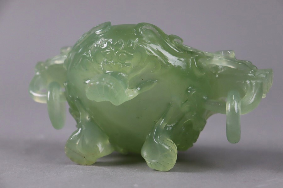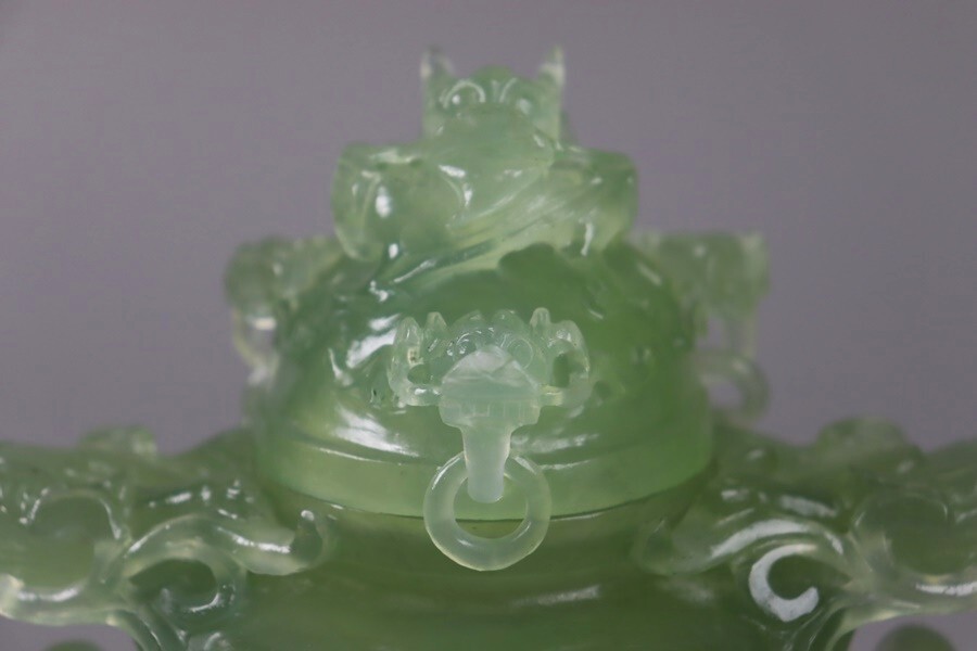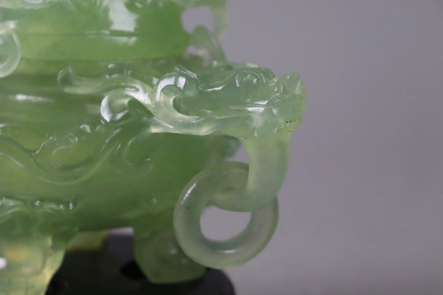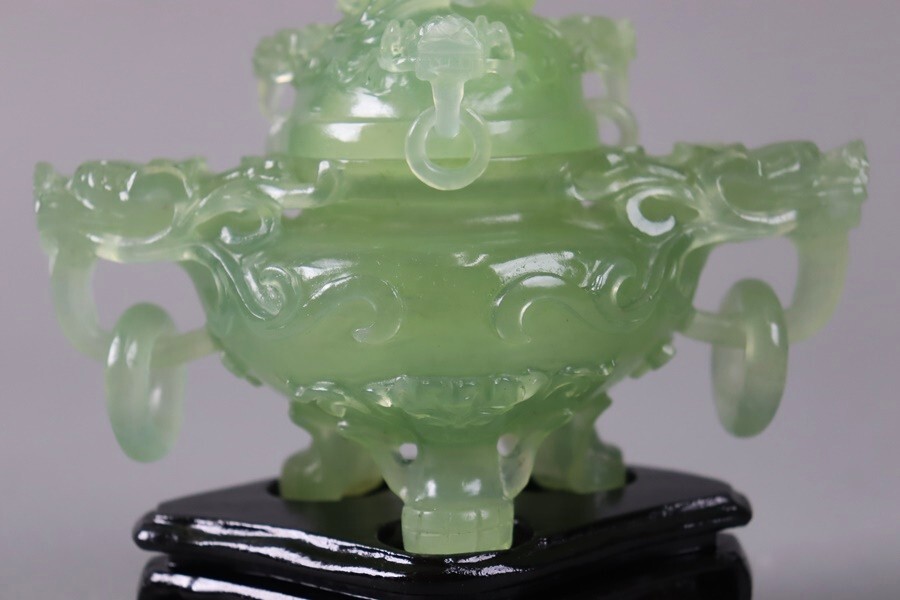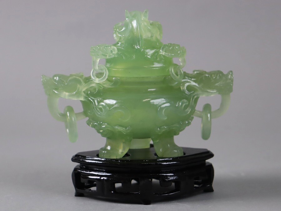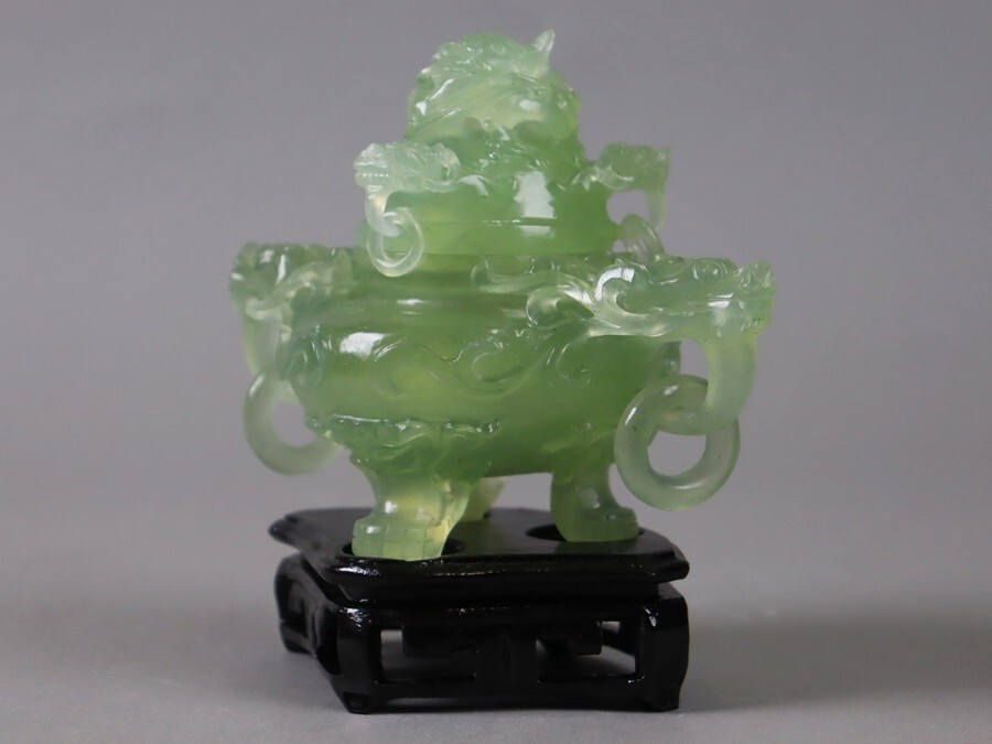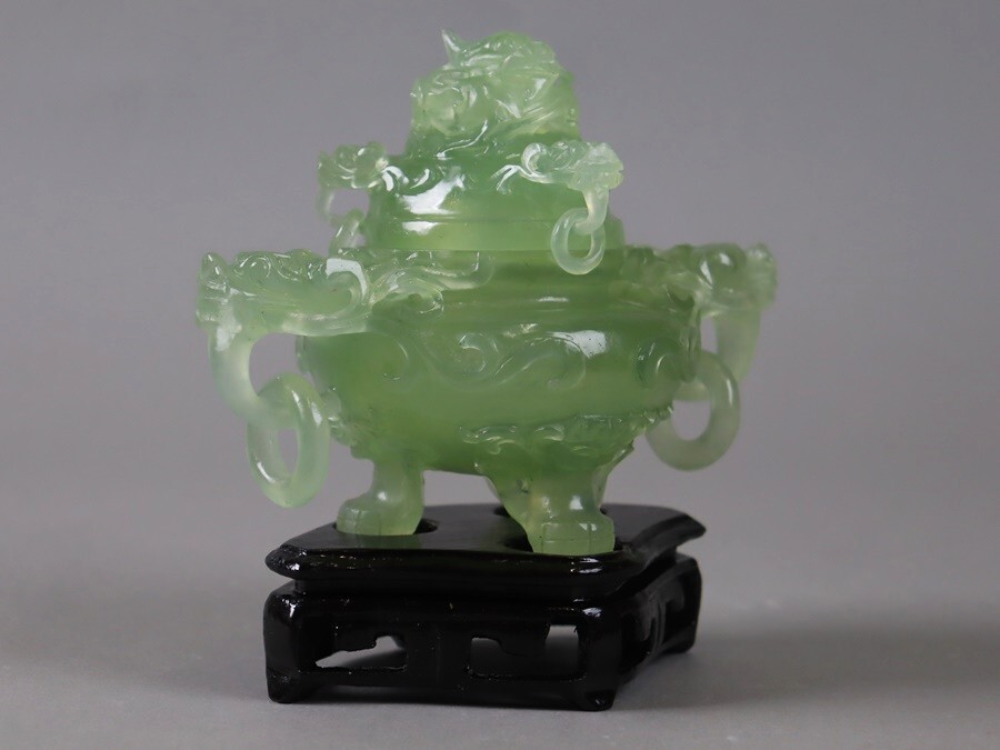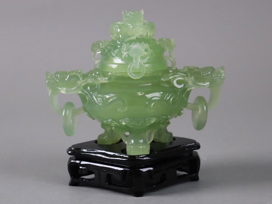 中国古玩 翡翠玉石 彫刻 龍蓋彫遊環付 香炉 唐木台付 置物 箱付 天然石 鑑賞石 飾物 細密細工 古美術品[d1295]