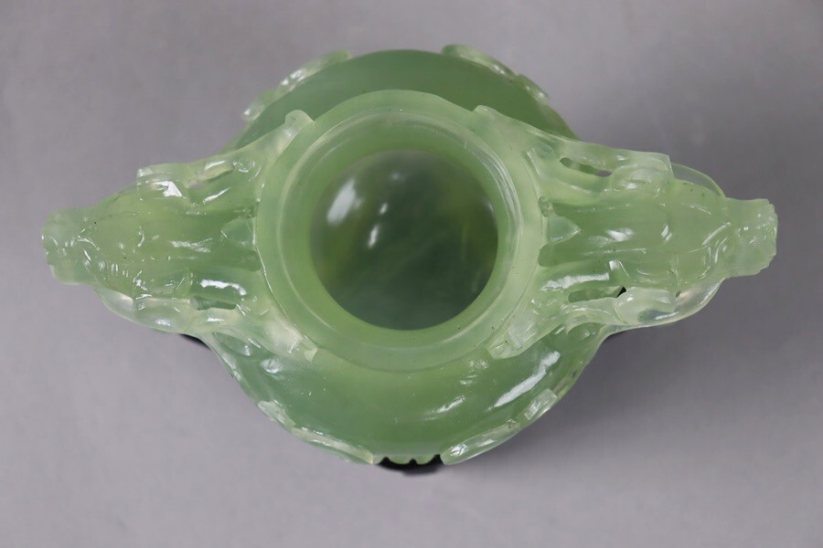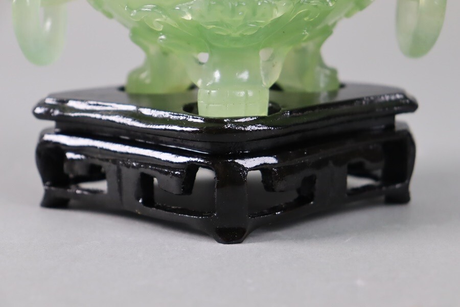 【中国古玩 翡翠玉石 彫刻 龍蓋彫遊環付 香炉 唐木台付 置物 箱付】