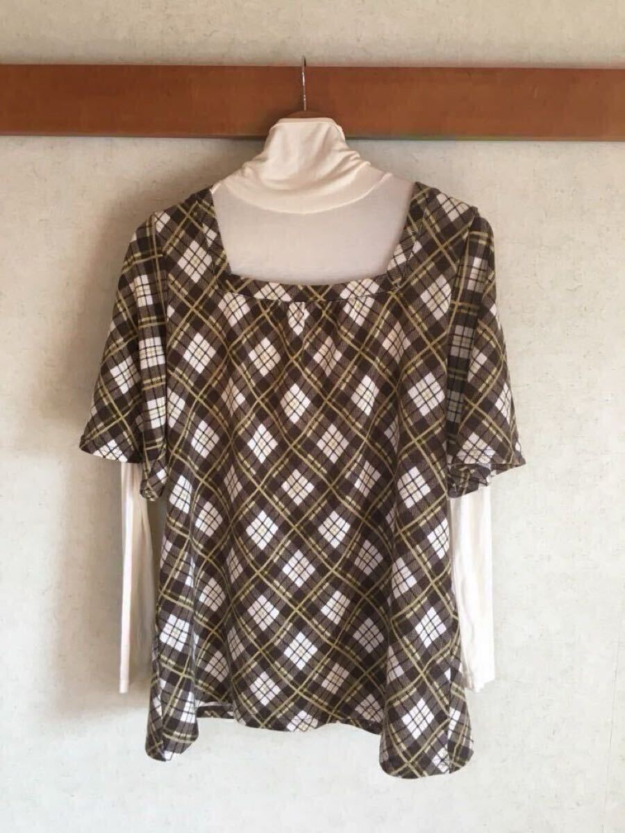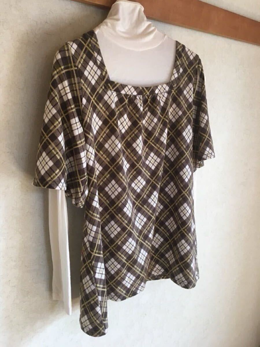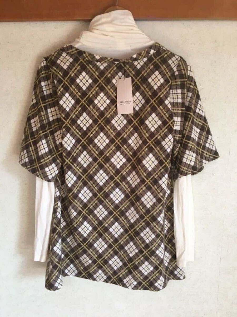 ・商品名 : レディ-スアンサンブル・ブランド : ESPRITMUR・色柄 : アウタ-→ ブラウンとクリ-ム色の濃淡格子柄 インナ-→ オフホワイト・サイズ : L バスト 86~94 身長 154~162・素材 : アウタ-→ ポリエステル 95% ポリウレタン 5% インナ-→ アクリル 48% レ-ヨン 48% ポリウレタン 4%**** アウタ-は五分袖、インナ-はタートルネック で両サイドシャ-リング入り 未使用品
