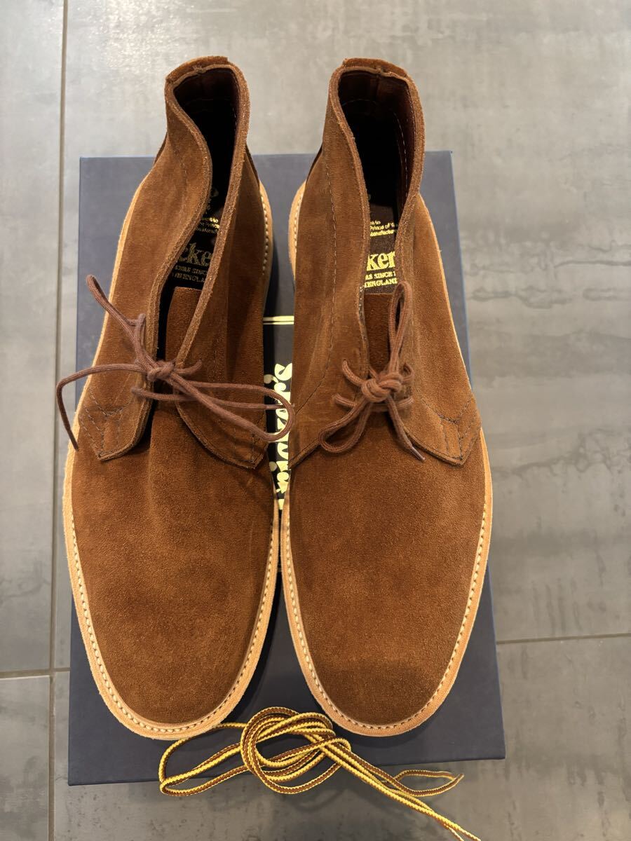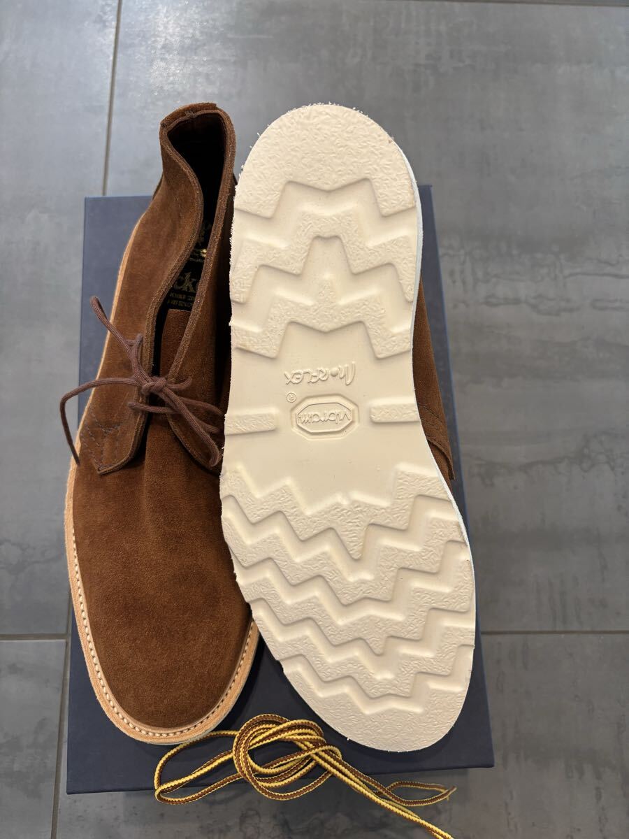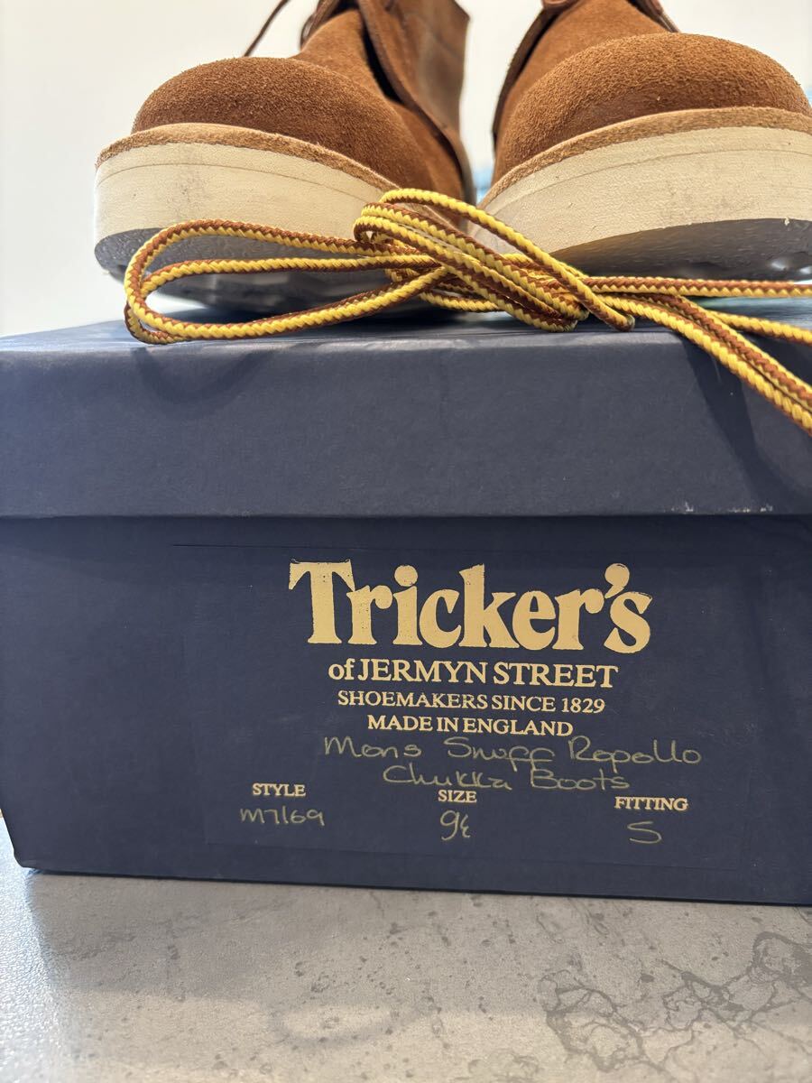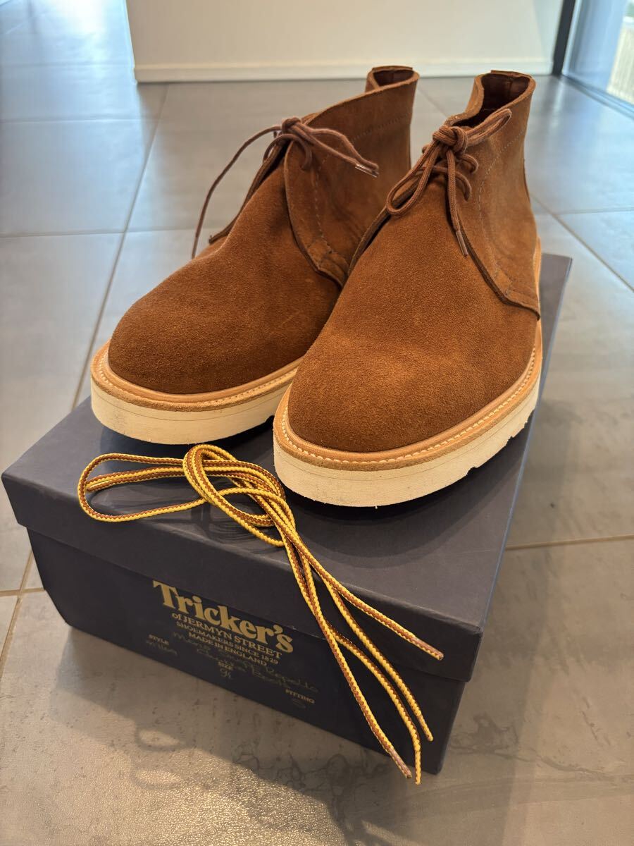 トリッカーズのスェードチャッカブーツです。ソールはビブラムのホワイトソールで軽い履き心地です。新品未着用。サイズはUK9.5です。