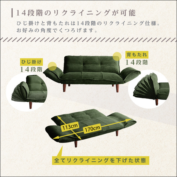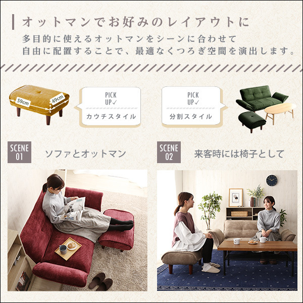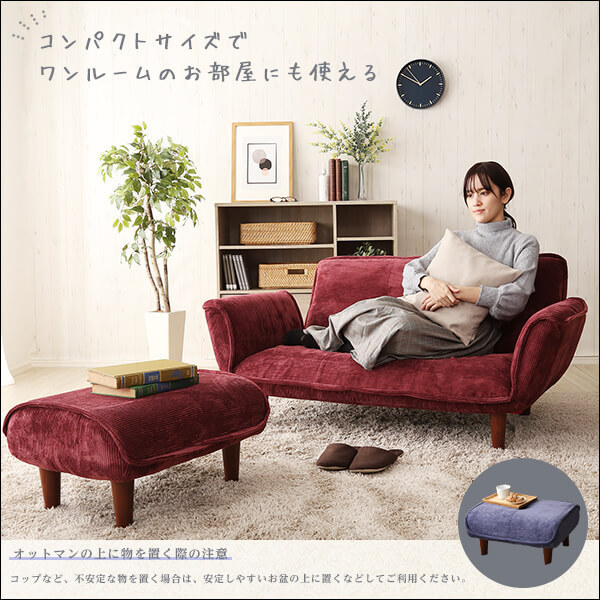 【ポイント】 コーデュロイ生地で肌触りが気持ちい2人掛けコンパクトソファとオットマンのセットです。 足を伸ばせてゆったりくつろげます。 背もたれ、肘置き部分は14段階リクライニング可能なのでベストな位置に調整できます。 ポケットコイル搭載で耐久性GOOD! |