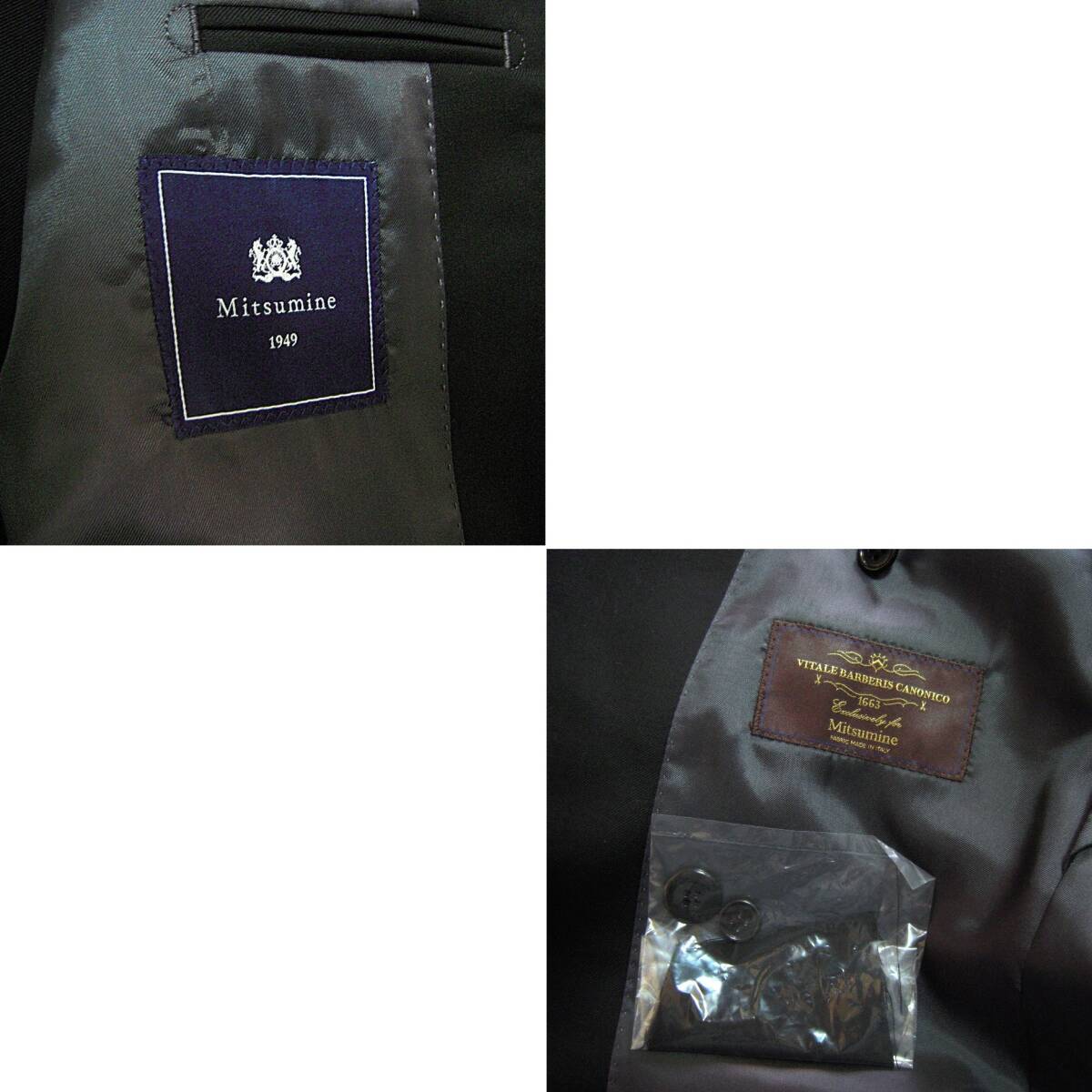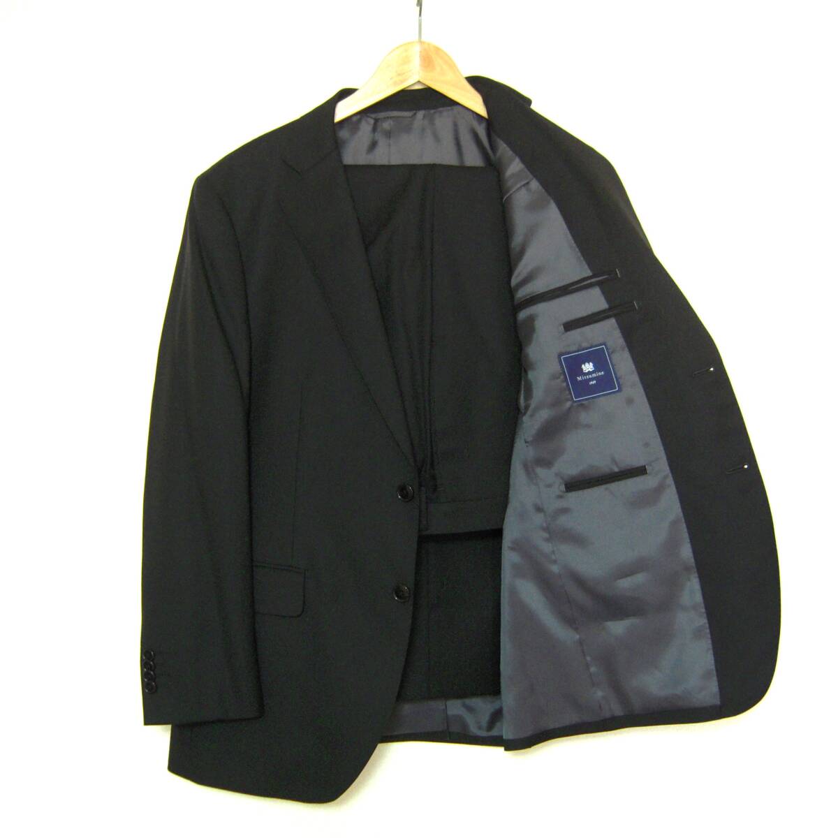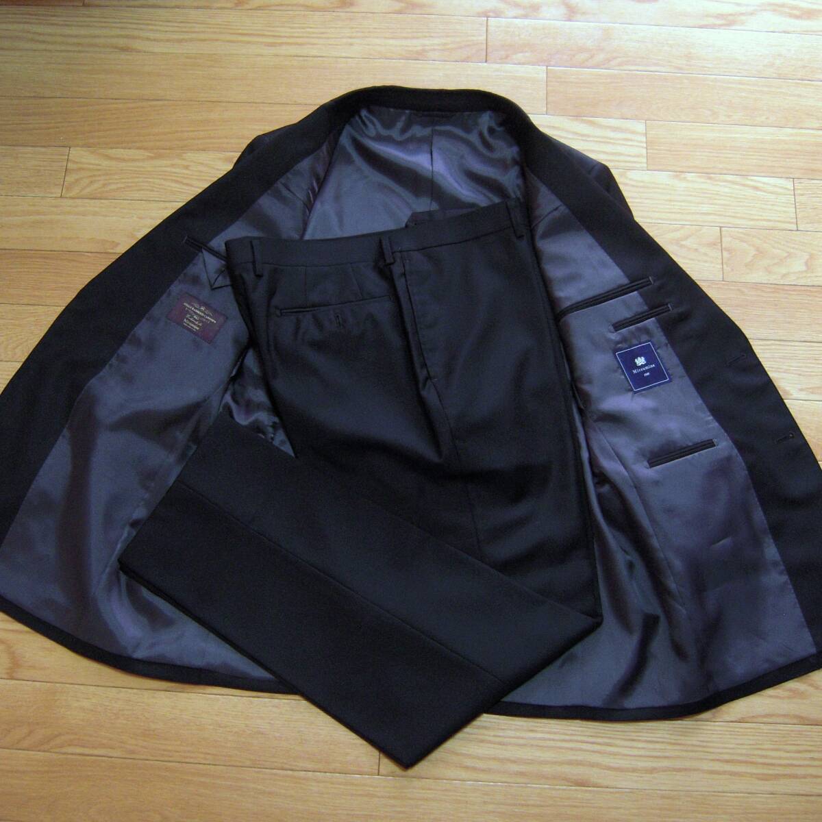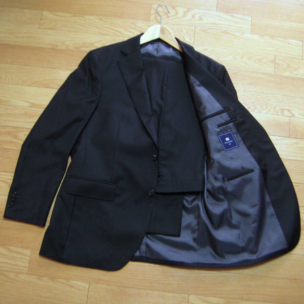 ミツミネ、ブラックフォーマルスーツです。イタリア製カノニコ生地を使用、ナチュラルなショルダーラインを持つ2釦のオーソドックスなシルエットです。サイズ表記はAB6、実寸も参考にご検討下さい。