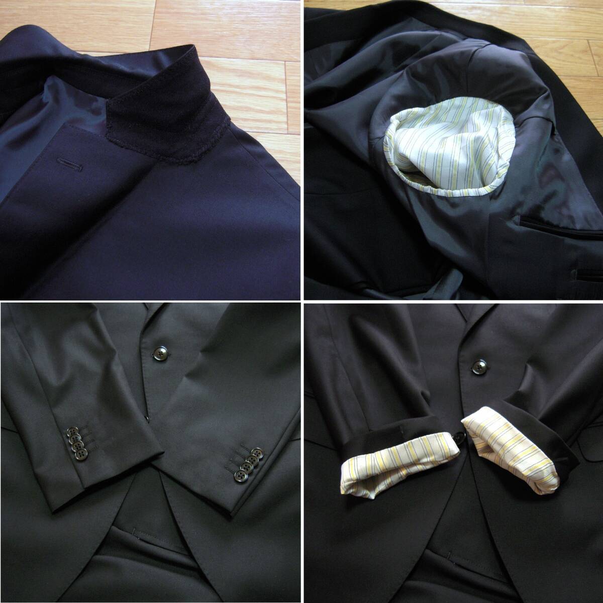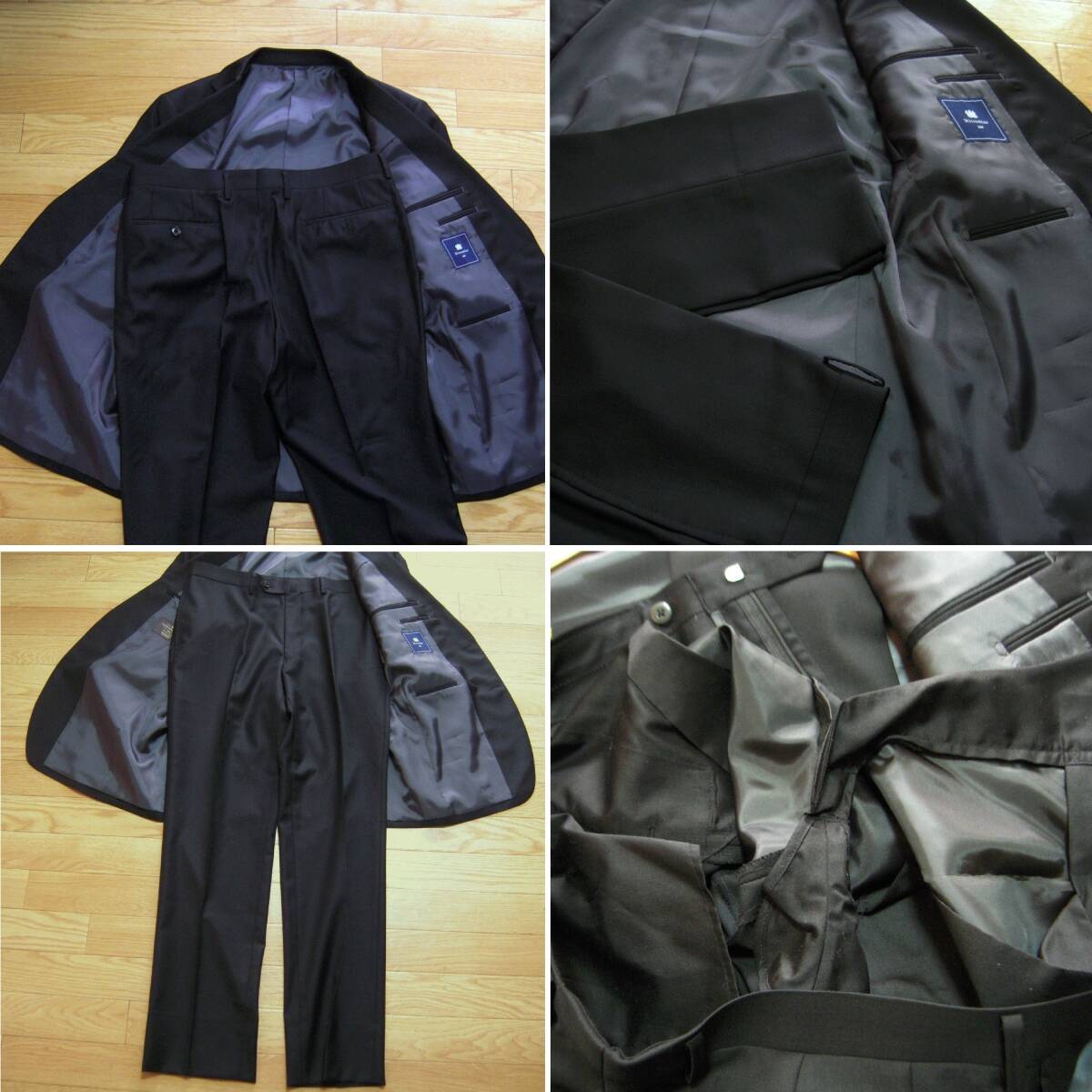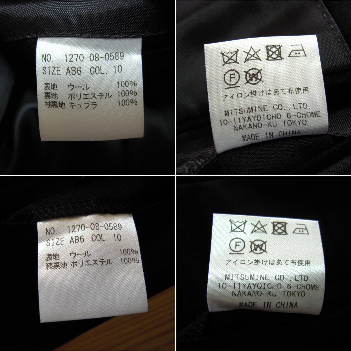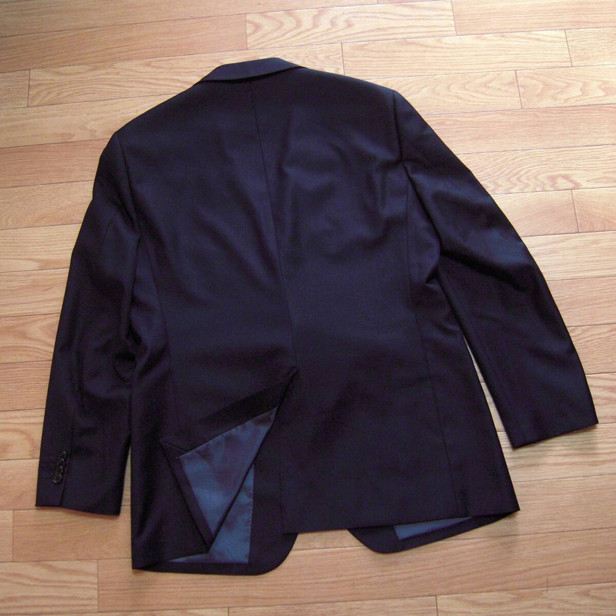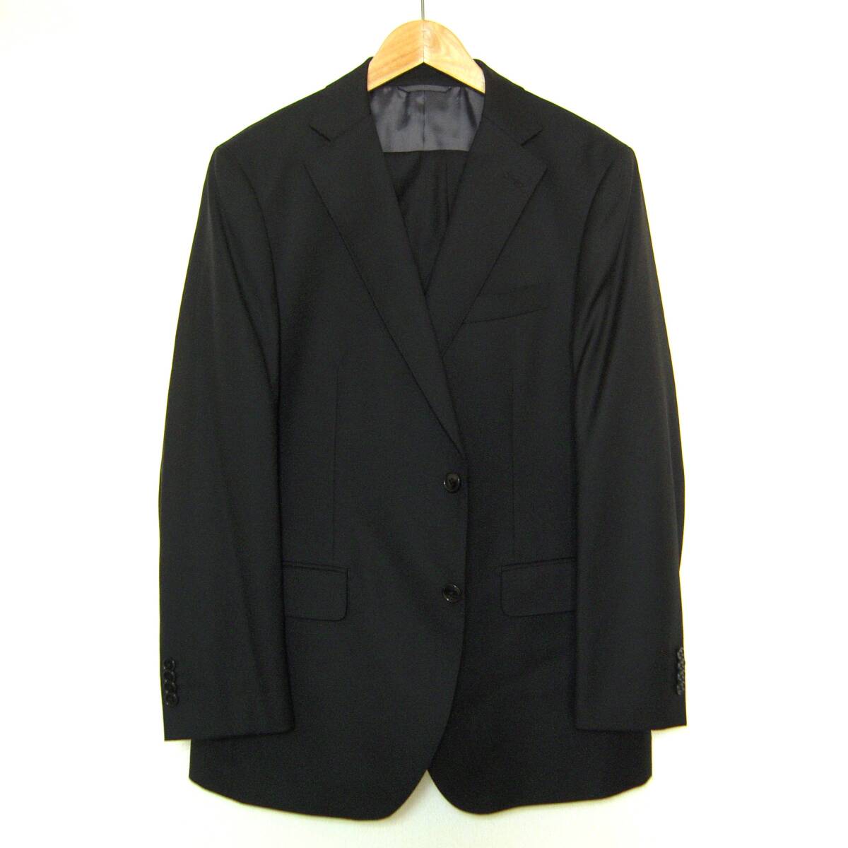 ミツミネ、ブラックフォーマルスーツです。イタリア製カノニコ生地を使用、ナチュラルなショルダーラインを持つ2釦のオーソドックスなシルエットです。サイズ表記はAB6、実寸も参考にご検討下さい。