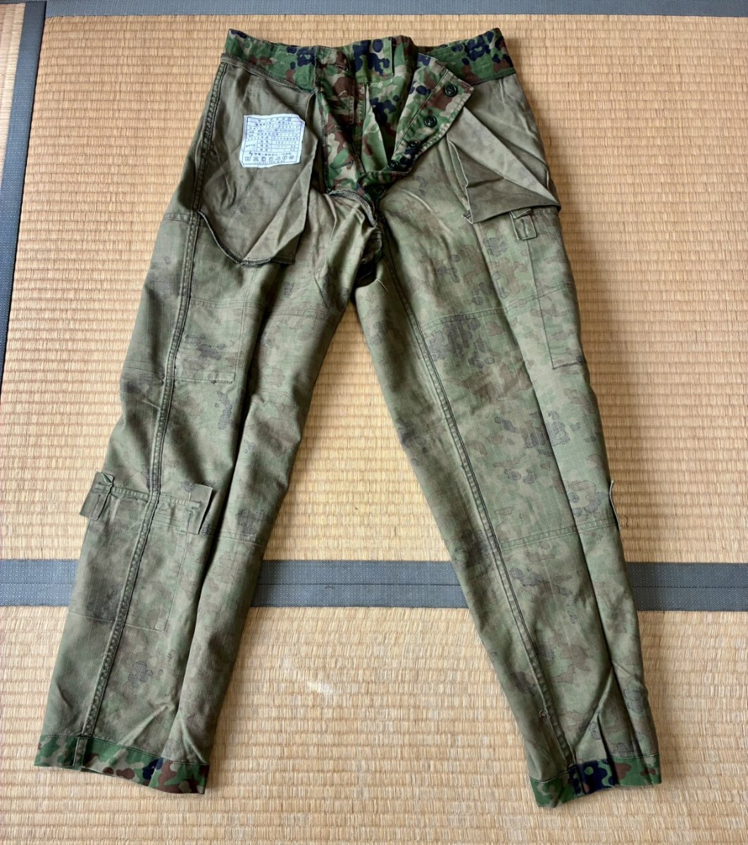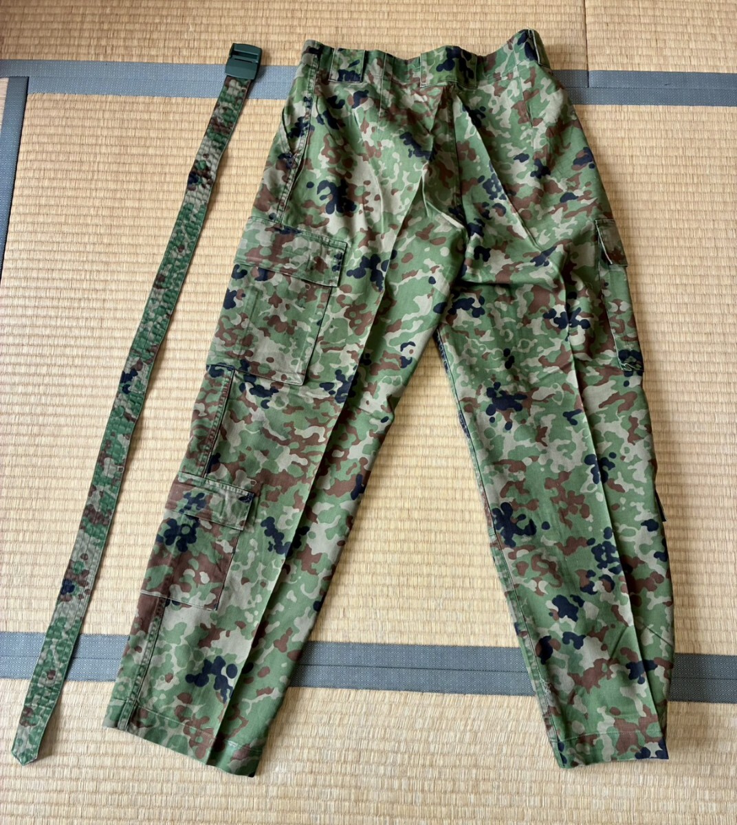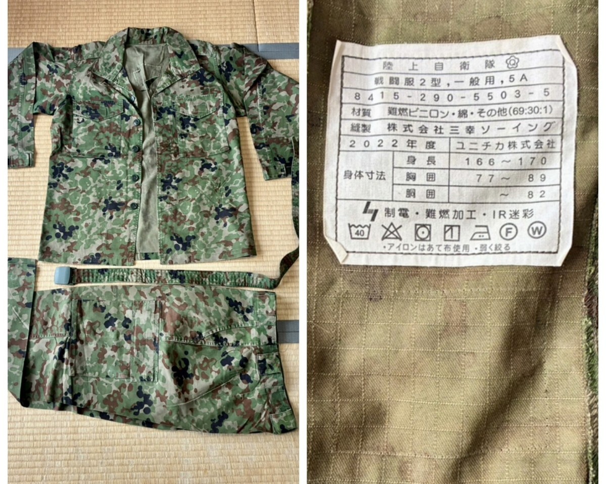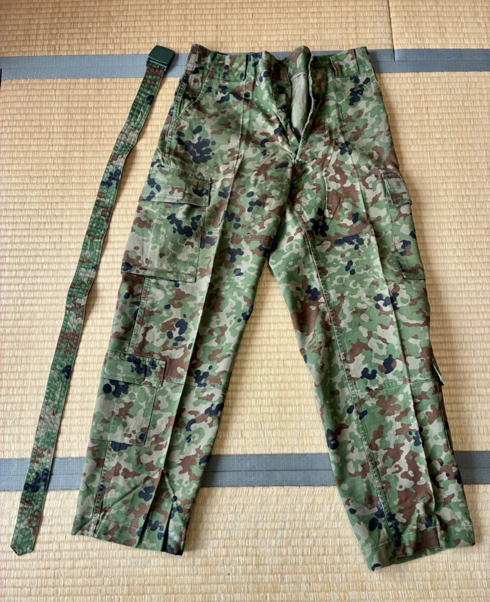 品名:陸上自衛隊 実物の戦闘服2型一般用の上衣とズボンとベルトの3点です。サイズは5Aです。