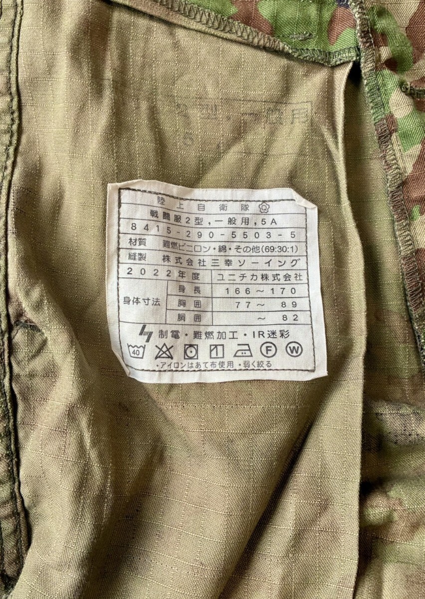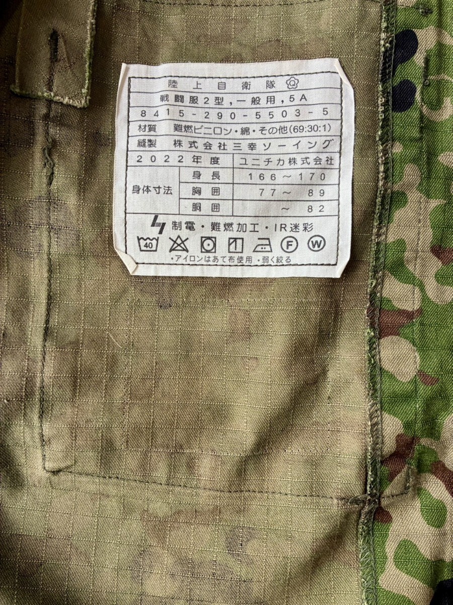 材質:難燃ビニロン・綿・その他 69・30・1 静電 難燃加工 IR迷彩(赤外線暗視装置に反応しにくい加工)が施されています。実物の陸上自衛隊の戦闘服ですのでレプリカ品やPX品(自衛隊内の売店で売っている戦闘服)とは生地や加工が全く違います。