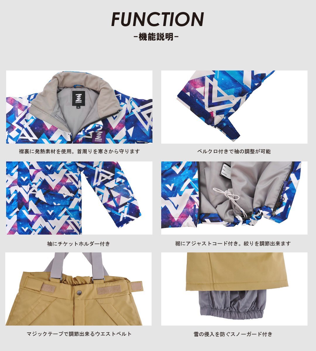 | 詳細 | 北海道に住む私たちが、冬に着たいスノーウェアとは、アクセサリーとは、を考えて作り上げた 当社オリジナルブランド「BANNNE」 ブランド名である「BANNNE(バンネ)」をあしらったジャケットにカラーパンツを合わせた キッズ・ジュニアスキーウェアです。 お子様の成長に合わせたサイズ調整機能付きで、長くご着用頂ける上下セット。 耐水圧は10,000mmの高機能で、雪遊びや外遊び、スキーやスノーボード 、通学などお子様の冬の毎日を彩る最強のお供です。 BANNNE(バンネ)は、シンプルデザインで、長く着て頂けるよう機能を充実させながらも コストパフォーマンスにも優れたウェアを皆様へお届けしたいと考えて居ります。 ■サイズ調整機能付き お子様の成長に合わせて、内側の脇部分と下部のサイドポケット内のドローコードで、 袖と股下の長さをそれぞれ約15cm縮めて調整することが可能です。 ■耐水圧10,000mm 【サイズ】 ジャケット: 単位(cm)/着丈/胸囲/裾回/肩幅/袖丈/裄丈/袖口 130/56/96/97/38/49/68/24 140/60/100/100/40/53/73/25 150/64/106/104/42/56/77/26 160/68/112/110/45/59/81.5/26 パンツ: 単位(cm)/ウエスト/大腿囲/脇丈/股下/脚口 130/72/54/79/60/48 140/74/56.7/85/65/48 150/78/60/91/70/50 160/81/64/97/75/52 ※個体によって多少の誤差ございます。 【サイズ調整機能】 ジャケット両脇下のストラップ、パンツ内部のストラップで、最大15cmの調節が可能です。 成長の早いお子様でも長く着られるよう考慮しています。 【素材】 表地:ポリエステル100% 裏地:ポリエステル100% 中わた:ポリエステル100% 【製品の構造】 ・耐水圧/10000mm ・襟裏に発熱素材を使用。首周りを寒さから守ります。 ・袖口カフスはベルクロで調整可能 ・袖にチケットホルダー付き ・裾にアジャストコード付き。絞りを調節出来ます ・脇内側にサイズ調整紐 ・ポケット内部のドローコードで裾の長さ調整可能 ・マジックテープで調節出来るウエストベルト |