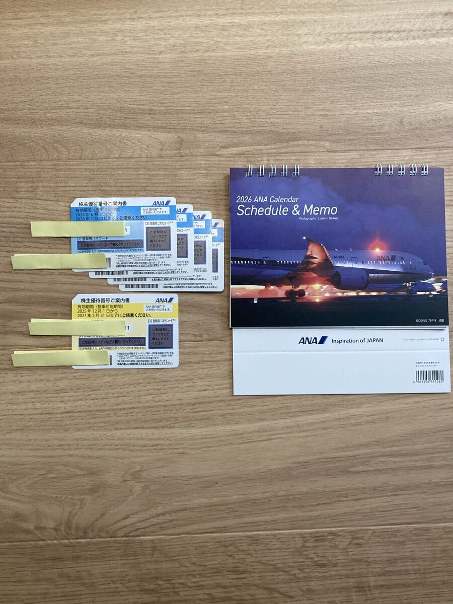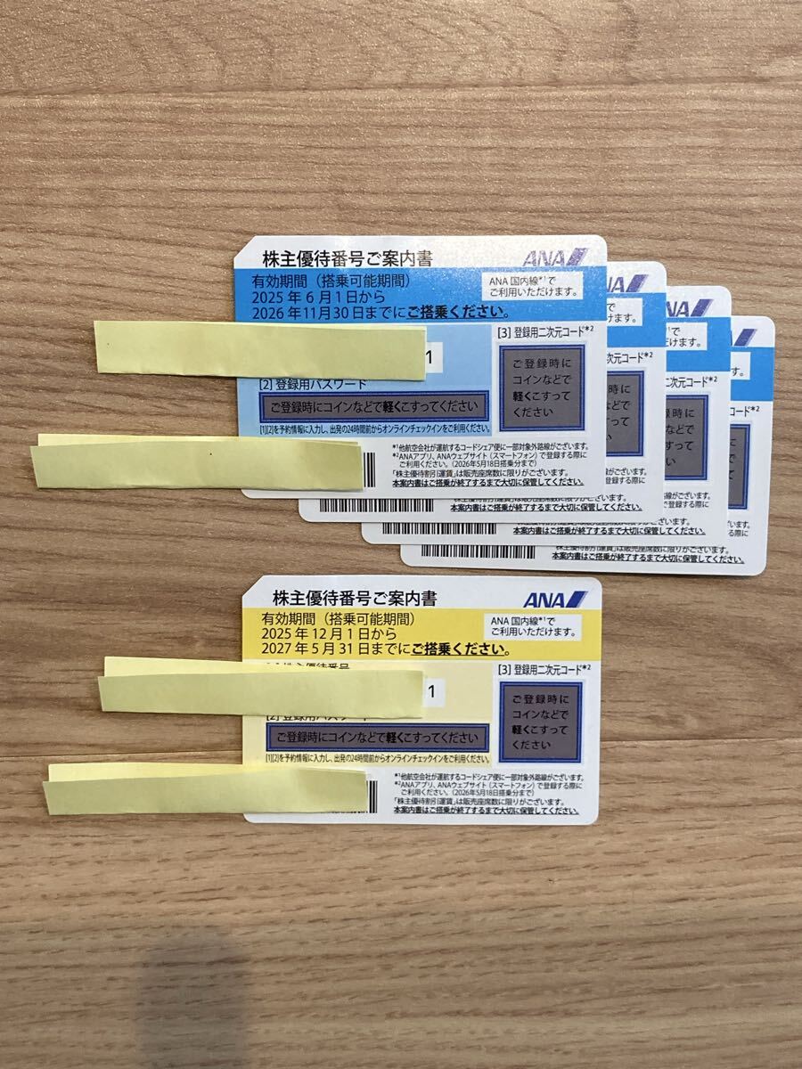ANA全日空の株主優待券5枚1セットに2026年のANA卓上カレンダーのおまけ付きです。株主優待券は2026年11月30日までの搭乗分が4枚、2027年5月31日までの搭乗分が1枚の内訳となってます。5枚1セットでの販売です。お互いのトラブル防止のため、番号のみの通知ではなく、現物を郵送する方法としますので、ご理解下さい。送料はレターパックライト利用で一律430円です。