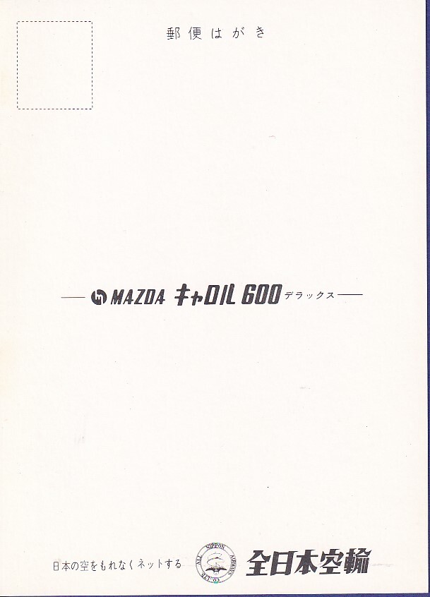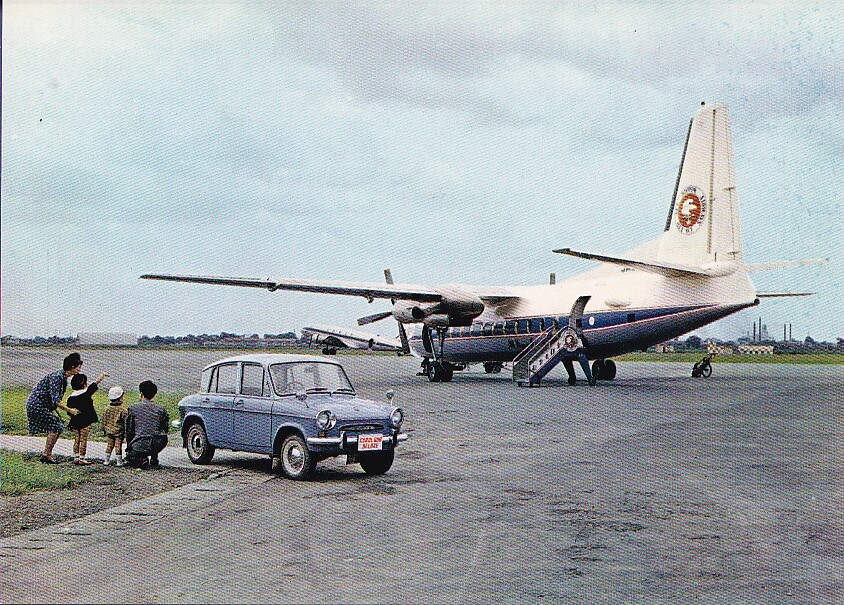 場内に機体、乗用車、家族が表示された珍しい構図の絵葉書。裏面、黒色表示。