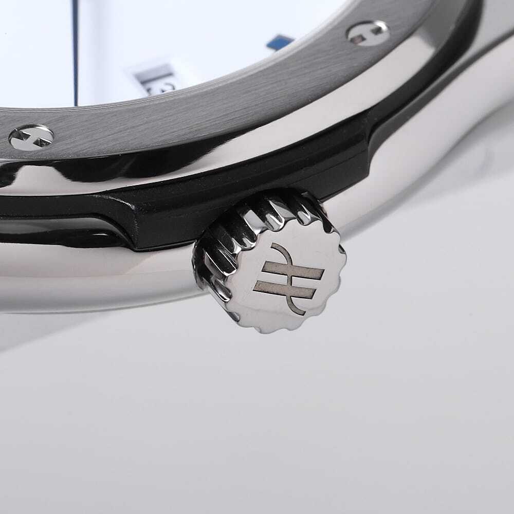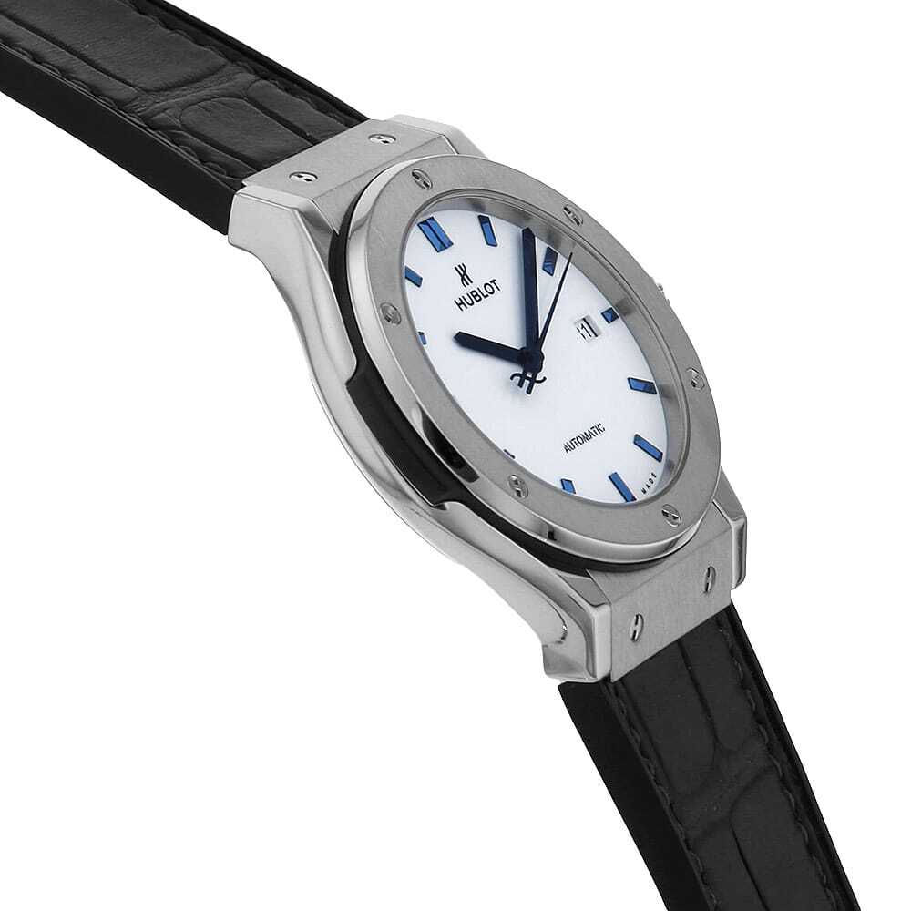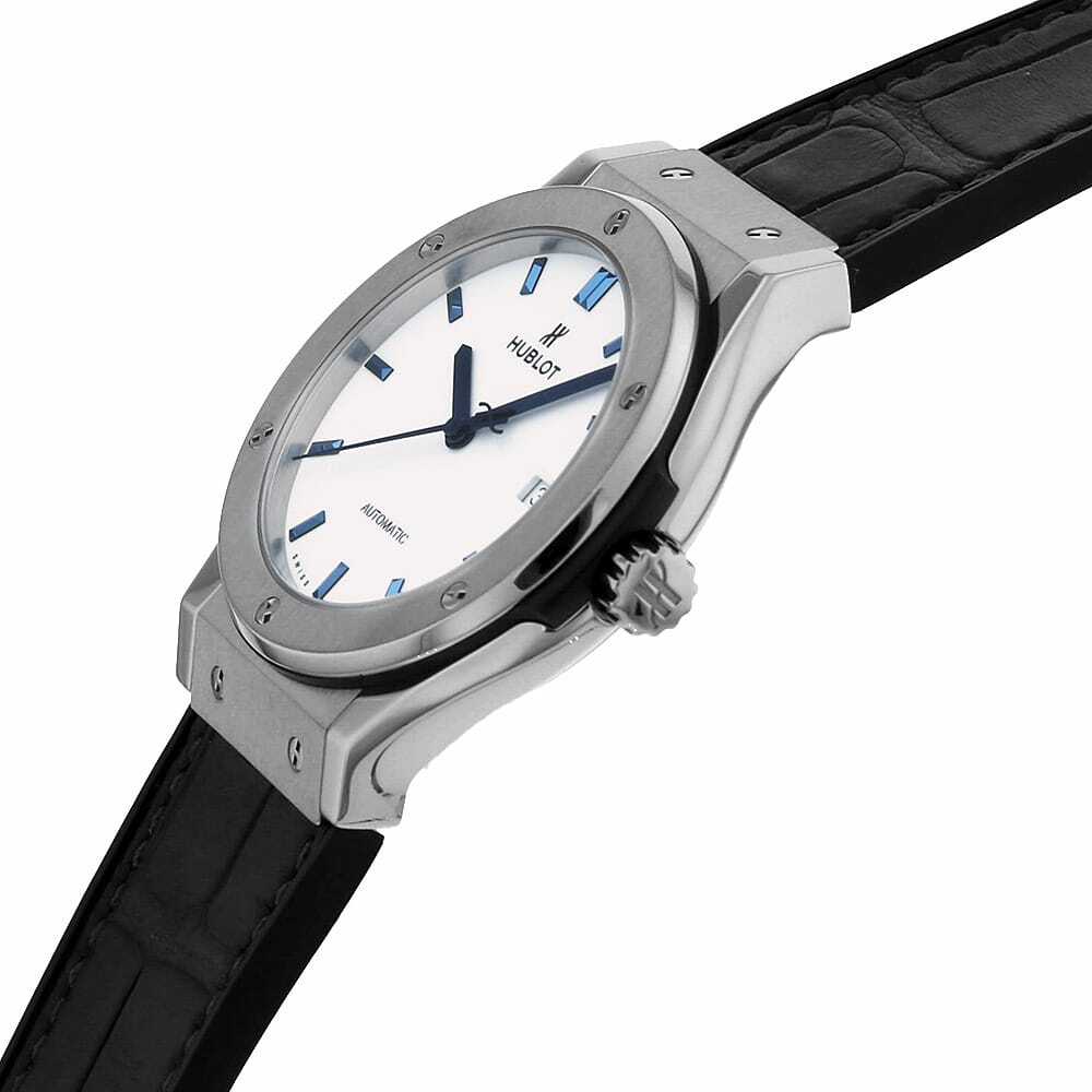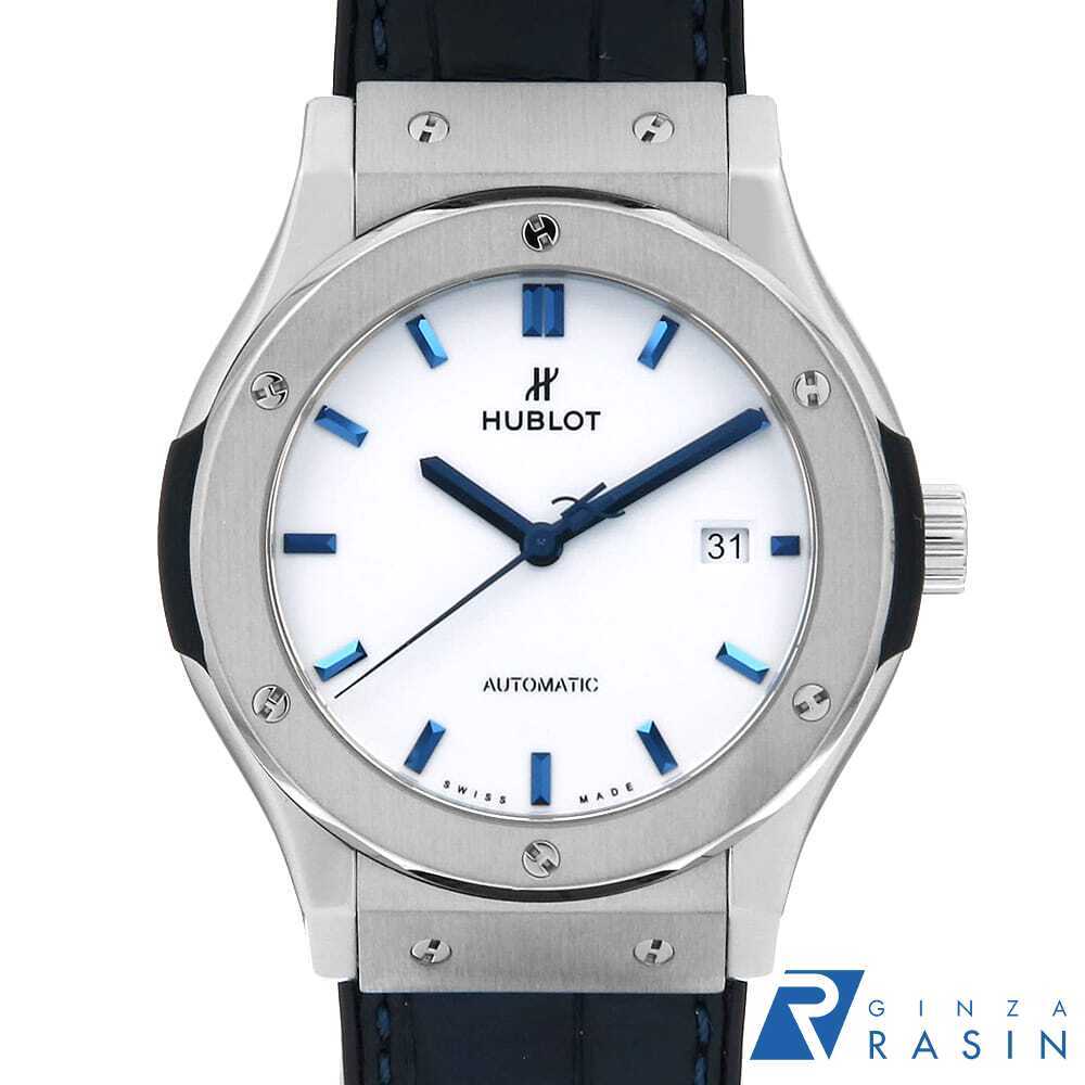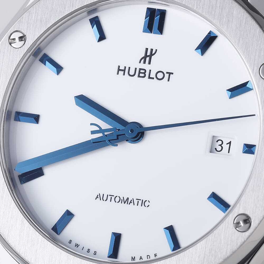 | モデル情報 | 大ヒット作ビッグバンから始まったウブロの新しいコンセプトクラシックフュージョン。こちらはブルーのインデックスと三針が美しく映える、艶やかなラッカーを用いたホワイト文字盤の日本限定モデルです。端正なデザインながらも衝撃に強いチタンを使用しているため、エレガントさとスポーティーな雰囲気を両立しています。自動巻きCal.HUB1100を搭載。パワーリザーブ約42時間。5気圧防水。 |