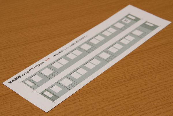 カトー クモハ12-052の車内側坂を雰囲気重視でPCにて制作しオフセット印刷した物で、車体とガラスパーツの間に挟みます。薄手のコート紙(73kg)を使用し、車体と窓枠の段差が気にならない様にしました。他の商品を同時落札された場合、同梱発送致しますので「まとめて依頼」お願いいたします。ご連絡、発送が遅くなると場合がありますがよろしくお願いいたします。