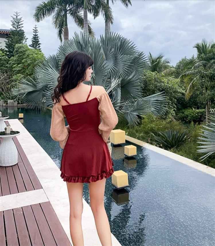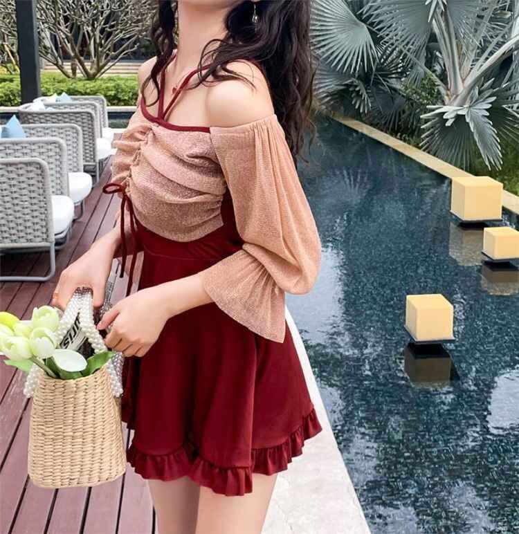 水着 かわいい スリム カバー オフショルダー ワンピース 長袖 L レッド