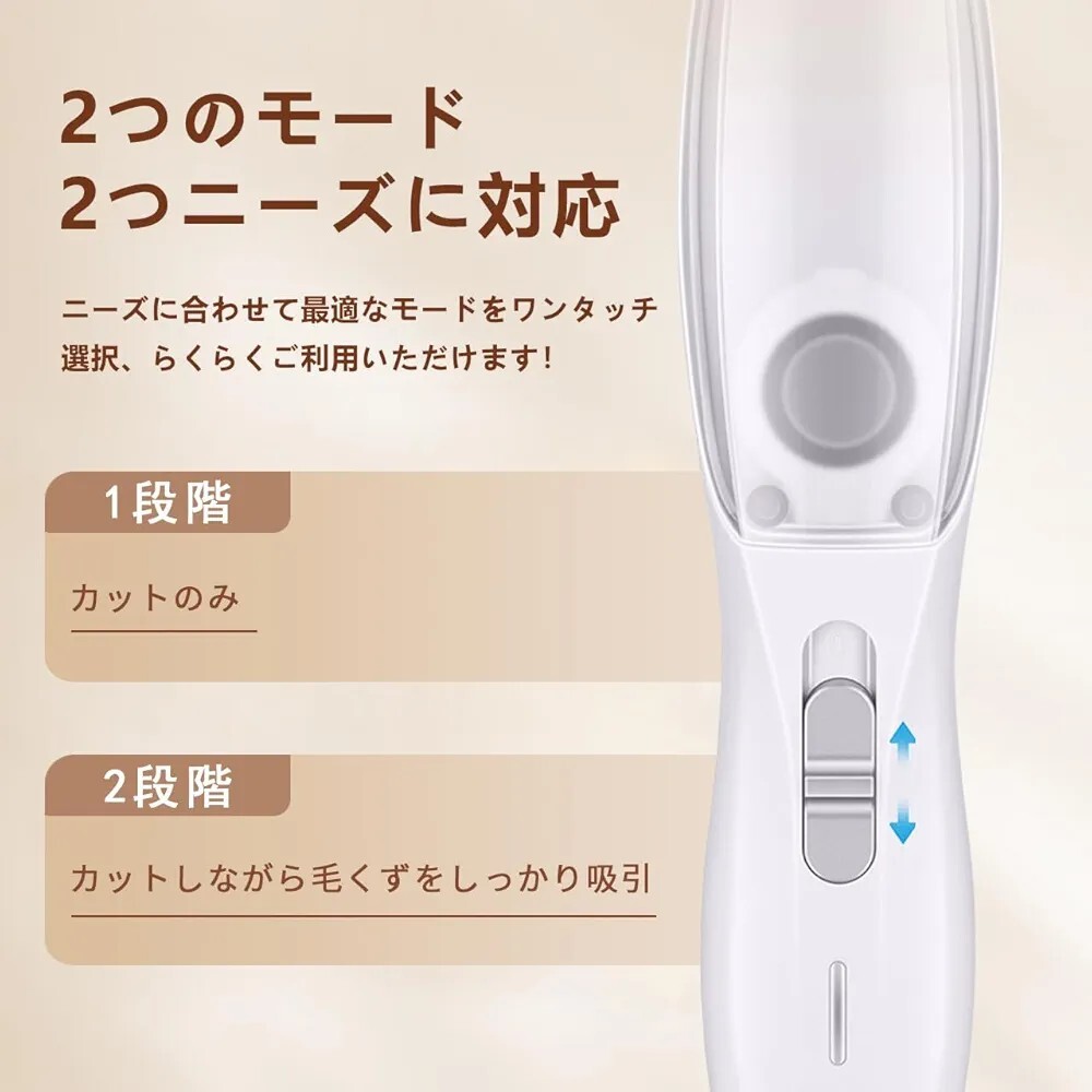 【掃除機一体型で毛が飛び散らない】 トリミングしながら毛をしっかり吸引できる、掃除機一体型ペット用バリカンです。内蔵の渦流モーターが刈り取った毛を素早く吸い取り、毛クズの飛散を防止。周囲が汚れにくいため、後片付けがぐっとラクになります。自宅でも清潔なトリミング環境を整えたい方に最適です。