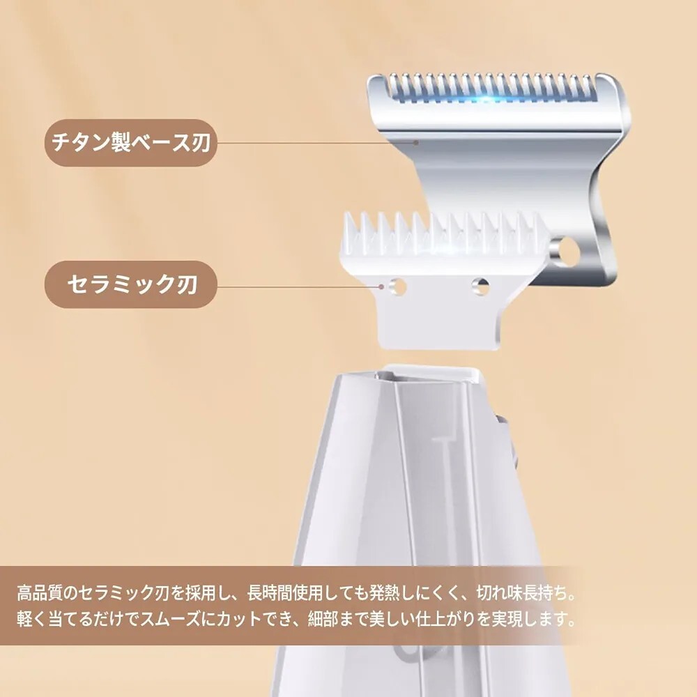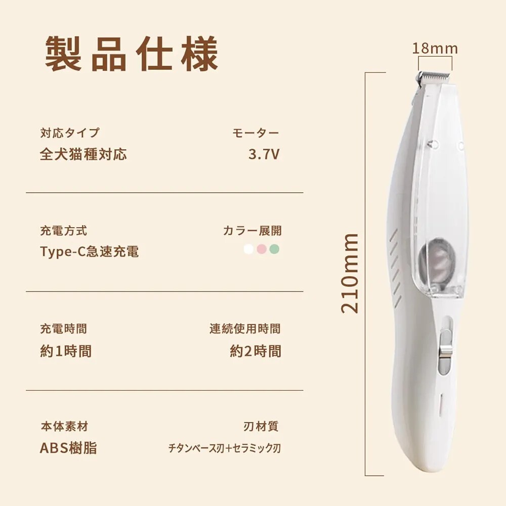 【軽量コンパクトで自宅トリミングに最適】 本体は約21×3×3cm、わずか131gの軽量設計。手や腕に負担がかかりにくく、長時間使用しても疲れにくいサイズ感です。足裏のトリミングから皮膚チェックまで自宅で手軽にケアでき、ペットの健康と清潔をしっかりサポートします。セット内容:本体×1、掃除用ブラシ×1、お手入れ用潤滑油ボトル×1、Type-Cケーブル×1、取扱説明書×1。