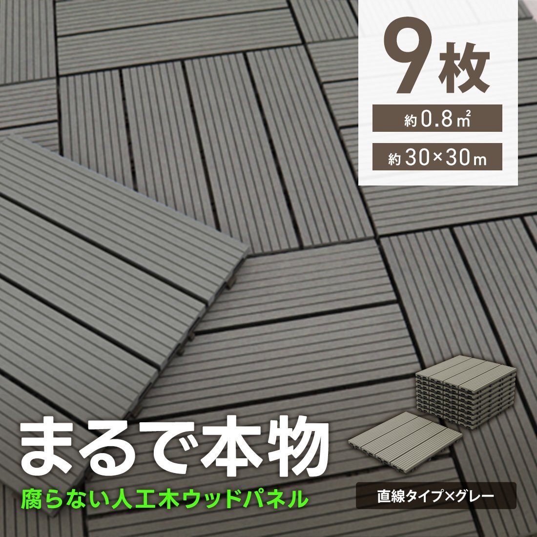 | パズルみたいにサイドの凹凸を繋ぎ合わせるだけで簡単に施工が出来るジョイント式ウッドタイル! ベランダの雰囲気を変えたり劣化してきたベランダの修復に最適! 雨や日差しによる劣化に強く耐腐食性もある人工木を使用。 55%の天然木粉と45%の樹脂で出来ており、天然木製と比べると定期的なお手入れも不要! 小さなお子様やペットにも安心。さらっとした感触でささくれや釘による怪我の心配もなし。 安全に長期間使用できる優れものです! 【商品詳細】 カラー:グレー(直線タイプ) 表面のサイズ(約):幅29.5cm×長さ29.5cm×高さ2cm ジョイント部分も含んだサイズ(約):幅30.5cm×長さ30.5cm×高さ2cm 表面隙間:5mm 重量(約):0.9kg 圧力強度:3000N 材質:WPC素材(木材・プラスチック複合材) 表面・・・人工木(天然木の木粉55%入り) 裏面・・・ポリプロピレン樹脂 【商品内容】 ウッドパネル × 9 |