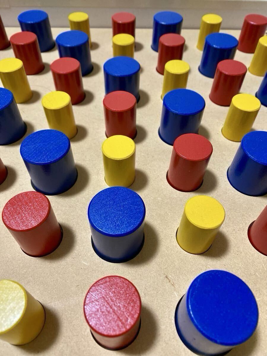 ●ペグボードは、縦横7列、大中小の異なる太さのペグボード