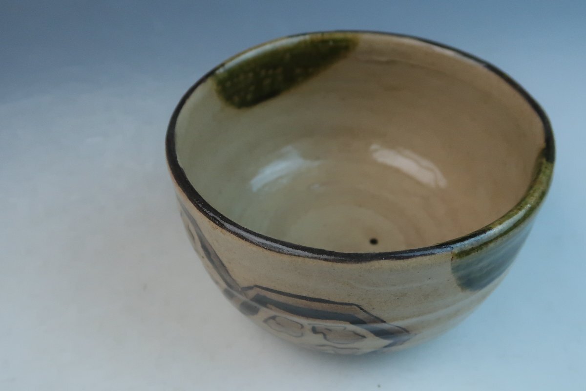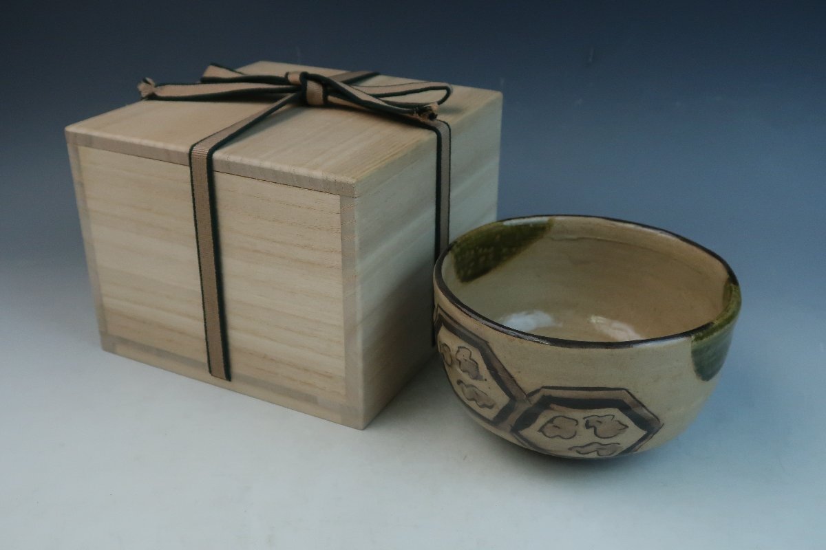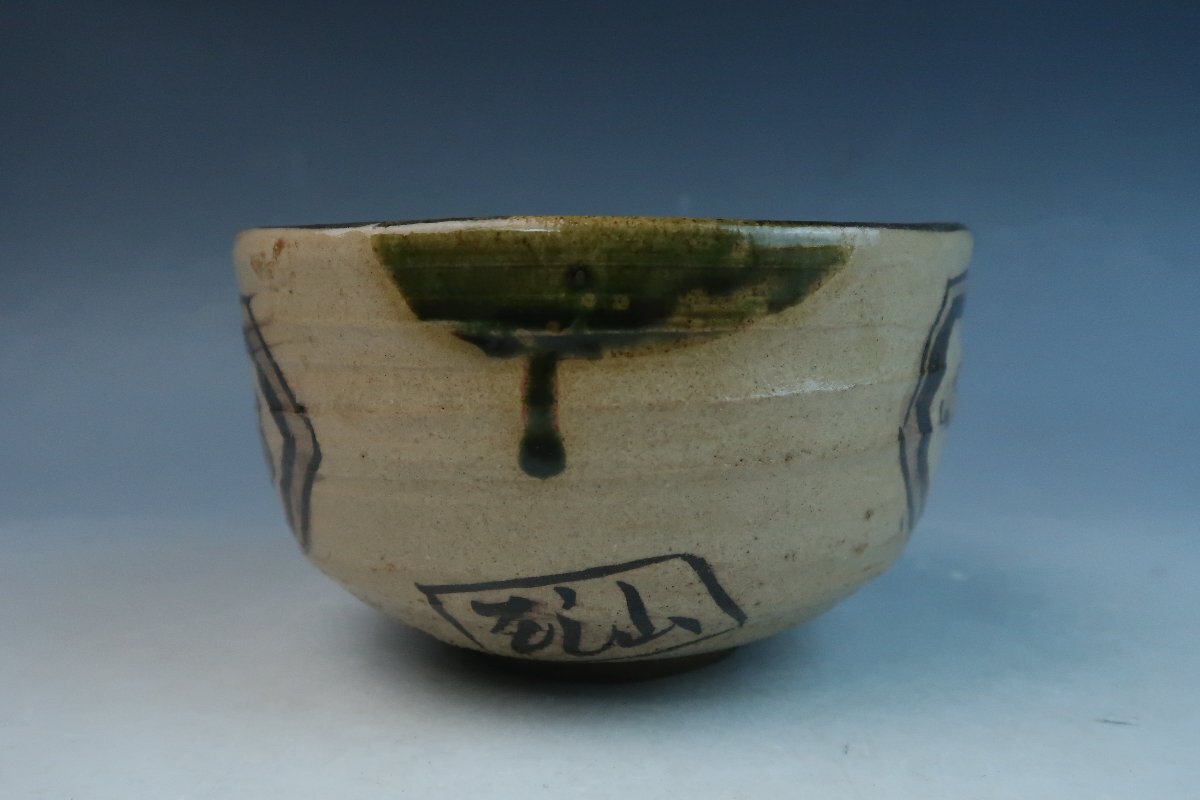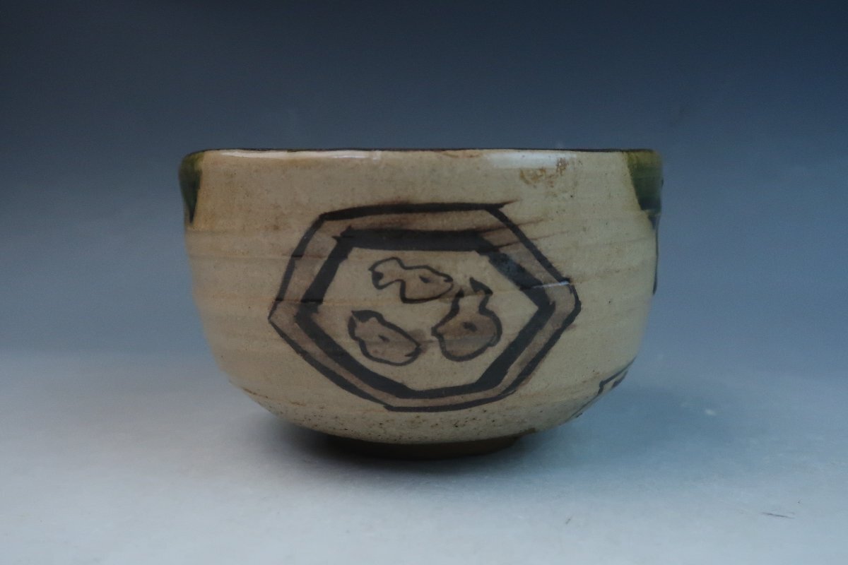 時代物の京焼の乾山写しの茶碗です。織部釉に鉄絵の亀甲文の織部風の絵付けが味わい深い御茶碗です。