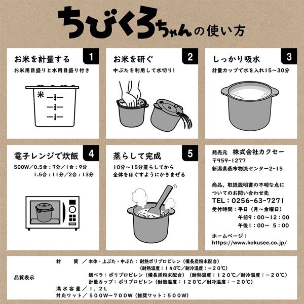 | 少量のごはんが早くおいしく炊ける 「備長炭入りちびくろちゃん」は少量のごはんを電子レンジで おいしく炊くのに便利!ごはんを炊き忘れたときに便利です。 0.5合から2合まで炊け、炊き上がりもふっくら♪ 2合まで炊ける容量があり、おかゆも作れます。 会社にレンジがあれば、会社でごはんを炊くことも可能♪ 無洗米をストックしておいて、必要な時にレンジでチンすれば、 いつも炊きたてご飯が食べれます。 手早く炊けて、節電にもなる 計量カップとしゃもじ付き |
