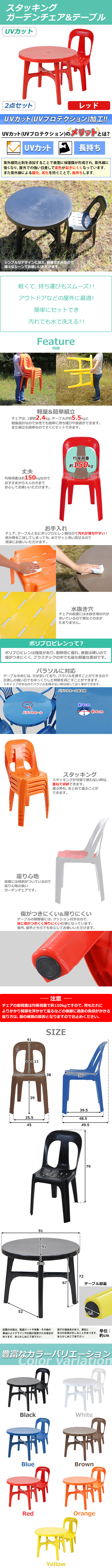 ●UVカット加工によって屋外での強い日差しで変色しにくくなっています。 ●紫外線による酸化、劣化を防ぐことにより、長持ちする作りになっています。 ●ガーデンチェアは、スタッキング構造なので重ねる事が可能なので、収納やまとめて運ぶ際にも大変便利です。 ●テーブル中央にパラソルなど、設置可能な穴があります。 ●テーブルは、簡単な組み立て式になります。チェアは、完成品です。 ●チェアは1脚約2.4kg、テーブルは約5.5kgと軽量なので、女性でも軽々持ち運べます。 ●材質は、軽量、安全、防水のポリプロピレン(PP)です。 注意! 背もたれによりかかり前脚を浮かせて座るなどの後脚に過度の負担がかかる座り方は脚の破損の原因となりますのでお止めください。 ■重量(チェア):約2.4kg(1脚あたり) ■耐荷重(チェア):約150kg(1脚あたり) ■重量(テーブル):約5.5kg ■耐荷重(テーブル):約100kg ■材質:PP[ポリプロピレン](チェア、テーブル)、PVC(テーブル脚裏) ●商品のカラーはレッドとなります。 ●新品商品ではありますが、輸入商品の為、多少の擦り傷などがある場合がございますので、ご納得の上ご購入下さいませ。 ●ご購入後、お客様ご都合によるご返品、ご返金等は一切お受け致しておりません。 ●本商品を使用した際に発生したトラブル、事故につきまして、当社は一切の責任を負いません。ご使用に関しましては、全て自己責任にてお願い致します。 |